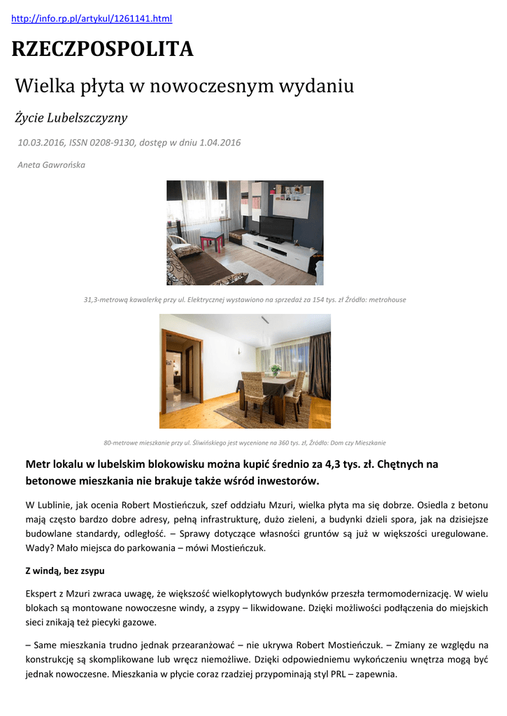 http://info.rp.pl/artykul/1261141.html RZECZPOSPOLITA Wielka płyta w nowoczesnym wydaniu Życie Lubelszczyzny 10.03.2016, ISSN 0208-9130, dostęp w dniu 1.04.2016 Aneta Gawrońska 31,3-metrową kawalerkę przy ul. Elektrycznej wystawiono na sprzedaż za 154 tys. zł Źródło: metrohouse 80-metrowe mieszkanie przy ul. Śliwińskiego jest wycenione na 360 tys. zł, Źródło: Dom czy Mieszkanie Metr lokalu w lubelskim blokowisku można kupić średnio za 4,3 tys. zł. Chętnych na betonowe mieszkania nie brakuje także wśród inwestorów. W Lublinie, jak ocenia Robert Mostieńczuk, szef oddziału Mzuri, wielka płyta ma się dobrze. Osiedla z betonu mają często bardzo dobre adresy, pełną infrastrukturę, dużo zieleni, a budynki dzieli spora, jak na dzisiejsze budowlane standardy, odległość. – Sprawy dotyczące własności gruntów są już w większości uregulowane. Wady? Mało miejsca do parkowania – mówi Mostieńczuk. Z windą, bez zsypu Ekspert z Mzuri zwraca uwagę, że większość wielkopłytowych budynków przeszła termomodernizację. W wielu blokach są montowane nowoczesne windy, a zsypy – likwidowane. Dzięki możliwości podłączenia do miejskich sieci znikają też piecyki gazowe. – Same mieszkania trudno jednak przearanżować – nie ukrywa Robert Mostieńczuk. – Zmiany ze względu na konstrukcję są skomplikowane lub wręcz niemożliwe. Dzięki odpowiedniemu wykończeniu wnętrza mogą być jednak nowoczesne. Mieszkania w płycie coraz rzadziej przypominają styl PRL – zapewnia. Mzuri zajmuje się wynajmowaniem mieszkań i zakupami nieruchomości na wynajem. – Klienci nie rezygnują z wynajęcia mieszkania lub zainwestowania w lokal ze względu na technologię budowy – podkreśla Mostieńczuk. – Popyt na wielkopłytowe mieszkania jest stabilny. Poszukują ich rodziny z dziećmi, osoby chcące mieć osiedlowe sklepy, przychodnie, szkoły i przedszkola w zasięgu ręki. Doceniają je także klienci chcący mieszkać w centrum – opowiada. Stawki najmu na betonowych osiedlach, jak podaje Robert Mostieńczuk, są takie same jak w budynkach stawianych w innych technologiach. – Ceny zakupu są zaś nieco niższe, co podwyższa atrakcyjność inwestycji w takie nieruchomości – podkreśla. Zdaniem Mostieńczuka ceny wielkopłytowych lokali są związane z wysokością budynków. – Wieżowce na dużych osiedlach są zazwyczaj z płyty. A wiele osób preferuje niskie budownictwo – wyjaśnia. I dodaje, że zastanawiając się nad trwałością konstrukcji, pod uwagę trzeba wziąć mnogość rozwiązań. – Tymczasem wszystko wrzuca się do jednego worka z etykietą „wielka płyta". A przecież jest kilkanaście rodzajów systemów plus wiele wariantów – podkreśla Mostieńczuk. – W Lublinie stosowano kilka z nich. Generalizowanie, że bloki z wielkiej płyty postoją tyle a tyle lat, bez specjalistycznych badań osiedli, wydaje się zbyt dużym uproszczeniem. Bo nie ma innych Sławomir Horbaczewski, ekspert rynku nieruchomości, zwraca uwagę, że w Polsce jest wiele miast, gdzie wielka płyta stanowi podstawę lokalnej oferty. – Z uwagi na ograniczony popyt ani spółdzielnie mieszkaniowe, ani deweloperzy nie są zainteresowani inwestowaniem na takich rynkach, dlatego też klienci są zdani na wielkopłytowe budownictwo z lat 70. i 80. – podkreśla Sławomir Horbaczewski. – W Lublinie oferta mieszkań jest zróżnicowana – zauważa. Dużo mieszkań z wielkiej płyty znajduje się w dzielnicach Czechów, Kalinowszczyzna, Czuby, LSM. – Znajdziemy też wiele mieszkań w kamienicach oraz w nowszych blokach z lat 90. i późniejszych – opowiada ekspert rynku nieruchomości. Z jego analiz wynika, że największą popularnością na rynku wielkopłytowych mieszkań cieszą się takie same metraże jak w nowoczesnym budownictwie. – To dwu- i trzypokojowe lokale od 40 do 60 mkw. – wskazuje Sławomir Horbaczewski. Betonowe mieszkania kupują nie tylko klienci ze stosunkowo niedużym budżetem. – To prawda, że wielu wybiera wielką płytę ze względu na konkurencyjną cenę – przyznaje. – Ale znaczna część kupujących decyduje się na takie nieruchomości ze względu na ich lokalizację, dobrą komunikację, bliskość sklepów, szkół, ośrodków zdrowia, parków – zauważa Horbaczewski. Dodaje, że wielu inwestorów wybiera mieszkania w wielkopłytowych budynkach w Lublinie z myślą o ich wynajmie studentom. – W tym akademickim mieście ta grupa klientów w dużym stopniu generuje popyt na rynku wtórnym – zauważa ekspert. – A że bloki z betonu mają dobre adresy, chętnych na wynajem nie brakuje – podkreśla. Z analiz sieciowej agencji Metrohouse wynika, że ceny transakcyjne mkw. w lubelskiej płycie wahają się od 3,1 do 5,8 tys. zł. Średnia to niespełna 4,4 tys. zł za mkw. Średni metraż kupowanych lokali to 51 mkw. W Warszawie ceny transakcyjne betonowych lokali to 4,3–8,5 tys. zł za mkw., a przecięta powierzchnia kupowanych mieszkań to 50 mkw.