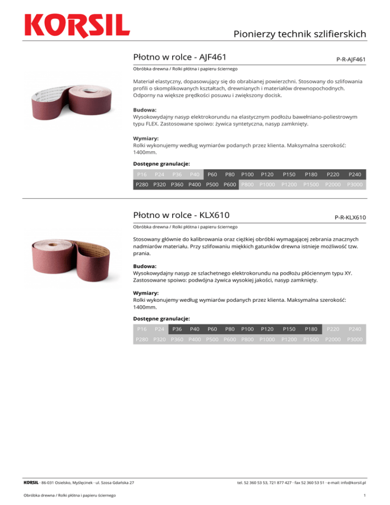 KORSIL Pionierzy technik szlifierskich Płotno w rolce - AJF461 P-R-AJF461 Obróbka drewna / Rolki płótna i papieru ściernego Materiał elastyczny, dopasowujący się do obrabianej powierzchni. Stosowany do szlifowania profili o skomplikowanych kształtach, drewnianych i materiałów drewnopochodnych. Odporny na większe prędkości posuwu i zwiększony docisk. Budowa: Wysokowydajny nasyp elektrokorundu na elastycznym podłożu bawełniano-poliestrowym typu FLEX. Zastosowane spoiwo: żywica syntetyczna, nasyp zamknięty. Wymiary: Rolki wykonujemy według wymiarów podanych przez klienta. Maksymalna szerokość: 1400mm. Dostępne granulacje: P16 P24 P36 P40 P60 P80 P100 P120 P150 P180 P220 P240 P280 P320 P360 P400 P500 P600 P800 P1000 P1200 P1500 P2000 P3000 Płotno w rolce - KLX610 P-R-KLX610 Obróbka drewna / Rolki płótna i papieru ściernego Stosowany głównie do kalibrowania oraz ciężkiej obróbki wymagającej zebrania znacznych nadmiarów materiału. Przy szlifowaniu miękkich gatunków drewna istnieje możliwość tzw. prania. Budowa: Wysokowydajny nasyp ze szlachetnego elektrokorundu na podłożu płóciennym typu XY. Zastosowane spoiwo: podwójna żywica wysokiej jakości, nasyp zamknięty. Wymiary: Rolki wykonujemy według wymiarów podanych przez klienta. Maksymalna szerokość: 1400mm. Dostępne granulacje: P16 KORSIL · 86-031 Osielsko, Myślęcinek · ul. Szosa Gdańska 27 Obróbka drewna / Rolki płótna i papieru ściernego P24 P36 P40 P60 P80 P100 P120 P150 P180 P220 P240 P280 P320 P360 P400 P500 P600 P800 P1000 P1200 P1500 P2000 P3000 tel. 52 360 53 53, 721 877 427 · fax 52 360 53 51 · e-mail: [email protected] 1 KORSIL Pionierzy technik szlifierskich Płotno w rolce - CYRKON P-R-PZ Obróbka drewna / Rolki płótna i papieru ściernego Stosowany głównie do kalibrowania oraz ciężkiej obróbki wymagającej zebrania znacznych nadmiarów materiału. Przy szlifowaniu miękkich gatunków drewna istnieje możliwość tzw. prania. Budowa: Wysokowydajny nasyp ze szlachetnego elektrokorundu cyrkonowego na podłożu płóciennym typu X. Zastosowane spoiwo: podwójna żywica wysokiej jakości, nasyp cyrkonowy samoostrzący. Wymiary: Rolki wykonujemy według wymiarów podanych przez klienta. Maksymalna szerokość: 1350mm. Dostępne granulacje: P16 P24 P36 P40 P60 P80 P100 P120 P150 P180 P220 P240 P280 P320 P360 P400 P500 P600 P800 P1000 P1200 P1500 P2000 P3000 Płotno w rolce - NACINANE P-R-NAC Obróbka drewna / Rolki płótna i papieru ściernego .Stosowane głównie do obróbki wykańczającej elementów toczonych, profilowanych o skomplikowanych kształtach. Dzięki nacięciom doskonale dostosowuje się do kształtu obrabianego elementu. Znajduje zastosowanie również jako wkład do bębnów (głowic) szlifierskich, tzw. szczotkarek. Budowa: Wysokowydajny nasyp elektrokorundu (aluminium oxide) na podłożu płóciennym typu FLEX. Zastosowane spoiwo: podwójna żywica. Wzdłużne nacięcia. Wymiary: Rolki wykonujemy według wymiarów podanych przez klienta. Maksymalna szerokość: 300mm. Dostępne granulacje: P16 KORSIL · 86-031 Osielsko, Myślęcinek · ul. Szosa Gdańska 27 Obróbka drewna / Rolki płótna i papieru ściernego P24 P36 P40 P60 P80 P100 P120 P150 P180 P220 P240 P280 P320 P360 P400 P500 P600 P800 P1000 P1200 P1500 P2000 P3000 tel. 52 360 53 53, 721 877 427 · fax 52 360 53 51 · e-mail: [email protected] 2 KORSIL Pionierzy technik szlifierskich Papier w rolce - typ GOLD P-R-006 Obróbka drewna / Rolki płótna i papieru ściernego Polecany głównie do materiałów drewnopochodnych - MDF, fornirów, itp. Głównie do szlifowania wykańczającego. Przydatny szczególnie tam, gdzie występują trudności z równomiernym wyszlifowaniem całych powierzchni (starsze maszyny) i występowaniem przeszlifów itp. Idealnie układa się na obrabianym elemencie. Budowa: Wysokowydajny nasyp elektrokorundu (aluminium oxide) antystatycznego na podłożu papierowym typu E. Zastosowane spoiwo: żywica na kleju. Wymiary: Pasy wykonujemy według wymiarów podanych przez klienta. Maksymalna szerokość: 1400mm Dostępne granulacje: P16 P24 P36 P40 P60 P80 P100 P120 P150 P180 P220 P240 P280 P320 P360 P400 P500 P600 P800 P1000 P1200 P1500 P2000 P3000 Papier w rolce - RSAS P-R-RSAS Obróbka drewna / Rolki płótna i papieru ściernego Stosowany przy szlifowaniu lakierów, fornirów, drewna, tworzyw sztucznych. Do szlifowania wykańczającego przy obróbce ręcznej. Znajduje zastosowanie przy obróbce drewna, tworzyw sztucznych, a także w przemyśle samochodowym. Budowa: Wysokowydajny nasyp korundowy na delikatnym podłożu papierowym typu A. Zastosowane spoiwo: żywica na kleju, nasyp półotwarty z domieszką stearyny. Wymiary: Rolki wykonujemy według wymiarów podanych przez klienta. Maksymalna szerokość: 940mm. Dostępne granulacje: P16 KORSIL · 86-031 Osielsko, Myślęcinek · ul. Szosa Gdańska 27 Obróbka drewna / Rolki płótna i papieru ściernego P24 P36 P40 P60 P80 P100 P120 P150 P180 P220 P240 P280 P320 P360 P400 P500 P600 P800 P1000 P1200 P1500 P2000 P3000 tel. 52 360 53 53, 721 877 427 · fax 52 360 53 51 · e-mail: [email protected] 3 KORSIL Pionierzy technik szlifierskich Papier w rolce - do obróbki mechanicznej P-R-MECH Obróbka drewna / Rolki płótna i papieru ściernego Oferujemy szeroką gamę papierów ściernych do obróbki mechanicznej i ręcznej w postaci rolek. Rolki docinamy na dowolną szerokość i długość wg zamówienia klienta. W celu doboru właściwego materiału prosimy o kontakt z działem handlowym lub zapoznanie się z opisem w dziale pasy ścierne. Budowa: Wysokowydajny nasyp elektrokorundu (aluminium oxide) lub węglika krzemu (silicon carbide) na podłożu papierowym. Wymiary: Pasy wykonujemy według wymiarów podanych przez klienta. Maksymalna szerokość: 1400mm Dostępne granulacje: P16 KORSIL · 86-031 Osielsko, Myślęcinek · ul. Szosa Gdańska 27 Obróbka drewna / Rolki płótna i papieru ściernego P24 P36 P40 P60 P80