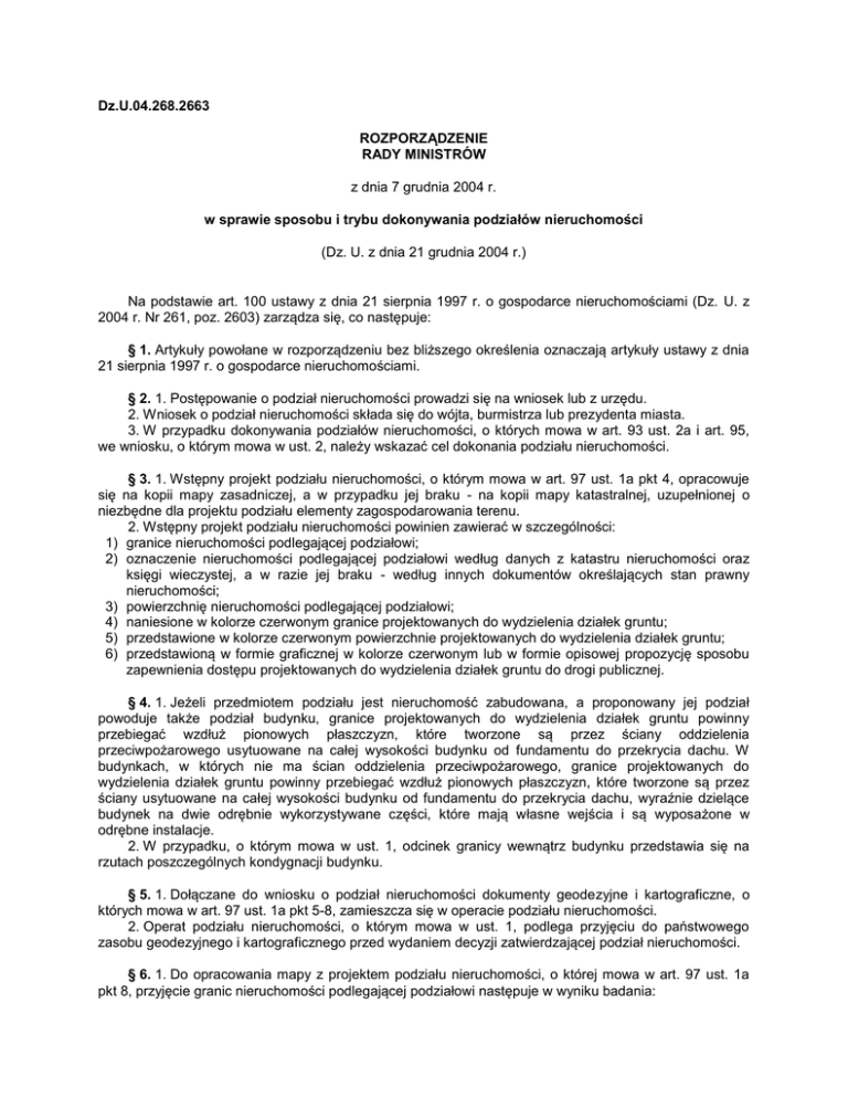 Dz.U.04.268.2663 ROZPORZĄDZENIE RADY MINISTRÓW z dnia 7 grudnia 2004 r. w sprawie sposobu i trybu dokonywania podziałów nieruchomości (Dz. U. z dnia 21 grudnia 2004 r.) Na podstawie art. 100 ustawy z dnia 21 sierpnia 1997 r. o gospodarce nieruchomościami (Dz. U. z 2004 r. Nr 261, poz. 2603) zarządza się, co następuje: § 1. Artykuły powołane w rozporządzeniu bez bliższego określenia oznaczają artykuły ustawy z dnia 21 sierpnia 1997 r. o gospodarce nieruchomościami. § 2. 1. Postępowanie o podział nieruchomości prowadzi się na wniosek lub z urzędu. 2. Wniosek o podział nieruchomości składa się do wójta, burmistrza lub prezydenta miasta. 3. W przypadku dokonywania podziałów nieruchomości, o których mowa w art. 93 ust. 2a i art. 95, we wniosku, o którym mowa w ust. 2, należy wskazać cel dokonania podziału nieruchomości. § 3. 1. Wstępny projekt podziału nieruchomości, o którym mowa w art. 97 ust. 1a pkt 4, opracowuje się na kopii mapy zasadniczej, a w przypadku jej braku - na kopii mapy katastralnej, uzupełnionej o niezbędne dla projektu podziału elementy zagospodarowania terenu. 2. Wstępny projekt podziału nieruchomości powinien zawierać w szczególności: 1) granice nieruchomości podlegającej podziałowi; 2) oznaczenie nieruchomości podlegającej podziałowi według danych z katastru nieruchomości oraz księgi wieczystej, a w razie jej braku - według innych dokumentów określających stan prawny nieruchomości; 3) powierzchnię nieruchomości podlegającej podziałowi; 4) naniesione w kolorze czerwonym granice projektowanych do wydzielenia działek gruntu; 5) przedstawione w kolorze czerwonym powierzchnie projektowanych do wydzielenia działek gruntu; 6) przedstawioną w formie graficznej w kolorze czerwonym lub w formie opisowej propozycję sposobu zapewnienia dostępu projektowanych do wydzielenia działek gruntu do drogi publicznej. § 4. 1. Jeżeli przedmiotem podziału jest nieruchomość zabudowana, a proponowany jej podział powoduje także podział budynku, granice projektowanych do wydzielenia działek gruntu powinny przebiegać wzdłuż pionowych płaszczyzn, które tworzone są przez ściany oddzielenia przeciwpożarowego usytuowane na całej wysokości budynku od fundamentu do przekrycia dachu. W budynkach, w których nie ma ścian oddzielenia przeciwpożarowego, granice projektowanych do wydzielenia działek gruntu powinny przebiegać wzdłuż pionowych płaszczyzn, które tworzone są przez ściany usytuowane na całej wysokości budynku od fundamentu do przekrycia dachu, wyraźnie dzielące budynek na dwie odrębnie wykorzystywane części, które mają własne wejścia i są wyposażone w odrębne instalacje. 2. W przypadku, o którym mowa w ust. 1, odcinek granicy wewnątrz budynku przedstawia się na rzutach poszczególnych kondygnacji budynku. § 5. 1. Dołączane do wniosku o podział nieruchomości dokumenty geodezyjne i kartograficzne, o których mowa w art. 97 ust. 1a pkt 5-8, zamieszcza się w operacie podziału nieruchomości. 2. Operat podziału nieruchomości, o którym mowa w ust. 1, podlega przyjęciu do państwowego zasobu geodezyjnego i kartograficznego przed wydaniem decyzji zatwierdzającej podział nieruchomości. § 6. 1. Do opracowania mapy z projektem podziału nieruchomości, o której mowa w art. 97 ust. 1a pkt 8, przyjęcie granic nieruchomości podlegającej podziałowi następuje w wyniku badania: 1) księgi wieczystej nieruchomości podlegającej podziałowi oraz innych dokumentów określających stan prawny nieruchomości; 2) danych wykazanych w katastrze nieruchomości. 2. W przypadku stwierdzenia niezgodności danych, o których mowa w ust. 1 pkt 2, z danymi wykazanymi w dokumentach, o których mowa w ust. 1 pkt 1, granice nieruchomości podlegającej podziałowi przyjmuje się na podstawie danych wykazanych w dokumentach, o których mowa w ust. 1 pkt 1. 3. W przypadku braku dokumentów, o których mowa w ust. 1 pkt 1, granice nieruchomości podlegającej podziałowi przyjmuje się na podstawie danych, o których mowa w ust. 1 pkt 2. 4. W przypadku, o którym mowa w ust. 3, o czynnościach przyjęcia granic zawiadamia się właściciela bądź użytkownika wieczystego nieruchomości podlegającej podziałowi oraz właścicieli bądź użytkowników wieczystych nieruchomości sąsiadujących z nieruchomością podlegającą podziałowi, a w przypadku braku danych o tych osobach - osoby władające tymi nieruchomościami. 5. Do zawiadomień, o których mowa w ust. 4, stosuje się odpowiednio przepisy dotyczące zawiadomień w postępowaniu o rozgraniczenie nieruchomości. § 7. 1. Z czynności przyjęcia granic nieruchomości podlegającej podziałowi sporządza się protokół, o którym mowa w art. 97 ust. 1a pkt 5. 2. Protokół, o którym mowa w ust. 1, zawiera w szczególności: 1) oznaczenie nieruchomości podlegającej podziałowi według danych z katastru nieruchomości oraz księgi wieczystej, a w razie jej braku - według innych dokumentów określających stan prawny nieruchomości; 2) informacje o dokumentach stanowiących podstawę przyjęcia granic nieruchomości podlegającej podziałowi; 3) szkic przebiegu granic nieruchomości podlegającej podziałowi; 4) opis przebiegu granic i położenia punktów granicznych nieruchomości podlegającej podziałowi; 5) datę sporządzenia protokołu oraz imię i nazwisko, numer uprawnień zawodowych i podpis osoby, która wykonała protokół. 3. W przypadku, o którym mowa w § 6 ust. 3, protokół, o którym mowa w ust. 1, zawiera dane wymienione w ust. 2 oraz listę i podpisy osób obecnych przy czynnościach przyjęcia granic. § 8. 1. Jeżeli podział nieruchomości polega na wydzieleniu działki o powierzchni do 33 % powierzchni nieruchomości podlegającej podziałowi, przepisy § 6-7 stosuje się tylko do tych odcinków granic nieruchomości, do których dochodzą projektowane granice podziału. 2. Przez odcinek granicy nieruchom