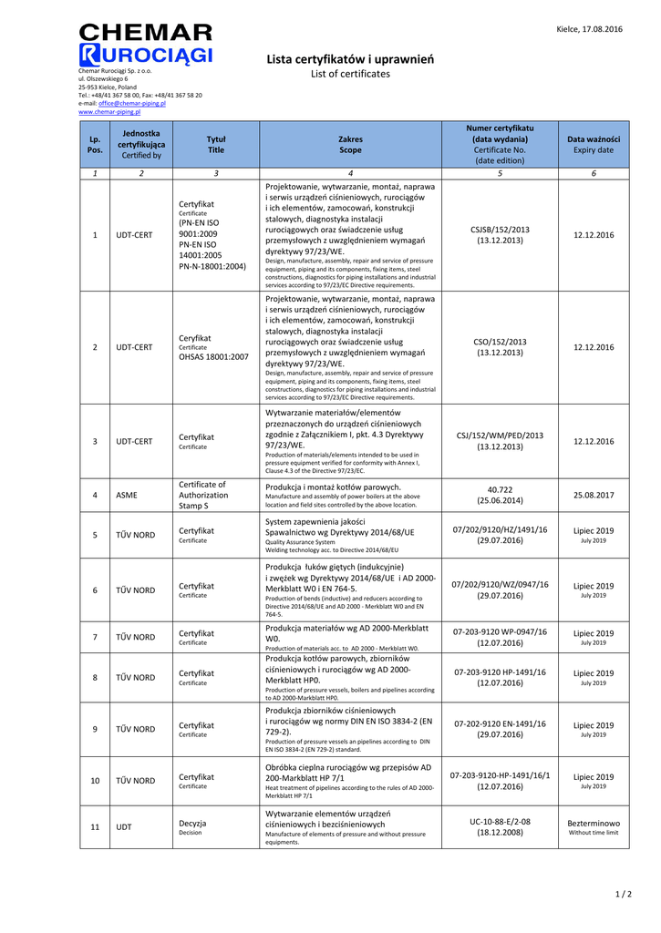 Kielce, 17.08.2016 Lista certyfikatów i uprawnień Chemar Rurociągi Sp. z o.o. ul. Olszewskiego 6 25-953 Kielce, Poland Tel.: +48/41 367 58 00, Fax: +48/41 367 58 20 e-mail: [email protected] www.chemar-piping.pl List of certificates Lp. Pos. Jednostka certyfikująca Certified by Tytuł Title Zakres Scope 1 2 3 4 Projektowanie, wytwarzanie, montaż, naprawa i serwis urządzeń ciśnieniowych, rurociągów i ich elementów, zamocowań, konstrukcji stalowych, diagnostyka instalacji rurociągowych oraz świadczenie usług przemysłowych z uwzględnieniem wymagań dyrektywy 97/23/WE. Certyfikat Certificate 1 UDT-CERT (PN-EN ISO 9001:2009 PN-EN ISO 14001:2005 PN-N-18001:2004) Ceryfikat 2 UDT-CERT Certificate OHSAS 18001:2007 Numer certyfikatu (data wydania) Certificate No. (date edition) 5 Data ważności Expiry date 6 CSJSB/152/2013 (13.12.2013) 12.12.2016 CSO/152/2013 (13.12.2013) 12.12.2016 CSJ/152/WM/PED/2013 (13.12.2013) 12.12.2016 40.722 (25.06.2014) 25.08.2017 07/202/9120/HZ/1491/16 (29.07.2016) Lipiec 2019 07/202/9120/WZ/0947/16 (29.07.2016) Lipiec 2019 07-203-9120 WP-0947/16 (12.07.2016) Lipiec 2019 07-203-9120 HP-1491/16 (12.07.2016) Lipiec 2019 07-202-9120 EN-1491/16 (29.07.2016) Lipiec 2019 07-203-9120-HP-1491/16/1 (12.07.2016) Lipiec 2019 UC-10-88-E/2-08 (18.12.2008) Bezterminowo Design, manufacture, assembly, repair and service of pressure equipment, piping and its components, fixing items, steel constructions, diagnostics for piping installations and industrial services according to 97/23/EC Directive requirements. Projektowanie, wytwarzanie, montaż, naprawa i serwis urządzeń ciśnieniowych, rurociągów i ich elementów, zamocowań, konstrukcji stalowych, diagnostyka instalacji rurociągowych oraz świadczenie usług przemysłowych z uwzględnieniem wymagań dyrektywy 97/23/WE. Design, manufacture, assembly, repair and service of pressure equipment, piping and its components, fixing items, steel constructions, diagnostics for piping installations and industrial services according to 97/23/EC Directive requirements. 3 UDT-CERT Certyfikat Certificate Wytwarzanie materiałów/elementów przeznaczonych do urządzeń ciśnieniowych zgodnie z Załącznikiem I, pkt. 4.3 Dyrektywy 97/23/WE. Production of materials/elements intended to be used in pressure equipment verified for conformity with Annex I, Clause 4.3 of the Directive 97/23/EC. 4 ASME Certificate of Authorization Stamp S 5 TŰV NORD Certyfikat 6 7 8 TŰV NORD TŰV NORD TŰV NORD Certificate Certyfikat Certificate Certyfikat Certificate Certyfikat Certificate Produkcja i montaż kotłów parowych. Manufacture and assembly of power boilers at the above location and field sites controlled by the above location. System zapewnienia jakości Spawalnictwo wg Dyrektywy 2014/68/UE Quality Assurance System Welding technology acc. to Directive 2014/68/EU Produkcja łuków giętych (indukcyjnie) i zwężek wg Dyrektywy 2014/68/UE i AD 2000Merkblatt W0 i EN 764-5. Production of bends (inductive) and reducers according to Directive 2014/68/UE and AD 2000 - Merkblatt W0 and EN 764-5. Produkcja materiałów wg AD 2000-Merkblatt W0. Production of materials acc. to AD 2000 - Merkblatt W0. Produkcja kotłów parowych, zbiorników ciśnieniowych i rurociągów wg AD 2000Merkblatt HP0. Production of pressure vessels, boilers and pipelines according to AD 2000-Markblatt HP0. 9 TŰV NORD Certyfikat Certificate Produkcja zbiorników ciśnieniowych i rurociągów wg normy DIN EN ISO 3834-2 (EN 729-2). Production of pressure vessels an pipelines according to DIN EN ISO 3834-2 (EN 729-2) standard. 10 TŰV NORD Certyfikat 11 UDT Decyzja Certificate Decision Obróbka cieplna rurociągów wg przepisów AD 200-Markblatt HP 7/1 Heat treatment of pipelines according to the rules of AD 2000Merkblatt HP 7/1 Wytwarzanie elementów urządzeń ciśnieniowych i bezciśnieniowych Manufacture of elements of pressure and without pressure equipments. July 2019 July 2019 July 2019 July 2019 July 2019 July 2019 Without time limit 1/2 Kielce, 17.08.2016 Lista certyfikatów i uprawnień Chemar Rurociągi Sp. z o.o. ul. Olszewskiego 6 25-953 Kielce, Poland Tel.: +48/41 367 58 00, Fax: +48/41 367 58 20 e-mail: [email protected] www.chemar-piping.pl Lp. Pos. 12 13 14 15 16 Jednostka certyfikująca Certified by UDT UDT UDT TŰV Rheinland TŰV Rheinland List of certificates Tytuł Title Decyzja Decision Decyzja Decision Certyfikat zgodności WE EC Certificate of conformity Certyfikat Certificate Certyfikat Certificate Zakres Scope Modernizacja rurociągów pary łączących kocioł z turbogeneratorem, rurociągów. przesyłowych, rurociągów technologicznych. Modernization of steam pipelines connecting the boiler with a turbo-generator, transfer pipelines and technological pipelines. Naprawa rurociągów pary łączących kocioł z turbogeneratorem, rurociągów przesyłowych, rurociągów technologicznych. Repair of steam pipelines connecting the boiler with a turbogenerator, transfer pipelines and technological pipelines. Chemar Rurociągi Sp. z o.o. spełnia wymagania modułu A1 w zakresie wytwarzania urządzeń ciśnieniowych Dyrektywy 97/23/WE i może znakować urządzenia tj. Rurociągi technologiczne numerem JN UDT-CERT: 1433 Chemar Rurociągi Sp. z o.o. fulfills the requirements of Module A1 for manufacturing of Pressure Equipment of Directive 97/23 EC and has license to mark equipment etc. Technological pipelines the number of Notified Body UDTCERT: 1433. Certyfikat Zgodności Dla Nadzoru Produkcji Certyfikat potwierdza, ze wszystkie zapewnienia dotyczące certyfikacji nadzoru produkcji wg normy EN 1090-1:2009+A1:2011 są stosowane. Certificate of Conformity of the Factory Production Control (FPC) This certificate attests that all provisions concerning the attestation of factory production control described in Annex ZA of the standard EN 1090-1:2009+A1:2011 were applied. Certyfikat Spawania Chemar Rurociągi Sp. z o.o. spełnia wymagania Europejskiej normy EN 