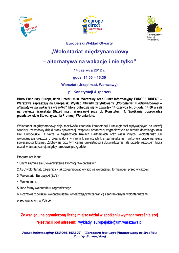 Europejski Wykład Otwarty „Wolontariat międzynarodowy – alternatywa na wakacje i nie tylko” 14 czerwca 2012 r. godz. 14:00 – 15:30 Warsztat (Urząd m.st. Warszawy) pl. Konstytucji 4 (parter) Biuro Funduszy Europejskich Urzędu m.st. Warszawy oraz Punkt Informacyjny EUROPE DIRECT – Warszawa zapraszają na Europejski Wykład Otwarty zatytułowany „Wolontariat międzynarodowy – alternatywa na wakacje i nie tylko”, który odbędzie się w czwartek 14 czerwca br. o godz. 14:00 w sali na parterze Warsztatu (Urząd m.st. Warszawy) przy pl. Konstytucji 4. Spotkanie poprowadzą przedstawiciele Stowarzyszenia Promocji Wolontariatu. Wolontariat międzynarodowy daje możliwość zdobycia kompetencji i umiejętności wpływających na rozwój osobisty i zawodowy dzięki pracy społecznej i wsparciu organizacji zagranicznych na terenie dowolnego kraju Unii Europejskiej, a także w Sąsiedzkich Krajach Partnerskich oraz wielu innych. Wolontariusz lub wolontariusze goszczą u organizatora w innym kraju niż ich kraj zamieszkania i wykonują pracę na rzecz społeczności lokalnej. Zdobywają przy tym cenne umiejętności i doświadczenie, ale przede wszystkim biorą udział w fantastycznej, międzynarodowej przygodzie. Program wykładu: 1.Czym zajmuje się Stowarzyszenie Promocji Wolontariatu? 2.ABC wolontariatu zagranicą - jak zorganizować wyjazd na wolontariat, formalności przed wyjazdem. 3. Wolontariat Europejski (EVS). 4. Workcampy. 5. Inne formy wolontariatu zagranicznego. 6. Rozmowa z polskimi wolontariuszami wyjeżdżającymi zagranicę i zagranicznymi wolontariuszami przebywającymi w Polsce. Ze względu na ograniczoną liczbę miejsc udział w spotkaniu wymaga wcześniejszej rejestracji pod adresem: [email protected] Punkt Informacyjny EUROPE DIRECT – Warszawa jest współfinansowany ze środków Komisji Europejskiej