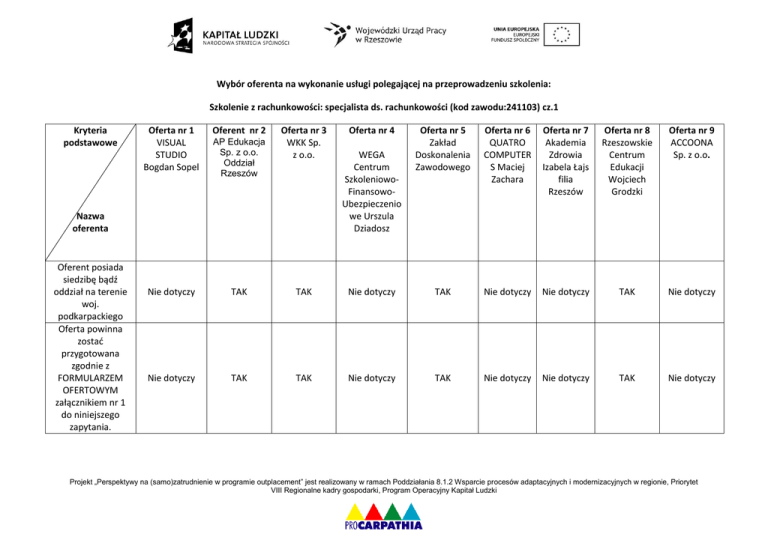 Wybór oferenta na wykonanie usługi polegającej na przeprowadzeniu szkolenia: Szkolenie z rachunkowości: specjalista ds. rachunkowości (kod zawodu:241103) cz.1 Kryteria podstawowe Oferta nr 1 VISUAL STUDIO Bogdan Sopel Oferent nr 2 Nie dotyczy TAK TAK Nie dotyczy TAK TAK AP Edukacja Sp. z o.o. Oddział Rzeszów Oferta nr 3 WKK Sp. z o.o. Nazwa oferenta Oferent posiada siedzibę bądź oddział na terenie woj. podkarpackiego Oferta powinna zostać przygotowana zgodnie z FORMULARZEM OFERTOWYM załącznikiem nr 1 do niniejszego zapytania. Oferta nr 4 Oferta nr 5 Zakład Doskonalenia Zawodowego Oferta nr 6 QUATRO COMPUTER S Maciej Zachara Oferta nr 7 Akademia Zdrowia Izabela Łajs filia Rzeszów Oferta nr 8 Rzeszowskie Centrum Edukacji Wojciech Grodzki Oferta nr 9 ACCOONA Sp. z o.o. Nie dotyczy TAK Nie dotyczy Nie dotyczy TAK Nie dotyczy Nie dotyczy TAK Nie dotyczy Nie dotyczy TAK Nie dotyczy WEGA Centrum SzkoleniowoFinansowoUbezpieczenio we Urszula Dziadosz Projekt „Perspektywy na (samo)zatrudnienie w programie outplacement” jest realizowany w ramach Poddziałania 8.1.2 Wsparcie procesów adaptacyjnych i modernizacyjnych w regionie, Priorytet VIII Regionalne kadry gospodarki, Program Operacyjny Kapitał Ludzki Ofertę należy sporządzić w języku polskim, w formie pisemnej, czytelnie, wypełniając nieścieralnym atramentem lub długopisem, maszynowo lub komputerowo Oferta wraz z załącznikami była umieszczona w zamkniętej kopercie wraz z opisem Zaoferowana cena uwzględnia wykonanie wszystkich prac i czynności świadczonych przez okres i na warunkach określonych w ofercie. Wykonawcy złożyli oferty wraz z wymaganymi załącznikami Nie dotyczy TAK TAK Nie dotyczy TAK Nie dotyczy Nie dotyczy TAK Nie dotyczy Nie dotyczy TAK TAK Nie dotyczy TAK Nie dotyczy Nie dotyczy TAK Nie dotyczy Nie dotyczy TAK TAK Nie dotyczy TAK Nie dotyczy Nie dotyczy TAK Nie dotyczy Nie dotyczy TAK TAK Nie dotyczy TAK Nie dotyczy Nie dotyczy TAK Nie dotyczy Projekt „Perspektywy na (samo)zatrudnienie w programie outplacement” jest realizowany w ramach Poddziałania 8.1.2 Wsparcie procesów adaptacyjnych i modernizacyjnych w regionie, Priorytet VIII Regionalne kadry gospodarki, Program Operacyjny Kapitał Ludzki Oferowana cena za przeprowadzenia szkolenia Liczba zrealizowanych godzin szkoleniowych w ostatnich 3 latach o tematyce zbliżonej do szkoleń objętych przedmiotowym zamówieniem Akredytacja Ministerstwa Edukacji Narodowej Suma uzyskanych punktów Nie dotyczy 15 600,00 zł 23 095,00 zł Nie dotyczy 12 600,00 zł Nie dotyczy Nie dotyczy 11 000,00 zł Nie dotyczy Nie dotyczy 390 5297 Nie dotyczy 1520 Nie dotyczy Nie dotyczy 5742 Nie dotyczy Nie dotyczy brak brak Nie dotyczy TAK Nie dotyczy Nie dotyczy TAK Nie dotyczy Nie dotyczy 25,54 57,76 Nie dotyczy 46,14 Nie dotyczy Nie dotyczy 77,98 Nie dotyczy Projekt „Perspektywy na (samo)zatrudnienie w programie outplacement” jest realizowany w ramach Poddziałania 8.1.2 Wsparcie procesów adaptacyjnych i modernizacyjnych w regionie, Priorytet VIII Regionalne kadry gospodarki, Program Operacyjny Kapitał Ludzki