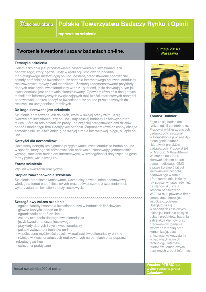 Polskie Towarzystwo Badaczy Rynku i Opinii zaprasza na szkolenie Tworzenie kwestionariusza w badaniach on-line. 9 maja 2014 r. Warszawa Tematyka szkolenia Celem szkolenia jest przedstawienie zasad tworzenia kwestionariusza badawczego, który będzie użyty w realizacji ilościowego badania marketingowego metodologią on-line. Zostaną przedstawione specyficzne zasady odróżniające kwestionariusz badania internetowego od kwestionariuszy realizowanych tradycyjnymi technikami. Zostaną zademonstrowane przykłady dobrych oraz złych kwestionariuszy wraz z kryteriami, jakie decydują o tym jaki kwestionariusz jest poprawnie skonstruowany. Opowiem również o dostępnych technikach informatycznych zwiększających możliwości internetowych narzędzi badawczych, a także specyfiką kwestionariusz on-line przeznaczonych do realizacji na urządzeniach mobilnych. Do kogo kierowane jest szkolenie Szkolenie adresowane jest do osób, które w swojej pracy zajmują się tworzeniem kwestionariuszy on-line - najczęściej badaczy ilościowych oraz takich, które są odbiorcami ich pracy - najczęściej przedstawicielami działów badań i marketingu firm zlecających badania. Zapraszam również osoby chcące samodzielnie umieścić ankietę na swojej stronie internetowej, blogu, sklepie online. Korzyści dla uczestników Uczestnicy nabędą umiejętność przygotowania kwestionariusza badań on-line w sposób, który będzie adresował cele badawcze, zachowując jednocześnie wymogi stawianie badaniom internetowym, w szczególności dotyczące długości, formy pytań, wizualizacji itp. Forma szkolenia Wykład + ćwiczenia praktyczne. Stopień zaawansowania szkolenia Szkolenie średniozaawansowane. Uczestnicy powinni mieć podstawową wiedzę na temat badań ilościowych oraz doświadczenie z tworzeniem lub wykorzystaniem kwestionariuszy ilościowych. Szczegółowy zakres szkolenia - ogólne zasady tworzenia kwestionariusza w badaniach ilościowych - główne korzyści badań on-line - ograniczenia badań on-line - zasady tworzenia dobrego kwestionariusza - język kwestionariusza ilościowego - przykłady dobrych i złych kwestionariuszy - pułapki związane z techniką on-line - współczesne możliwości edycji i wizualizacji kwestionariuszy on-line - różnice w kwestionariuszach realizowanych na panelach oraz poprzez rekrutację ad-hoc - ćwiczenia praktyczne koszt szkolenia: 990 zł netto Tomasz Dulinicz Zajmuje się badaniami rynku i opinii od 1999 roku. Pracował w kilku agencjach badawczych. Zaczynał w Demoskopie jako analityk a następnie badacz i kierownik projektów badawczych. Pracował też wTNS oraz MillwardBrown. W latach 2003-2006 kierował działem badań domu mediowego OMD a przez kolejne 6 lat był kierownikiem zespołu badawczego w firmie 4P research mix. Kolejny rok spędził w Ipsos, również na stanowisku szefa zespołu badawczego. W 2013 roku powstała firma smartscope, której jest współzałożycielem. Specjalizuje się w badaniach ilościowych, takich jak badania nowych usług i produktów, badania satysfakcji klientów oraz pracowników, badania związane z marką oraz komunikacją. Jest entuzjastą wykorzystania w badaniach nowych technologii: Internetu, telefonów komórkowych, pasywnych źródeł informacji. Voucher PTBRiO do wykorzystania przez Członków