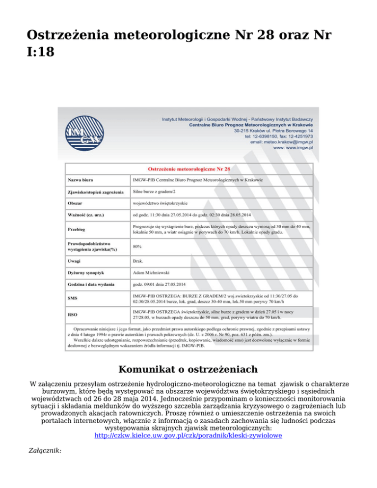 Ostrzeżenia meteorologiczne Nr 28 oraz Nr I:18 Komunikat o ostrzeżeniach W załączeniu przesyłam ostrzeżenie hydrologiczno-meteorologiczne na temat zjawisk o charakterze burzowym, które będą występować na obszarze województwa świętokrzyskiego i sąsiednich województwach od 26 do 28 maja 2014. Jednocześnie przypominam o konieczności monitorowania sytuacji i składania meldunków do wyższego szczebla zarządzania kryzysowego o zagrożeniach lub prowadzonych akacjach ratowniczych. Proszę również o umieszczenie ostrzeżenia na swoich portalach internetowych, włącznie z informacją o zasadach zachowania się ludności podczas występowania skrajnych zjawisk meteorologicznych: http://czkw.kielce.uw.gov.pl/czk/poradnik/kleski-zywiolowe Załącznik: Data i godzina wydania: 26.05.2014 - godz. 12:42 Nazwa biura prognoz hydrologicznych: BPH O/Kraków IMGW PIB INFORMACJA O NIEBEZPIECZNYM ZJAWISKU Nr I:18 Zjawisko: wezbranie z przekroczeniem stanów ostrzegawczych Stopień zagrożenia: 2 Ważność: od godz. 13:00 dnia 26.05.2014 do godz. 13:00 dnia 28.05.2014 Obszar: Rejon hydrologiczny IVa (śląskie, małopolskie, świętokrzyskie, podkarpackie, lubelskie) Przebieg: W związku z prognozowanymi intensywnymi opadami deszczu o charakterze burzowym, na dopływach Wisły po Dęblin, a w szczególności w małych zlewniach i zlewniach zurbanizowanych - w miejscu wystąpienia opadu burzowego - prognozowany jest gwałtowny wzrost poziomu wody do dolnej części strefy stanów wysokich, lokalnie z możliwością przekroczenia stanów ostrzegawczych. Obecne przekroczenia stanów alarmowych w zlewni Wieprza będą się utrzymywać. Wzrost poziomu wody w wyniku prognozowanych opadów o charakterze burzowym możliwy jest także na lewobrzeżnych dopływach Bugu (na Krznie w Malowej Górze możliwe ponowne przekroczenie stanu alarmowego). Prawdopodobieństwo wystąpienia zjawiska: 75% Uwagi: W sytuacji wystąpienia istotnych zmian w czasie lub w przebiegu zjawiska ostrzeżenie może ulec zmianie. Dyżurny synoptyk hydrolog: Anna Śmiech Wiadomość SMS: IMGW PIB OSTRZEGA:WEZBR.Z PRZEKROCZ.ST.OSTRZEGAWCZ./2 rejon hydrologiczny iva(slaskie,malopol.,swietokrz.,podkarp.,lubelskie) od13:00/26.05.do13:00/28.05.2014 Gmina Rytwiany - www.rytwiany.com.pl