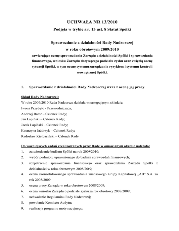 UCHWAŁA NR 13/2010 Podjęta w trybie art. 13 ust. 8 Statut Spółki Sprawozdanie z działalności Rady Nadzorczej w roku obrotowym 2009/2010 zawierające ocenę sprawozdania Zarządu z działalności Spółki i sprawozdania finansowego, wniosku Zarządu dotyczącego podziału zysku oraz zwięzłą ocenę sytuacji Spółki, w tym ocenę systemu zarządzania ryzykiem i systemu kontroli wewnętrznej Spółki. 1. Sprawozdanie z działalności Rady Nadzorczej wraz z oceną jej pracy. Skład Rady Nadzorczej: W roku 2009/2010 Rada Nadzorcza działała w następującym składzie: Iwona Przybyło - Przewodnicząca; Andrzej Bator – Członek Rady; Jan Łapiński – Członek Rady; Jacek Łapiński – Członek Rady; Katarzyna Jażdrzyk – Członek Rady; Radosław Kiełbasiński – Członek Rady Do ważniejszych zadań zrealizowanych przez Radę w omawianym okresie należało: 1. zatwierdzenie budżetu Spółki na rok 2009/2010; 2. wybór podmiotu uprawnionego do badania sprawozdań finansowych; 3. rozpatrzenie sprawozdania finansowego oraz sprawozdania Zarządu Spółki z działalności w roku obrotowym 2008/2009; 4. ocena skonsolidowanego sprawozdania finansowego Grupy Kapitałowej „AB” S.A. za rok 2008/2009 5. ocena pracy Zarządu w roku obrotowym 2008/2009; 6. ocena wniosku Zarządu o podziale zysku za rok obrotowy 2008/2009; 7. uchwalenie Regulaminu Rady Nadzorczej; 8. powołanie Komitetu Audytu; 9. realizacja programu motywacyjnego; 10. wyrażenie zgody na nabycie przez Spółkę 100 % udziałów w „B2B” Sp. z o.o. 11. wyrażenie zgody na realizację centrum logistycznego dla Grupy AB; 12. nadzór nad polityką kredytową Spółki; Bieżący nadzór nad działalnością Spółki realizowany był poprzez odbieranie informacji i wyjaśnień oraz przekazywanie uwag Zarządowi na posiedzeniach Rady a także za pomocą środków porozumiewania się na odległość. Statystyka posiedzeń Rady: Rada odbyła dwa posiedzenie we Wrocławiu a ponadto podjęła cały szereg uchwał w trybie obiegowym. Łącznie w roku obrotowym 2009/2010 Rada podjęła 18 uchwał. Podsumowanie: W omawianym okresie Rada Nadzorcza wykonała wszystkie nałożone na nią przez Kodeks spółek handlowych i Statut Spółki obowiązki, zarówno w zakresie czynności niezbędnych dla prawidłowego bieżącego funkcjonowania Spółki jak i w zakresie nadzoru nad działalnością Spółki. 2. Zwięzła ocena sytuacji Spółki z uwzględnieniem oceny systemu kontroli wewnętrznej i systemu zarządzania ryzykiem istotnym dla Spółki. Rada Nadzorcza pozytywnie ocenia sytuację Spółki, zarówno w zakresie jej pozycji na rynku, jak też osiąganych wyników. W chwili obecnej AB S.A. jest jednym z największych i najdynamiczniej rozwijających się przedsiębiorstw dystrybucyjnych branży IT w Polsce. Fakt ów znajduje potwierdzenie zarówno w wolumenie przychodów ze sprzedaży jak również dynamicznie rosnącej zyskowności Spółki. W roku obrotowym 2009/2010. Spółka mimo trudnych warunków makroekonomicznych utrzymała wysoki poziom przychodów ze sprzedaży, które wyniosły 1 633 513 tys. zł. Na szczególną uwagę zasługuje fakt, znaczącego wzrostu wypracowanego zysku netto z wysokości 16 446 tys. zł. (osiągniętej w poprzednim roku obrotowym) do 21 054 tys. zł., tym samym Spółka poprawiła rentowności kapitału własnego (ROE) w stosunku do porównywalnego okresu z 8,02% do 9,49% oraz rentowności aktywów (ROA) osiągając poziom 3,86%. Zdaniem Rady, w roku obrotowym 2009/2010 Spółka konsekwentnie realizowała przyjętą i trafną strategię rozwoju. Mając na uwadze, że obecnie AB S.A. działa w warunkach występowania światowego kryzysu finansowego, a w jego konsekwencji pogarszającej się sytuacji gospodarczej w Polsce i na rynkach ościennych, Spółka podjęła szereg działań mających na celu przygotowanie przedsiębiorstwa do zmniejszonego popytu spowodowanego skutkami globalnej recesji. W tym celu zaostrzona została dyscyplina kosztowa, jak również charakter ponoszonych kosztów (między innymi uzmiennienie kosztów stałych), tak aby zniwelować niekorzystne efekty potencjalnego spadku poziomów sprzedaży, jednocześnie nie tracąc wysokiej sprawności operacyjnej. Spółka skoncentrowała się także na kontynuowaniu integracji organizacyjnej z przejętymi w drugiej połowie roku 2007 spółkami czeskimi i słowacką, działającymi w ramach AT Computers Holding. Dzięki rozbudowie zaplecza logistycznego i biurowego przedsiębiorstwa poprawie uległa jakość obsługi klienta, również obniżenie towarzyszących jej kosztów czego dowodem jest spadek kosztów ogólnego zarządu oraz sprzedaży o 3,6 mln PLN. Tym samym udział tych kosztów w przychodach ze sprzedaży wyniósł zaledwie 2,08%. Są to wyniki, które w opinii Rady zasługują na szczególną uwagę od strony zarządzania procesami. Strategia rozwoju spółki zakłada utrzymanie pozycji rynkowej, jak również rozwój w wybranych selektywnych kierunkach, mając na uwadze bezpieczeństwo finansowe spółki. Spółka zakłada dalszy rozwój w oparciu o następujące filary: 1. niskie koszty sprzedaży i ogólnego zarządu (tzw. wskaźnik kosztów SG&A) – niska baza kosztów przyczynia się do większej elastyczności działania, a tym samym sprawia, że Spółka jest bardziej odporna na negatywne zewnętrzne czynniki o charakterze popytowym. 2. aktywność rynkowa oparta na szerokiej i komplementarnej ofercie produktowej, adresowanej do szerokiego portfela klientów oraz na biznesie realizowanym wg zasady „runrate-biznes”, czyli codziennej sprzedaży do klientów – spółka posiada zdywersyfikowaną grupę klientów, koncentracja sprzedaży do największego odbiorcy nie przekracza 10% (5,8%). 3. sprzedaż do klientów bazuje na przydzielonych limitach kupieckich, które są ubezpieczone w firmie Atradius, jednej z dwóch najbardziej obecnych ubezpieczalni tego typu ryzyka w Polsce. Ponadto bardzo duże znaczen