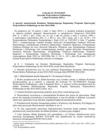 Uchwała Nr 35/324/2015 Zarządu Województwa Podlaskiego z dnia 8 kwietnia 2015 r. w sprawie ustanowienia Komitetu Monitorującego Regionalny Program Operacyjny Województwa Podlaskiego na lata 2014-2020 Na podstawie art. 14 ustawy z dnia 11 lipca 2014 r. o zasadach realizacji programów w zakresie polityki spójności finansowanych w perspektywie finansowej 2014-2020 (Dz. U. z 2014 r. poz. 1146), art. 41 ust. 2 pkt 4a ustawy z dnia 5 czerwca 1998 r. o samorządzie województwa (Dz. U. z 2013 r. poz. 596 z późn. zm.1), art. 47-49 i 110 Rozporządzenia Parlamentu Europejskiego i Rady (UE) nr 1303/2013 z dnia 17 grudnia 2013 r. ustanawiającego wspólne przepisy dotyczące Europejskiego Funduszu Rozwoju Regionalnego, Europejskiego Funduszu Społecznego, Funduszu Spójności, Europejskiego Funduszu Rolnego na rzecz Rozwoju Obszarów Wiejskich oraz Europejskiego Funduszu Morskiego i Rybackiego oraz ustanawiającego przepisy ogólne dotyczące Europejskiego Funduszu Rozwoju Regionalnego, Europejskiego Funduszu Społecznego, Funduszu Spójności i Europejskiego Funduszu Morskiego i Rybackiego oraz uchylającego rozporządzenie Rady (WE) nr 1083/2006 (Dz. U. UE L. 347 z dnia 20 grudnia 2013 r.)2 Zarząd Województwa Podlaskiego uchwala, co następuje: § 1. 1. Ustanawia się Komitet Monitorujący Regionalny Program Operacyjny Województwa Podlaskiego na lata 2014-2020, zwany dalej Komitetem. 2. Komitet powoływany jest na czas realizacji Regionalnego Programu Operacyjnego Województwa Podlaskiego na lata 2014-2020, zwanego dalej RPOWP 2014-2020. § 2. 1. Skład Komitetu określa Załącznik Nr 1 do niniejszej Uchwały. 2. Wybór przedstawicieli do składu Komitetu oraz wszelkie zmiany w składzie Komitetu przeprowadzane są w oparciu o załącznik do Uchwały Nr 265/3840/2014 Zarządu Województwa Podlaskiego z dnia 4 listopada 2014 r. w sprawie wyboru przedstawicieli do składu Komitetu Monitorującego Regionalny Program Operacyjny Województwa Podlaskiego na lata 2014-2020 (z późn. zm.). 3. Członek Komitetu reprezentuje podmiot, przez który został delegowany. 4. Obserwatorzy uczestniczą w posiedzeniach Komitetu bez prawa do głosowania. Mają prawo do czynnego uczestnictwa w posiedzeniach, w tym do udziału w dyskusji, wyrażania opinii oraz zgłaszania uwag odnośnie zagadnień będących przedmiotem obrad. 5. Przedstawiciele Komisji Europejskiej pełnią w Komitecie rolę doradczą. Przysługują im takie same prawa jak Obserwatorom, określone w ust. 4. 6. W celu zapewnienia sprawnego funkcjonowania Komitetu każdy podmiot, którego przedstawiciel został powołany do składu Komitetu, wyznacza jego zastępcę. 7. Lista imienna składu Komitetu jest sporządzana i na bieżąco aktualizowana przez Instytucję Zarządzającą RPOWP 2014-2020 oraz publikowana na stronie internetowej Instytucji Zarządzającej RPOWP 2014-2020. 1 Zmiany tekstu jednolitego wymienionej ustawy zostały ogłoszone w Dz. U. z 2013 r. poz. 645, z 2014 r., poz. 379, poz. 1072. 2 Tzw. Rozporządzenie ogólne § 3. 1. Na podstawie art. 49 oraz art. 110 Rozporządzenia ogólnego Komitet dokonuje w szczególności przeglądu wdrażania RPOWP 2014-2020 i postępów poczynionych na drodze do osiągnięcia jego celów, a także bada wszelkie inne kwestie, które wpływają na wykonanie Programu. 2. Zadania Komitetu określa Załącznik Nr 2 do niniejszej Uchwały. § 4. 1. Zasady i tryb funkcjonowania Komitetu określa Regulamin Komitetu. 2. Regulamin Komitetu przyjmowany jest na pierwszym posiedzeniu Komitetu uchwałą podejmowaną zwykłą większością głosów przy udziale co najmniej połowy liczby osób uprawnionych do głosowania3 w posiedzeniu Komitetu. § 5. Organizacyjno-techniczne przygotowanie i obsługę posiedzeń Komitetu zapewnia Sekretariat Komitetu znajdujący się w Referacie Monitorowania i Systemów Informatycznych w Departamencie Rozwoju Regionalnego Urzędu Marszałkowskiego Województwa Podlaskiego. § 6. Niniejsza uchwała wchodzi w życie z dniem podjęcia. 3 Osobą uprawnioną do głosowania jest Członek Komitetu, a w przypadku jego nieobecności Zastępca Członka Komitetu. Jeżeli w posiedzeniu uczestniczą zarówno Członek Komitetu i jego Zastępca, prawo do głosowania ma wyłącznie Członek Komitetu