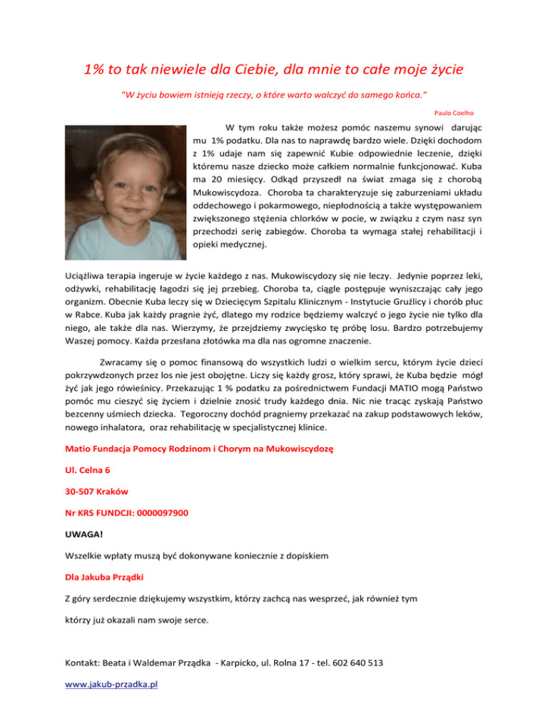 1% to tak niewiele dla Ciebie, dla mnie to całe moje życie "W życiu bowiem istnieją rzeczy, o które warto walczyć do samego końca." Paulo Coelho W tym roku także możesz pomóc naszemu synowi darując mu 1% podatku. Dla nas to naprawdę bardzo wiele. Dzięki dochodom z 1% udaje nam się zapewnić Kubie odpowiednie leczenie, dzięki któremu nasze dziecko może całkiem normalnie funkcjonować. Kuba ma 20 miesięcy. Odkąd przyszedł na świat zmaga się z chorobą Mukowiscydoza. Choroba ta charakteryzuje się zaburzeniami układu oddechowego i pokarmowego, niepłodnością a także występowaniem zwiększonego stężenia chlorków w pocie, w związku z czym nasz syn przechodzi serię zabiegów. Choroba ta wymaga stałej rehabilitacji i opieki medycznej. Uciążliwa terapia ingeruje w życie każdego z nas. Mukowiscydozy się nie leczy. Jedynie poprzez leki, odżywki, rehabilitację łagodzi się jej przebieg. Choroba ta, ciągle postępuje wyniszczając cały jego organizm. Obecnie Kuba leczy się w Dziecięcym Szpitalu Klinicznym - Instytucie Gruźlicy i chorób płuc w Rabce. Kuba jak każdy pragnie żyć, dlatego my rodzice będziemy walczyć o jego życie nie tylko dla niego, ale także dla nas. Wierzymy, że przejdziemy zwycięsko tę próbę losu. Bardzo potrzebujemy Waszej pomocy. Każda przesłana złotówka ma dla nas ogromne znaczenie. Zwracamy się o pomoc finansową do wszystkich ludzi o wielkim sercu, którym życie dzieci pokrzywdzonych przez los nie jest obojętne. Liczy się każdy grosz, który sprawi, że Kuba będzie mógł żyć jak jego rówieśnicy. Przekazując 1 % podatku za pośrednictwem Fundacji MATIO mogą Państwo pomóc mu cieszyć się życiem i dzielnie znosić trudy każdego dnia. Nic nie tracąc zyskają Państwo bezcenny uśmiech dziecka. Tegoroczny dochód pragniemy przekazać na zakup podstawowych leków, nowego inhalatora, oraz rehabilitację w specjalistycznej klinice. Matio Fundacja Pomocy Rodzinom i Chorym na Mukowiscydozę Ul. Celna 6 30-507 Kraków Nr KRS FUNDCJI: 0000097900 UWAGA! Wszelkie wpłaty muszą być dokonywane koniecznie z dopiskiem Dla Jakuba Prządki Z góry serdecznie dziękujemy wszystkim, którzy zachcą nas wesprzeć, jak również tym którzy już okazali nam swoje serce. Kontakt: Beata i Waldemar Prządka - Karpicko, ul. Rolna 17 - tel. 602 640 513 www.jakub-przadka.pl