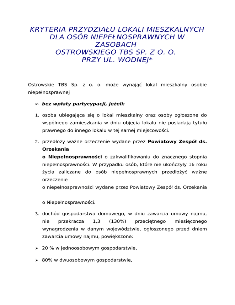 KRYTERIA PRZYDZIAŁU LOKALI MIESZKALNYCH DLA OSÓB NIEPEŁNOSPRAWNYCH W ZASOBACH OSTROWSKIEGO TBS SP. Z O. O. PRZY UL. WODNEJ* Ostrowskie TBS Sp. z o. o. może wynająć lokal mieszkalny osobie niepełnosprawnej • bez wpłaty partycypacji, jeżeli: 1. osoba ubiegająca się o lokal mieszkalny oraz osoby zgłoszone do wspólnego zamieszkania w dniu objęcia lokalu nie posiadają tytułu prawnego do innego lokalu w tej samej miejscowości. 2. przedłoży ważne orzeczenie wydane przez Powiatowy Zespół ds. Orzekania o Niepełnosprawności o zakwalifikowaniu do znacznego stopnia niepełnosprawności. W przypadku osób, które nie ukończyły 16 roku życia zaliczane do osób niepełnosprawnych przedłożyć ważne orzeczenie o niepełnosprawności wydane przez Powiatowy Zespół ds. Orzekania o Niepełnosprawności. 3. dochód gospodarstwa domowego, w dniu zawarcia umowy najmu, nie przekracza 1,3 (130%) przeciętnego miesięcznego wynagrodzenia w danym województwie, ogłoszonego przed dniem zawarcia umowy najmu, powiększone: 20 % w jednoosobowym gospodarstwie, 80% w dwuosobowym gospodarstwie, dalsze 40% na każdą dodatkową osobę w gospodarstwie domowym o większej liczbie osób. 4. Dochód przypadający na członka gospodarstwa domowego, w okresie 3 miesięcy przed zawarciem umowy nie jest niższy, niż: 180 % najniższej emerytury na osobę w gospodarstwie emeryturę na osobę w gospodarstwie jednoosobowym, 130 % najniższej dwuosobowym, 80 % najniższej emeryturę na osobę w gospodarstwie trzyosobowym i większym. 5. Spełniać dodatkowe kryteria zawarte w regulaminie TBS - u (Załącznik nr 1 Wskaźniki dochodów maksymalnych i minimalnych uprawniających do kwalifikacji najmu mieszkań) 6. Wpłaci kaucję zabezpieczającą (jest to 12 – krotność miesięcznego czynszu, płatna na 30 dni przed zasiedleniem). Pierwszeństwo przy rozpatrywaniu wniosków mają osoby, które: posiadają zameldowanie na terenie miasta Ostrowa Wielkopolskiego, dysponują niższym dochodami, zamieszkują w trudnych warunkach mieszkaniowych (np.: zagęszczenie w lokalu, bariery architektoniczne, brak dostępu do mediów). Ubieganie się o mieszkanie rozpoczyna się od złożenia przez zainteresowanego wniosku o najem lokalu. Wnioski należy składać w biurze Ostrowskiego TBS Sp. z o. o. przy ulicy M. Konopnickiej 58 w Ostrowie Wielkopolskim do 31 marca 2011 roku. Kwalifikacji wniosków dokonuje Komisja Mieszkaniowa powołana przy Ostrowskim TBS. *OBOWIĄZUJĄCE OD DNIA 15 LUTEGO 2011 ROKU *NIE DOTYCZY OSÓB, KTÓRE SĄ NAJEMCAMI MIESZKAŃ Z ZASOBU OSTROWSKIEGO TBS SP. Z O.O. *NIE DOTYCZY OSÓB, KTÓRE ZŁOŻYŁY WNIOSEK O PRZYDZIAŁ MIESZKANIA PRZED DNIEM 15 LUTEGO 2011 ROKU KRYTERIA PRZYDZIAŁU LOKALI MIESZKALNYCH DLA OSÓB NIEPEŁNOSPRAWNYCH W ZASOBACH OSTROWSKIEGO TBS SP. Z O. O. PRZY UL. WODNEJ* • wpłacając 10 % partycypację, jeżeli: 1. osoba ubiegająca się o lokal mieszkalny oraz osoby zgłoszone do wspólnego zamieszkania w dniu objęcia lokalu nie posiadają tytułu prawnego do innego lokalu w tej samej miejscowości. 2. przedłoży ważne orzeczenie wydane przez Powiatowy Zespół ds. Orzekania o Niepełnosprawności o zakwalifikowaniu do umiarkowanego stopnia niepełnosprawności. 3. dochód gospodarstwa domowego, w dniu zawarcia umowy najmu, nie przekracza 1,3 (130%) przeciętnego miesięcznego wynagrodzenia w danym województwie, ogłoszonego przed dniem zawarcia umowy najmu, powiększone: 20 % w jednoosobowym gospodarstwie, 80% w dwuosobowym gospodarstwie, dalsze 40% na każdą dodatkową osobę w gospodarstwie domowym o większej liczbie osób. 4. Dochód przypadający na członka gospodarstwa domowego, w okresie 3 miesięcy przed zawarciem umowy nie jest niższy, niż: 180 % najniższej emerytury na osobę w gospodarstwie emeryturę na osobę w gospodarstwie jednoosobowym, 130 % najniższej dwuosobowym, 80 % najniższej emeryturę na osobę w gospodarstwie trzyosobowym i większym. 5. Spełniać dodatkowe kryteria zawarte w regulaminie TBS - u (Załącznik nr 1 Wskaźniki dochodów maksymalnych i minimalnych uprawniających do kwalifikacji najmu mieszkań). 6. Wpłaci 10 % partycypację w przypadku zakwalifikowania wniosku przez Komisję Mieszkaniową (Załącznik nr 2 Tabela wysokości partycypacji dla osób niepełnosprawych). 7. Wpłaci kaucję zabezpieczającą (jest to 12 – krotność miesięcznego czynszu, płatna na 30 dni przed zasiedleniem). Pierwszeństwo które: przy rozpatrywaniu wniosków mają osoby, posiadają zameldowanie na terenie miasta Ostrowa Wielkopolskiego, dysponują niższym dochodami, zamieszkują w trudnych warunkach mieszkaniowych (np.: zagęszczenie w lokalu, bariery architektoniczne, brak dostępu do mediów). Ubieganie się o mieszkanie rozpoczyna się od złożenia przez zainteresowanego wniosku o najem lokalu. Wnioski należy składać w biurze Ostrowskiego TBS Sp. z o. o. przy ulicy M. Konopnickiej 58 w Ostrowie Wielkopolskim do 31 marca 2011 roku. Kwalifikacji wniosków dokonuje Komisja Mieszkaniowa powołana przy Ostrowskim TBS. *OBOWIĄZUJĄCE OD DNIA 15 LUTEGO 2011 ROKU *NIE DOTYCZY OSÓB, KTÓRE SĄ NAJEMCAMI MIESZKAŃ Z ZASOBU OSTROWSKIEGO TBS SP. Z O.O. *NIE DOTYCZY OSÓB, KTÓRE ZŁOŻYŁY WNIOSEK O PRZYDZIAŁ MIESZKANIA PRZED DNIEM 15 LUTEGO 2011 ROKU
