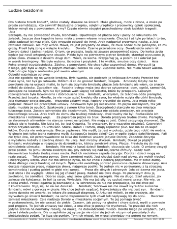 Ludzie bezdomni Oto historia trzech kobiet*, które zostały skazane na śmierć. Może głodową, może z zimna, a może po prostu samobójczą. Kto zawinił? Bezduszne przepisy, oziębli urzędnicy i pracownicy opieki społecznej, którzy minęli się z powołaniem. A my? Często równie obojętni przechodzimy obok ludzkich tragedii. Jola Szczupła, by nie powiedzieć chuda, blondynka. Opuchnięte od płaczu oczy i pusty od kilkunastu dni żołądek. Jeszcze dwa tygodnie temu miała z synem własne mieszkanie. Chociaż i aż tyle po latach tortur, jakie zadawał jej mąż pijak. Gdy wreszcie odszedł do innej, Arek nadganiał przerwaną naukę, a Jola ratowała zdrowie. Ale mąż wrócił. Mówił, że jest przyparty do muru, że musi oddać duże pieniądze, że mu grożą. Prosił byłą żonę o wzięcie kredytu. Dorota Czarne przerażone oczy. Dwadzieścia osiem lat. Czworo dzieci i żadnej nadziei. O tym, co przeszła, będą jej zawsze przypominać stopy. Do końca życia będzie już nosić ortopedyczne obuwie. Piekło było na pierwszym piętrze — stamtąd wyrzucono ją przez okno. Znalazła z dziećmi drugi dom. Mówił, że kocha. Przygarnął ją, a potem pił i uderzał jak w worek treningowy. Nie było wyboru. Ucieczka i przytułek. I te wielkie, smutne oczy dzieci. Asia Pełna energii trzydziestolatka. Zdolna, z pomysłami. Nie chce tylko wspominać domu. Wyrzucili ją z niego, gdy była w ciąży. W piątym miesiącu została na ulicy. Zupełnie sama. Nie miała nawet walizki. Tylko drugie bijące serduszko pod swoim własnym. Odsetki ważniejsze od syna Jola nie zgodziła się na wzięcie kredytu. Była twarda, ale podeszła ją teściowa:— Przecież też masz syna, też byś go ratowała. Oddam ci co do grosza! — błagała. — Gdyby nie to powołanie się na uczucia matki, to bym się trzymała — płacze Jola — ale wiem, co znaczy miłość do dziecka. Zgodziłam się. Rodzina byłego męża jest dobrze sytuowana: dom, ogród, samochód, pieniądze na lokatach. Syn nie był jednak wart więcej niż odsetki, które by przepadły. Lepszym rozwiązaniem była łatwowierna i dobroduszna Jola. — Wierzyłam, że teściowa odda pieniądze. Przecież jest bogata. Mówiła, że nie może wziąć kredytu dla syna, bo właśnie wzięła dla córki — Jola tłumaczy swoją decyzję. Wszystko załatwił mąż. Papiery przyniósł do domu. Jola miała tylko podpisać. Nawet nie przeczytała umowy. Zastawem było jej mieszkanie. Po pięciu miesiącach, tak jak stała, musiała je opuścić. Spakowała z synem kilka toreb. Oszczędności starczyło na dwa miesiące tułaczego życia. Zostało schronisko dla bezdomnych. Teściowa nie oddała pieniędzy, nie przyjęła bezdomnego wnuka. Arek trafił do domu dla trudnej młodzieży, choć trudny nie był. Pozbawiono ich mieszkania i rodzinnej więzi. Za papierosa piątka na bruk Dorota przeżywa trudne chwile. Pieniędzy ze skromnych alimentów nie starcza nawet na tydzień. Nie mają co jeść. Dzieci zaczynają chorować. Źle układa się w hostelu. Nie lubią jej, bo jest Cyganką. To wystarczy, by o wszystko obwiniać. Czteroletni Krzyś brzydko kaszle. To krztusiec. Starsi, Daniel i Tomek, mają zapalenie płuc. Nie ma za co kupić leków. Dorota nie wytrzymuje. Bierze papierosa. Nie myśli, że jest w pokoju, gdzie tego robić nie można. W głowie jest tylko jedna natrętna myśl: „Co będzie dalej? Czy w ogóle będzie dalej?”. Pali nie tylko ona, ale przeprowadzone za kilka dni śledztwo wskaże jedynie Dorotę. Zapadnie decyzja o wydaleniu kobiety z czwórką dzieci. Na ulicę. Jest mroźny styczeń. — Dokąd ja pójdę?! — wykrzykuje w rozpaczy do dziennikarzy, którzy zwietrzyli aferę. Płacze. Przytula się do niej ośmioletnia córeczka. — Nie można karać dzieci! — oburzają się ludzie. O zmianę decyzji prosi pastor. To jemu Dorota zwierzyła się, gdy zebrały się nad nią czarne chmury. Każdy ruch kierownictwa hostelu śledzą mass media. Pod ich naciskiem zapada decyzja: Dorota i dzieci mogą na razie zostać. Toksyczna pomoc Dom samotnej matki. Jest chociaż dach nad głową, ale wokół niechęć i nieprzyjazny wzrok. Asia nie ma łatwego życia, bo nie znosi z pokorą popychania. Ma w sobie dumę. Może dlatego cierpi bardziej od innych. Opiekunki uwielbiają poniżać porzucone ciężarne dziewczyny. Asia dostaje najgorsze prace, najgorsze słowa, najgorsze posiłki. To jednak nic w porównaniu z tą straszną samotnością i pustką gdzieś w głębi niej samej. Praca dla silnych i zdrowych Jola od dawna nie jadła. Jest słaba i źle wygląda. Udało się jej znaleźć pracę. Radość nie trwa długo. Po pierwszym dniu ją zwolniono, bo zemdlała. Dobrze szyje, więc znów gdzieś się zaczepiła. Nie na długo. Szef usłyszał, jak zwierza się koleżance, że boli ją serce. Wyleciała. Nie ma już siły, by szukać nowej pracy. Nie wie, co z sobą zrobić. Powoli ogarnia ją beznadzieja. W schronisku za nią nie przepadają, bo nie chce pić z koleżankami. Boją się, że na nie doniesie. — Teściowa nie ma nawet wyrzutów sumienia — mówi z goryczą w głosie. Nie chce jednak osądzać. Najważniejszy dla niej jest syn. — Jedno dziecko mi umarło, bo lekarz źle postawił diagnozę. O Arku też mówili, że nie przeżyje, ale wyrwałam go śmierci — na samo wspomnienie tych chwil Joli napływają łzy do oczu. Dworzec zamiast mieszkania Cała nadzieja Doroty w mieszkaniu socjalnym. To jej pomaga trwać w postanowieniu, by nie wracać do piekła. Czasem, jak patrzy na głodne i chore dzieci, myśli o powrocie pod pręgierz. To jednak zniszczy też dzieci, a ona chce je porządnie wychować. To przecież dla nich jedyna szansa na normalny rozwój, na naukę, na doświadczenie miłości. Dorota biega po urzędach, pyta, pisze i składa podania. Dla urzędników jej sytuacja nie różni się jednak niczym od pozostałych stu pięćdziesięciu podań. Tu liczą się punkty