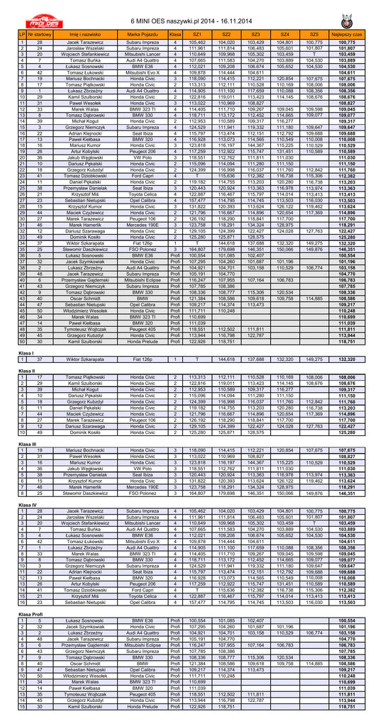 6 MINI OES naszywki.pl 2014 - 16.11.2014 LP Nr startowy Imię i nazwisko Marka Pojazdu Klasa SZ1 SZ2 SZ3 SZ4 SZ5 Najlepszy czas Jacek Tarazewicz Jarosław Wszelaki Wojciech Stefankiewicz Tomasz Buńka Łukasz Sosnowski Tomasz Łukowski Mariusz Bochnacki Tomasz Piątkowski Łukasz Zbrzeźny Kamil Szulborski Paweł Wesołek Marek Walas Tomasz Dąbrowski Michał Kogut Grzegorz Niemczyk Adrian Klejnocki Paweł Kiełbasa Mariusz Kumor Artur Kobylski Jakub Węgłowski Dariusz Pękalski Grzegorz Kubzdyl Tomasz Dziobkowski Daniel Pękalski Przemysław Danielak Krzysztof Miś Sebastian Nietupski Krzysztof Kumor Maciek Czyżewicz Marek Tarazewicz Marek Hamerlik Dariusz Szarawaga Dominik Kosiło Wiktor Szkarapata Sławomir Daszkiewicz Łukasz Sosnowski Jacek Szymkowiak Lukasz Zbrzeźny Jacek Tarazewicz Przemysław Gajdemski Grzegorz Niemczyk Tomasz Dąbrowski Oscar Schmidt Sebastian Nietupski Włodzimierz Wesołek Marek Walas Paweł Kiełbasa Tymoteusz Wojtczak Grzegorz Kubzdyl Kamil Szulborski Subaru Impreza Subaru Impreza Mitsubishi Lancer Audi A4 Quattro BMW E36 Mitsubishi Evo X Honda Civic Honda Civic Audi A4 Ouattro Honda Civic Honda Civic BMW 323 TI BMW 330 Honda Civic Subaru Impreza Seat Ibiza BMW 320 Honda Civic Peugeot 206 VW Polo Honda Civic Honda Civic Ford Capri Honda Civic Seat Ibiza Toyota Celica Opel Calibra Honda Civic Honda Civic Peugeot 106 Mercedes 190E Honda Civic Honda Civic Fiat 126p FSO Polonez BMW E36 Honda Civic Audi A4 Quattro Subaru Impreza Mitsubishi Eclipse Subaru Impreza BMW 330 BMW Opel Calibra Honda Civic BMW 323 TI BMW 320 Peugeot 405 Honda Civic Honda Prelude 4 4 4 4 4 4 3 2 4 2 3 4 4 2 4 4 4 3 4 3 2 2 4 2 3 4 4 3 2 2 3 2 2 1 3 Profi Profi Profi Profi Profi Profi Profi Profi Profi Profi Profi Profi Profi Profi Profi 105,462 111,961 110,649 107,665 112,021 109,878 118,090 113,313 114,905 122,816 113,022 114,405 118,711 112,953 124,529 115,797 116,928 123,818 117,259 118,551 115,096 124,399 T 119.182 120,443 122,887 157,477 131,822 121,796 126,192 123,758 129,105 125,280 T 164,807 100,554 107,295 104,921 105,191 116,247 107,785 108,336 121,384 109,217 111,711 110,699 111,039 118,551 113,944 122,926 104,020 111,814 109,968 111,583 109,208 114,444 114,415 112,111 111,100 119,011 110,969 111,710 113,172 110,589 111,941 113,474 113,073 116,197 112,922 112,762 114,094 116,998 115,636 114,755 120,924 116,467 114,795 120,393 116,667 118,290 118,291 124,399 125,871 144,618 179,698 101,085 104,260 104,701 104,770 107,955 108,386 108,777 108,586 114,374 110,248 103,429 106,483 105,302 104,270 106.674 104,611 112,221 110,528 117,659 113,423 108,827 109,267 112,452 109,317 119,332 112,151 114,565 144,367 115,747 111,811 111,280 116,037 112,382 113,203 113,363 115,797 114,745 113,624 114,896 118,841 134,324 122,427 128,575 137,688 146,351 102,407 101,687 103,158 104,801 105,601 103,459 103,889 105,652 100,775 101,807 T 104,530 104,530 120,854 110,169 110,088 114,145 107,675 108,006 108,356 108,676 109,045 114,665 116,277 111,180 112,792 110,549 115,225 131,451 111,030 111,150 111,760 116,738 120,280 116,978 114,014 113,503 126,122 120,654 117,700 128,975 124,028 109,598 109,077 132,320 150,066 149,275 149,876 101,196 110,529 106,774 107,164 106,783 115,306 109,618 113,473 120,534 109,758 114,885 112,502 116,798 118,751 111,811 122,787 100,775 101,807 103,459 103,889 104,530 104,611 107,675 108,006 108,356 108,676 108,827 109,045 109,077 109,317 109,647 109,688 110,008 110,529 110,589 111,030 111,150 111,760 112,382 113,203 113,363 113,413 113,503 113,624 114,896 117,700 118,291 122,427 125,280 132,320 146,351 100,554 101,196 103,158 104,770 106,783 107,785 108,336 108,586 109,217 110,248 110,699 111,039 111,811 113,944 118,751 Klasa I 1 37 Wiktor Szkarapata Fiat 126p 1 T 144,618 137,688 132,320 149,275 132,320 Klasa II 1 2 3 4 5 6 7 8 9 10 Tomasz Piątkowski Kamil Szulborski Michał Kogut Dariusz Pękalski Grzegorz Kubzdyl Daniel Pękalski Maciek Czyżewicz Marek Tarazewicz Dariusz Szarawaga Dominik Kosiło Honda Civic Honda Civic Honda Civic Honda Civic Honda Civic Honda Civic Honda Civic Peugeot 106 Honda Civic Honda Civic 2 2 2 2 2 2 2 2 2 2 113,313 122,816 112,953 115,096 124,399 119.182 121,796 126,192 129,105 125,280 112,111 119,011 110,589 114,094 116,998 114,755 116,667 118,290 124,399 125,871 110,528 113,423 109,317 111,280 116,037 113,203 114,896 118,841 122,427 128,575 110,169 114,145 116,277 111,150 111,760 120,280 120,654 117,700 124,028 108,006 108,676 108,006 108,676 109,317 111,150 111,760 113,203 114,896 117,700 122,427 125,280 Klasa III 1 19 2 31 3 16 4 36 5 38 6 15 7 46 8 25 Mariusz Bochnacki Paweł Wesołek Mariusz Kumor Jakub Węgłowski Przemysław Danielak Krzysztof Kumor Marek Hamerlik Sławomir Daszkiewicz Honda Civic Honda Civic Honda Civic VW Polo Seat Ibiza Honda Civic Mercedes 190E FSO Polonez 3 3 3 3 3 3 3 3 118,090 113,022 123,818 118,551 120,443 131,822 123,758 164,807 114,415 110,969 116,197 112,762 120,924 120,393 118,291 179,698 112,221 108,827 144,367 111,811 113,363 113,624 134,324 146,351 120,854 107,675 115,225 111,030 116,978 126,122 128,975 150,066 110,529 Klasa IV 1 28 2 24 3 20 4 7 5 4 6 42 7 1 8 33 9 8 10 3 11 22 12 13 13 26 14 41 15 21 16 23 Jacek Tarazewicz Jarosław Wszelaki Wojciech Stefankiewicz Tomasz Buńka Łukasz Sosnowski Tomasz Łukowski Łukasz Zbrzeźny Marek Walas Tomasz Dąbrowski Grzegorz Niemczyk Adrian Klejnocki Paweł Kiełbasa Artur Kobylski Tomasz Dziobkowski Krzysztof Miś Sebastian Nietupski Subaru Impreza Subaru Impreza Mitsubishi Lancer Audi A4 Quattro BMW E36 Mitsubishi Evo X Audi A4 Ouattro BMW 323 TI BMW 330 Subaru Impreza Seat Ibiza BMW 320 Peugeot 206 Ford Capri Toyota Celica Opel Calibra 4 4 4 4 4 4 4 4 4 4 4 4 4 4 4 4 105,462 111,961 110,649 107,665 112,021 109,878 114,905 114,405 118,711 124,529 115,797 116,928 117,259 T 122,887 157,477 104,020 111,814 109,968 111,583 109,208 114,444 111,100 111,710 113,172 111,941 113,474 113,073 112,922 115,636 116,467 114,795 103,429 106,483 105,302 104,270 106.674 10