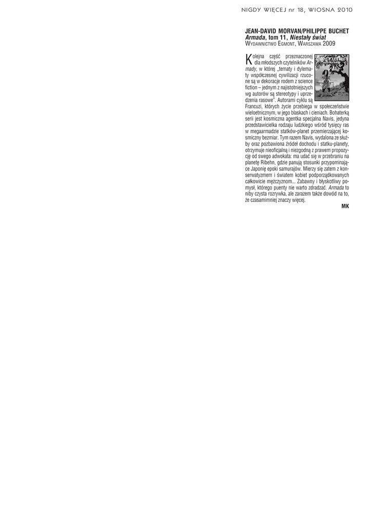 NIGDY WIĘCEJ nr 18, WIOSNA 2010 JEAN-DAVID MORVAN/PHILIPPE BUCHET Armada, tom 11, Niestały świat WYDAWNICTWO EGMONT, WARSZAWA 2009 olejna część przeznaczonej K dla młodszych czytelników Armady, w której „tematy i dylema- ty współczesnej cywilizacji rzucone są w dekoracje rodem z science fiction – jednym z najistotniejszych wg autorów są stereotypy i uprzedzenia rasowe”. Autorami cyklu są Francuzi, których życie przebiega w społeczeństwie wieloetnicznym, w jego blaskach i cieniach. Bohaterką serii jest kosmiczna agentka specjalna Navis, jedyna przedstawicielka rodzaju ludzkiego wśród tysięcy ras w megaarmadzie statków-planet przemierzającej kosmiczny bezmiar. Tym razem Navis, wydalona ze służby oraz pozbawiona źródeł dochodu i statku-planety, otrzymuje nieoficjalną i niezgodną z prawem propozycję od swego adwokata: ma udać się w przebraniu na planetę Ribehn, gdzie panują stosunki przypominające Japonię epoki samurajów. Mierzy się zatem z konserwatyzmem i światem kobiet podporządkowanych całkowicie mężczyznom... Zabawny i błyskotliwy pomysł, którego puenty nie warto zdradzać. Armada to niby czysta rozrywka, ale zarazem także dowód na to, że czasamimniej znaczy więcej. MK