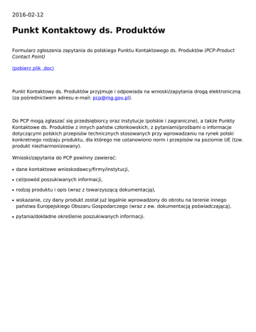 2016-02-12 Punkt Kontaktowy ds. Produktów Formularz zgłoszenia zapytania do polskiego Punktu Kontaktowego ds. Produktów (PCP-Product Contact Point) (pobierz plik .doc) Punkt Kontaktowy ds. Produktów przyjmuje i odpowiada na wnioski/zapytania drogą elektroniczną (za pośrednictwem adresu e-mail: [email protected]). Do PCP mogą zgłaszać się przedsiębiorcy oraz instytucje (polskie i zagraniczne), a także Punkty Kontaktowe ds. Produktów z innych państw członkowskich, z pytaniami/prośbami o informacje dotyczącymi polskich przepisów technicznych stosowanych przy wprowadzaniu na rynek polski konkretnego rodzaju produktu, dla którego nie ustanowiono norm i przepisów na poziomie UE (tzw. produkt niezharmonizowany). Wnioski/zapytania do PCP powinny zawierać: ● dane kontaktowe wnioskodawcy/firmy/instytucji, ● cel/powód poszukiwanych informacji, ● rodzaj produktu i opis (wraz z towarzyszącą dokumentacją), ● ● wskazanie, czy dany produkt został już legalnie wprowadzony do obrotu na terenie innego państwa Europejskiego Obszaru Gospodarczego (wraz z ew. dokumentacją poświadczającą), pytania/dokładne określenie poszukiwanych informacji.