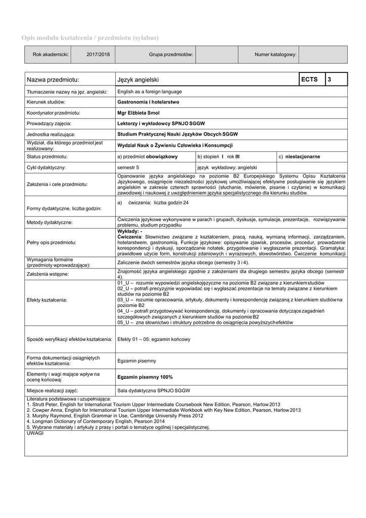Opis modułu kształcenia / przedmiotu (sylabus) Rok akademicki: 2017/2018 Numer katalogowy: Grupa przedmiotów: Nazwa przedmiotu: Język angielski Tłumaczenie nazwy na jęz. angielski: English as a foreign language Kierunek studiów: Gastronomia i hotelarstwo Koordynator przedmiotu: Mgr Elżbieta Smol Prowadzący zajęcia: Lektorzy i wykładowcy SPNJO SGGW Jednostka realizująca: Studium Praktycznej Nauki Języków Obcych SGGW Wydział, dla którego przedmiot jest realizowany: Wydział Nauk o Żywieniu Człowieka i Konsumpcji Status przedmiotu: a) przedmiot obowiązkowy b) stopień I rok III Cykl dydaktyczny: semestr 5 język wykładowy: angielski Założenia i cele przedmiotu: Opanowanie języka angielskiego na poziomie B2 Europejskiego Systemu Opisu Kształcenia Językowego, osiągnięcie niezależności językowej umożliwiającej efektywne posługiwanie się językiem angielskim w zakresie czterech sprawności (słuchanie, mówienie, pisanie i czytanie) w komunikacji zawodowej i naukowej z uwzględnieniem języka specjalistycznego dla kierunku studiów. a) ECTS 3 c) niestacjonarne ćwiczenia; liczba godzin 24 Formy dydaktyczne, liczba godzin: Metody dydaktyczne: Pełny opis przedmiotu: Wymagania formalne (przedmioty wprowadzające): Założenia wstępne: Efekty kształcenia: Ćwiczenia językowe wykonywane w parach i grupach, dyskusje, symulacje, prezentacje, rozwiązywanie problemu, studium przypadku Wykłady: Ćwiczenia: Słownictwo związane z kształceniem, pracą, nauką, wymianą informacji, zarządzaniem, hotelarstwem, gastronomią. Funkcje językowe: opisywanie zjawisk, procesów, procedur, prowadzenie korespondencji i dyskusji, sporządzanie notatek, przygotowanie i wygłaszanie prezentacji. Gramatyka: prawidłowe użycie form, konstrukcji zdaniowych i wyrazowych, słowotwórstwo. Ćwiczenie komunikacji Zaliczenie dwóch semestrów języka obcego (semestry 3 i 4). Znajomość języka angielskiego zgodnie z założeniami dla drugiego semestru języka obcego (semestr 4). 01_U – rozumie wypowiedzi angielskojęzyczne na poziomie B2 związane z kierunkiem studiów 02_U – potrafi precyzyjnie wypowiadać się i wygłaszać prezentacje na tematy związane z kierunkiem studiów na poziomie B2 03_U – rozumie opracowania, artykuły, dokumenty i korespondencję związaną z kierunkiem studiów na poziomie B2 04_U – potrafi przygotowywać korespondencję, dokumenty i opracowania dotyczące zagadnień szczegółowych związanych z kierunkiem studiów na poziomie B2 05_U – zna słownictwo i struktury potrzebne do osiągnięcia powyższych efektów Sposób weryfikacji efektów kształcenia: Efekty 01 – 05: egzamin końcowy Forma dokumentacji osiągniętych efektów kształcenia: Egzamin pisemny Elementy i wagi mające wpływ na ocenę końcową: Egzamin pisemny 100% Miejsce realizacji zajęć: Sala dydaktyczna SPNJO SGGW Literatura podstawowa i uzupełniająca: 1. Strutt Peter, English for International Tourism Upper Intermediate Coursebook New Edition, Pearson, Harlow 2013 2. Cowper Anna, English for International Tourism Upper Intermediate Workbook with Key New Edition, Pearson, Harlow 2013 3. Murphy Raymond, English Grammar in Use, Cambridge University Press 2012 4. Longman Dictionary of Contemporary English, Pearson 2014 5. Wybrane materiały i artykuły z prasy i portali o tematyce ogólnej i specjalistycznej. UWAGI Wskaźniki ilościowe charakteryzujące moduł/przedmiot: Szacunkowa sumaryczna liczba godzin pracy studenta (kontaktowych i pracy własnej) niezbędna dla osiągnięcia zakładanych efektów kształcenia - na tej podstawie należy wypełnić pole ECTS: 90 h Łączna liczba punktów ECTS, którą student uzyskuje na zajęciach wymagających bezpośredniego udziału nauczycieli akademickich: 1 ECTS Łączna liczba punktów ECTS, którą student uzyskuje w ramach zajęć o charakterze praktycznym, takich jak zajęcia laboratoryjne, projektowe, itp.: 1 ECTS Tabela zgodności kierunkowych efektów kształcenia z efektami przedmiotu: Nr /symbol efektu 01_U Wymienione w wierszu efekty kształcenia: rozumie wypowiedzi angielskojęzyczne na poziomie B2 związane z kierunkiem Odniesienie do efektów dla programu kształcenia na kierunku KP_U13 studiów 02_U 03_U potrafi precyzyjnie wypowiadać się i wygłaszać prezentacje na tematy związane z KP_U12 kierunkiem studiów na poziomie B2 KP_U13 rozumie opracowania, artykuły, dokumenty i korespondencję związaną z KP_U13 kierunkiem studiów na poziomie B2 04_U 05_U potrafi przygotowywać korespondencję, dokumenty i opracowania dotyczące KP_U12 zagadnień szczegółowych związanych z kierunkiem studiów na poziomie B2 KP_U13 zna słownictwo i struktury potrzebne do osiągnięcia powyższych efektów KP_U13 Opis modułu kształcenia / przedmiotu (sylabus) Rok akademicki: 2017/2018 Grupa przedmiotów: Numer katalogowy: Nazwa przedmiotu: Język francuski Tłumaczenie nazwy na jęz. angielski: French as a foreign language Kierunek studiów: Gastronomia i hotelarstwo Koordynator przedmiotu: Mgr Ewa Sikorska Prowadzący zajęcia: Lektorzy i wykładowcy SPNJO SGGW Jednostka realizująca: Studium Praktycznej Nauki Języków Obcych SGGW Wydział, dla którego przedmiot jest realizowany: Wydział Nauk o Żywieniu Człowieka i Konsumpcji Status przedmiotu: a) przedmiot obowiązkowy b) stopień I rok III Cykl dydaktyczny: semestr 5 język wykładowy: francuski Założenia i cele przedmiotu: Opanowanie języka francuskiego na poziomie B2 Europejskiego Systemu Opisu Kształcenia Językowego, osiągnięcie niezależności językowej umożliwiającej efektywne posługiwanie się językiem francuskim w zakresie czterech sprawności (słuchanie, mówienie, pisanie i czytanie) w komunikacji zawodowej i naukowej z uwzględnieniem języka specjalistycznego dla kierunku studiów. ECTS 3 c) niestacjonarne a) ćwiczenia; liczba godzin 24 Formy dydaktyczne, liczba godzin: Metody dydaktyczne: Pełny opis przedmiotu: Ćwiczenia językowe wyko