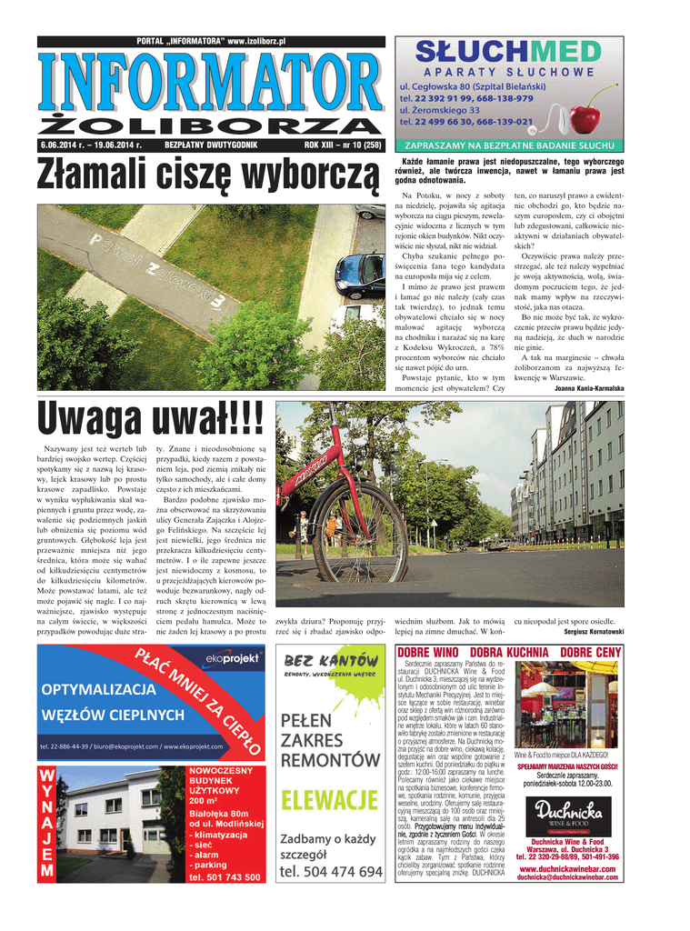 PORTAL „INFORMATORA” www.izoliborz.pl 6.06.2014 r. – 19.06.2014 r. BEZPŁATNY DWUTYGODNIK ROK XIII – nr 10 (258) Złamali ciszę wyborczą Każde łamanie prawa jest niedopuszczalne, tego wyborczego również, ale twórcza inwencja, nawet w łamaniu prawa jest godna odnotowania. Na Potoku, w nocy z soboty na niedzielę, pojawiła się agitacja wyborcza na ciągu pieszym, rewelacyjnie widoczna z licznych w tym rejonie okien budynków. Nikt oczywiście nie słyszał, nikt nie widział. Chyba szukanie pełnego poświęcenia fana tego kandydata na europosła mija się z celem. I mimo że prawo jest prawem i łamać go nie należy (cały czas tak twierdzę), to jednak temu obywatelowi chciało się w nocy malować agitację wyborczą na chodniku i narażać się na karę z Kodeksu Wykroczeń, a 78% procentom wyborców nie chciało się nawet pójść do urn. Powstaje pytanie, kto w tym momencie jest obywatelem? Czy ten, co naruszył prawo a ewidentnie obchodzi go, kto będzie naszym europosłem, czy ci obojętni lub zdegustowani, całkowicie nieaktywni w działaniach obywatelskich? Oczywiście prawa należy przestrzegać, ale też należy wypełniać je swoją aktywnością, wolą, świadomym poczuciem tego, że jednak mamy wpływ na rzeczywistość, jaka nas otacza. Bo nie może być tak, że wykroczenie przeciw prawu będzie jedyną nadzieją, że duch w narodzie nie ginie. A tak na marginesie – chwała żoliborzanom za najwyższą fekwencję w Warszawie. wiednim służbom. Jak to mówią lepiej na zimne dmuchać. W koń- cu nieopodal jest spore osiedle. Joanna Kania-Karmalska Uwaga uwał!!! Nazywany jest też werteb lub bardziej swojsko wertep. Częściej spotykamy się z nazwą lej krasowy, lejek krasowy lub po prostu krasowe zapadlisko. Powstaje w wyniku wypłukiwania skał wapiennych i gruntu przez wodę, zawalenie się podziemnych jaskiń lub obniżenia się poziomu wód gruntowych. Głębokość leja jest przeważnie mniejsza niż jego średnica, która może się wahać od kilkudziesięciu centymetrów do kilkudziesięciu kilometrów. Może powstawać latami, ale też może pojawić się nagle. I co najważniejsze, zjawisko występuje na całym świecie, w większości przypadków powodując duże stra- ty. Znane i nieodosobnione są przypadki, kiedy razem z powstaniem leja, pod ziemią znikały nie tylko samochody, ale i całe domy często z ich mieszkańcami. Bardzo podobne zjawisko można obserwować na skrzyżowaniu ulicy Generała Zajączka i Alojzego Felińskiego. Na szczęście lej jest niewielki, jego średnica nie przekracza kilkudziesięciu centymetrów. I o ile zapewne jeszcze jest niewidoczny z kosmosu, to u przejeżdżających kierowców powoduje bezwarunkowy, nagły odruch skrętu kierownicą w lewą stronę z jednoczesnym naciśnięciem pedału hamulca. Może to nie żaden lej krasowy a po prostu zwykła dziura? Proponuję przyjrzeć się i zbadać zjawisko odpo- Sergiusz Kornatowski DOBRE WINO DOBRA KUCHNIA DOBRE CENY Serdecznie zapraszamy Państwa do restauracji DUCHNICKA Wine & Food ul. Duchnicka 3, mieszczącej się na wydzielonym i odosobnionym od ulic terenie Instytutu Mechaniki Precyzyjnej. Jest to miejsce łączące w sobie restaurację, winebar oraz sklep z ofertą win różnorodną zarówno pod względem smaków jak i cen. Industrialne wnętrze lokalu, które w latach 60 stanowiło fabrykę zostało zmienione w restaurację o przyjaznej atmosferze. Na Duchnicką można przyjść na dobre wino, ciekawą kolację, degustację win oraz wspólne gotowanie z szefem kuchni. Od poniedziałku do piątku w godz.: 12:00-16:00 zapraszamy na lunche. Polecamy również jako ciekawe miejsce na spotkania biznesowe, konferencje firmowe, spotkania rodzinne, komunie, przyjęcia weselne, urodziny. Oferujemy salę restauracyjną mieszczącą do 100 osób oraz mniejszą, kameralną salę na antresoli dla 25 osób. Przygotowujemy menu indywidualnie, zgodnie z życzeniem Gości. W okresie letnim zapraszamy rodziny do naszego ogródka a na najmłodszych gości czeka kącik zabaw. Tym z Państwa, którzy chcieliby zorganizować spotkanie rodzinne oferujemy specjalną zniżkę. DUCHNICKA Wine & Food to miejsce DLA KAŻDEGO! SPEŁNIAMY MARZENIA NASZYCH GOŚCI! Serdecznie zapraszamy. poniedziałek-sobota 12.00-23.00. Duchnicka Wine & Food Warszawa, ul. Duchnicka 3 tel. 22 320-29-88/89, 501-491-396 www.duchnickawinebar.com [email protected] Członkowie Redakcji Redaktor Naczelny Moja ulica Zbigniew Duszewski tel. 604-132-673 [email protected] Beata Zasada−Wysocka tel. 500-126-672 [email protected] Ewa Zaborowska tel. 606-318-117 [email protected] Joanna Kania-Karmalska tel. 516-187-684 [email protected] Izabella Anna Zaremba tel. 22 839-42-47 Fot. Sergiusz Kornatowski Jest kwiecień 1945. Zimno. Ocaleni z wojny wracają z tobołkami, zabiedzone twarze i ubrania. Szukają dachu nad głową. Ulica wypełniona zaglądającymi do domów i piwnic ludźmi. Może jest jakieś pomieszczenie, gdzie można wejść i zostać. Na ul. Bohomolca zburzonych zostało 9 domów, 2 zostały spalone, a losy ich mieszkańców były tragiczne. Pani Klimkiewicz wywieziona do Ravensbruck przeżyła obóz, by wrócić do domu wskazać grób męża Romana Klimkiewicza. Wśród wywiezionych w pierwszym transporcie do tego obozu 22 września 1941 r., była inż. chemik Halina Starczewska-Choryżyna, dzia- łaczka ZWZ i nie wróciła. Nie wrócili też dwaj oficerowie z listy katyńskiej. Ulica ta, zabudowana w latach trzydziestych, nazwana imieniem Adolfa Dygasińskiego, autora książek przyrodniczych, jest jedną w wachlarzu ulic powstałych w tamtym czasie na tak zwanym Dolnym Żoliborzu. Dzisiaj informuje się, że ulica ta jest na Żoliborzu Dziennikarskim. Ale w kwietniu 1945 r. listonosz przyniósł korespondencję w błekinobrudnych kopertach adresowaną: Dolny Żoliborz Jaśnie Wielmożny Pan, Jaśnie Wielmożna Pani, chociaż już nikt nie miał nic z wielkopańskości. Zaraz potem na długie 