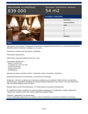 Warszawa, Śródmieście, Mostowa MIESZKANIE na SPRZEDAŻ 54 m2 839 000 14188/1708/OMS Secondary TenementHouse 1950 2 2 3 Separate Opis Oferujemy na sprzedaż 3 pokojowe mieszkanie w zabytkowej kamienicy na warszawskiej Starówce. Niewiele takich mieszkań znajduje się na rynku. Kamienica wpisana jest do rejestru zabytków. Mieszkanie dwustronne. Mieszkanie posiada wyjątkowy klimat i urok. Mieszkanie składa się z: - salonu (14,94 m2) - 2 sypialni (11,79 i 9,2 m2) - kuchni (6,24 m2) - łazienki (4,8 m2) - przedpokoju Ekspozycja pokoi: południe (salon i sypialnia), północ (kuchnia i sypialnia). Możliwość parkowania samochodu na strzeżonym parkingu. Budynek, w którym znajduje się mieszkanie oddalony jest zaledwie 'kilka kroków' od Kościoła Dominikanów. Niedaleko znajduje się również Ogród Krasińskich oraz Skwer 1 Dywizji Pancernej WP oraz Multimedialny Park Fontann. Bardzo dobry punkt komunikacyjny- 2 minuty pieszo przystanki autobusowe. W najbliższej okolicy znajduje się wiele punktów usługowych i handlowych- sklepy spożywcze, restauracje, galerie sztuki oraz wiele zabytków Starego Miasta. Polecam i zapraszam na prezentację. Treść niniejszego ogłoszenia nie stanowi oferty handlowej w rozumieniu Kodeksu Cywilnego. Emidom Julia Rodzewicz tel. 797 597 043 tel. 22 566 30 40 email: [email protected] Emidom Powered by TCPDF (www.tcpdf.org)