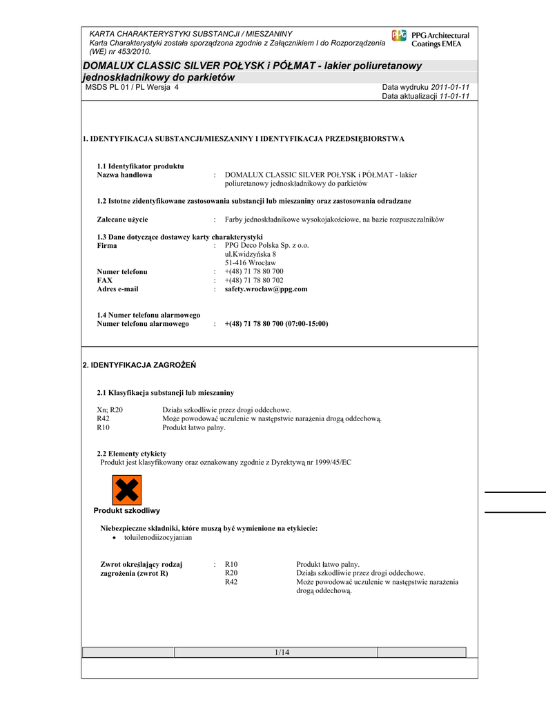 KARTA CHARAKTERYSTYKI SUBSTANCJI / MIESZANINY Karta Charakterystyki zosta a sporz dzona zgodnie z Za cznikiem I do Rozporz dzenia (WE) nr 453/2010. DOMALUX CLASSIC SILVER PO YSK i PÓ MAT - lakier poliuretanowy jednosk adnikowy do parkietów MSDS PL 01 / PL Wersja 4 Data wydruku 2011-01-11 Data aktualizacji 11-01-11 1. IDENTYFIKACJA SUBSTANCJI/MIESZANINY I IDENTYFIKACJA PRZEDSI BIORSTWA 1.1 Identyfikator produktu Nazwa handlowa : DOMALUX CLASSIC SILVER PO YSK i PÓ MAT - lakier poliuretanowy jednosk adnikowy do parkietów 1.2 Istotne zidentyfikowane zastosowania substancji lub mieszaniny oraz zastosowania odradzane : Zalecane u ycie Farby jednosk adnikowe wysokojako ciowe, na bazie rozpuszczalników 1.3 Dane dotycz ce dostawcy karty charakterystyki : PPG Deco Polska Sp. z o.o. Firma ul.Kwidzy ska 8 51-416 Wroc aw : +(48) 71 78 80 700 Numer telefonu : +(48) 71 78 80 702 FAX : [email protected] Adres e-mail 1.4 Numer telefonu alarmowego Numer telefonu alarmowego : +(48) 71 78 80 700 (07:00-15:00) 2. IDENTYFIKACJA ZAGRO E 2.1 Klasyfikacja substancji lub mieszaniny Xn; R20 R42 R10 Dzia a szkodliwie przez drogi oddechowe. Mo e powodowa uczulenie w nast pstwie nara enia drog oddechow . Produkt atwo palny. 2.2 Elementy etykiety Produkt jest klasyfikowany oraz oznakowany zgodnie z Dyrektyw nr 1999/45/EC Produkt szkodliwy Niebezpieczne sk adniki, które musz by wymienione na etykiecie: toluilenodiizocyjanian Zwrot okre laj cy rodzaj zagro enia (zwrot R) : R10 R20 R42 Produkt atwo palny. Dzia a szkodliwie przez drogi oddechowe. Mo e powodowa uczulenie w nast pstwie nara enia drog oddechow . 1/14 KARTA CHARAKTERYSTYKI SUBSTANCJI / MIESZANINY Karta Charakterystyki zosta a sporz dzona zgodnie z Za cznikiem I do Rozporz dzenia (WE) nr 453/2010. DOMALUX CLASSIC SILVER PO YSK i PÓ MAT - lakier poliuretanowy jednosk adnikowy do parkietów MSDS PL 01 / PL Wersja 4 Data wydruku 2011-01-11 Data aktualizacji 11-01-11 : Zwroty bezpiecznego post powania - S S2 S45 Chroni przed dzie mi. W przypadku awarii lub je eli le si poczujesz, niezw ocznie zasi gnij porady lekarza - je eli to mo liwe, poka etykiet . Stosowa wy cznie w dobrze wentylowanych pomieszczeniach. S51 : Zwrot(y) P Zawiera izocyjaniany - zapoznaj si z instrukcj dostarczon przez producenta. 2.3 Inne zagro enia Brak dost pnej informacji. 3. SK AD I INFORMACJA O SK ADNIKACH 3.2 Mieszaniny Sk adniki Nr EC Nr CAS octan butylu 204-658-1 123-86-4 ksylen 215-535-7 1330-20-7 etylobenzen 202-849-4 toluilenodiizocyjanian Uwaga DSD Klasyfikacja R10 R66 R67 CLP Klasyfikacja St enie Flam. Liq.3; H226 STOT SE3; H336 >=10.00 - <15.00% R10 Xn; R20/21 Xi; R38 Flam. Liq.3; H226 Acute Tox.4; H332 Acute Tox.4; H312 Skin Irrit.2; H315 >=2.50 - <10.00% 100-41-4 F; R11 Xn; R20 Flam. Liq.2; H225 Acute Tox.4; H332 >=1.00 - <2.50% 247-722-4 26471-62-5 Nota C Carc.Cat.3; R40 T+; R26 Xi; R36/37/38 R42/43 R52, R53 2; H351 >=0.10 - <1.00% Acute Tox.2; H330 Eye Irrit.2; H319 STOT SE3; H335 Skin Irrit.2; H315 Resp. Sens.1; H334 Skin Sens.1; H317 Aquatic Chronic3; H412 4-izocyjanian toluenosulfonylu 223-810-8 4083-64-1 R14 Xi; R36/37/38 R42 Eye Irrit.2; H319 STOT SE3; H335 Skin Irrit.2; H315 Resp. Sens.1; H334 >=0.10 - <1.00% octan 2-metoksy-1metyloetylu 203-603-9 108-65-6 R10 Flam. Liq.3; H226 >=25.00 - <50.00% Nota C 2/14 KARTA CHARAKTERYSTYKI SUBSTANCJI / MIESZANINY Karta Charakterystyki zosta a sporz dzona zgodnie z Za cznikiem I do Rozporz dzenia (WE) nr 453/2010. DOMALUX CLASSIC SILVER PO YSK i PÓ MAT - lakier poliuretanowy jednosk adnikowy do parkietów MSDS PL 01 / PL Wersja 4 octan 2-metoksypropylu Data wydruku 2011-01-11 Data aktualizacji 11-01-11 274-724-2 70657-70-4 R10 Repr.Cat.2; R61 Xi; R37 Flam. Liq.3; H226 Repr.1B; H360D STOT SE3; H335 >=0.10 - <0.50% * Lista Kandydacka Substancji o Du ym Znaczeniu dla Autoryzacji Producent wyrobu deklaruje, e dla zwrotów R niewymienionych w punkcie 3 ca kowita zawarto przekracza warto ci granicznych. substancji nie Je eli pojawia si wiele substancji o jednakowych identyfikatorach, to jednak ró ni si one w asno ciami niebezpiecze stwa np. punkt zap onu. 4. PIERWSZA POMOC 4.1 Opis rodków pierwszej pomocy : Porady ogólne Kontakt z oczami : Kontakt przez skór : Wdychanie : Po kni cie : Oparzenia : W przypadku utrzymuj cych si objawów lub jakichkolwiek w tpliwo ci zasi gn porady medycznej. Nigdy nie podawa niczego doustnie osobie nieprzytomnej. Przep ukiwa otwarte oczy obficie czyst , wie wod przynajmniej przez 10 minut. Usun szk a kontaktowe. Zasi gn porady medycznej. Natychmiast zdj ska one ubranie. Przemy skór wod z myd em. NIE STOSOWA rozpuszczalników lub rozcie czalników. Wynie na wie e powietrze. Zapewni poszkodowanemu ciep o i spokój. W przypadku nieregularnego lub zatrzymanego oddechu zastosowa sztuczne oddychanie. Osobie nieprzytomnej zapewni pozycj bezpieczn - "boczn ustalon " i zasi gn porady medycznej. W razie przypadkowego po kni cia niezw ocznie zapewni opiek medyczn . Pozostawi w spokoju. NIE prowokowa wymiotów. W przypadku gdy zabrudzenia na ubraniu zapal si , sp uka du ilo ci wody. ci gn / usun lu n odzie . Nie usuwa odzie y, która jest stopiona ze skór .Uzyska pomoc lekarsk . 4.2 Najwa niejsze ostre i opó nione objawy oraz skutki nara enia W przypadku awarii lub je eli le si poczujesz, niezw ocznie zasi gnij porady lekarza - je eli to mo liwe, poka etykiet Przedstawi lekarzowi do czon Kart Charakterystyki produktu. 4.3 Wskazanie natychmiastowej opieki lekarskiej i potrzebnego specjalnego traktowania Nieprzytomnej osobie nigdy nie podawa nic doustnie. Leczy objawowo 5. POST POWANIE W PRZYPADKU PO ARU 5.1 rodki ga nicze Odpowiednie rodki ga nicze rodki ga nicze, które nie mog by u yte ze wzgl dów bezpiecze stwa : : Stosowa zraszanie wod , piany alkoholoodporne, proszki ga nicze lub dwutlenek w gla. Ch odzi zbiorniki i ich otoczenie poprzez zraszanie wod . NIE STOSOWA strumieni wodnych. 3/14 KARTA CHARAKTERYSTYKI SUBSTANCJI / MIESZANINY Karta Charakterystyki zosta a sporz dzona zgodnie z Za cznikiem I d