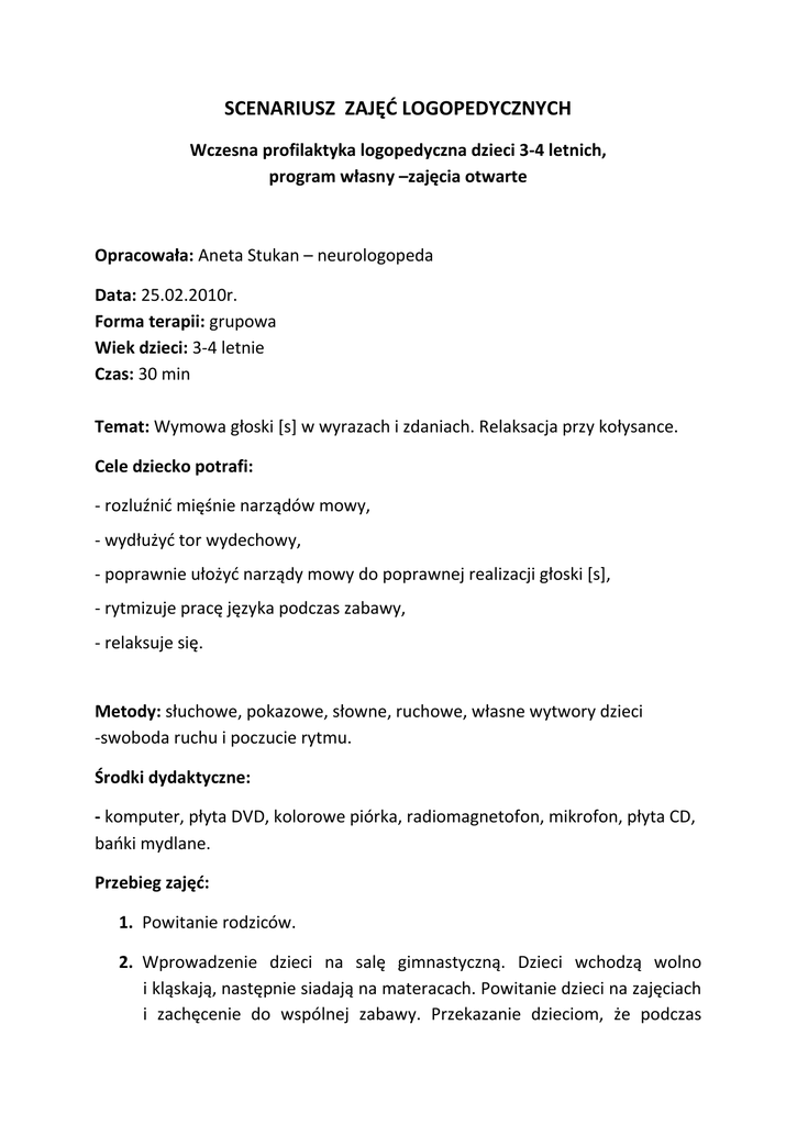SCENARIUSZ ZAJĘĆ LOGOPEDYCZNYCH Wczesna profilaktyka logopedyczna dzieci 3-4 letnich, program własny –zajęcia otwarte Opracowała: Aneta Stukan – neurologopeda Data: 25.02.2010r. Forma terapii: grupowa Wiek dzieci: 3-4 letnie Czas: 30 min Temat: Wymowa głoski [s] w wyrazach i zdaniach. Relaksacja przy kołysance. Cele dziecko potrafi: - rozluźnić mięśnie narządów mowy, - wydłużyć tor wydechowy, - poprawnie ułożyć narządy mowy do poprawnej realizacji głoski [s], - rytmizuje pracę języka podczas zabawy, - relaksuje się. Metody: słuchowe, pokazowe, słowne, ruchowe, własne wytwory dzieci -swoboda ruchu i poczucie rytmu. Środki dydaktyczne: - komputer, płyta DVD, kolorowe piórka, radiomagnetofon, mikrofon, płyta CD, bańki mydlane. Przebieg zajęć: 1. Powitanie rodziców. 2. Wprowadzenie dzieci na salę gimnastyczną. Dzieci wchodzą wolno i kląskają, następnie siadają na materacach. Powitanie dzieci na zajęciach i zachęcenie do wspólnej zabawy. Przekazanie dzieciom, że podczas różnych zabaw będą nas obserwować ich rodzice, a w nagrodę usłyszymy wielkie brawa. 3. W czasie oglądania filmu DVD, dzieci ćwiczą i usprawniają aparat artykulacyjny. Następnie podczas swobody ruchowej dzieci dmuchają na kolorowe piórka, opadające z góry, wydłużając w ten sposób swój tor wydechowy. Logopeda z udziałem nauczycieli aktywnie uczestniczą w zajęciach i pomagają dzieciom demonstrując poprawność dmuchania na piórka tak, aby nie opadło zbyt szybko na dywan. 4. Po krótkiej zabawie dzieci siadają na dywanie w siadzie skrzyżnym i obserwują logopedę, która demonstruje syczenie węża sssss i poprawną wymowę głoski [s] w sylabach (powtórzenie z dwóch poprzednich zajęć). Dzieci powtarzają za logopedą kolejność ćwiczeń z użyciem palca wskazującego. W linii poziomej przysuwamy palec do ząbków tak, aby języczek nie mógł się wydostać na zewnątrz. 5. Następnie dzieci w siadzie dowolnym kląskają i klaszczą rytmicznie: - raz, dwa -dotykanie swoich nóżek, - raz, dwa, trzy –klaskanie w dłonie 6. W czasie relaksacji, dzieci słuchają i śpiewają razem z logopedą kołysankę „A…, kotki dwa”, kołysząc się układają swoją głowę na złożonych dłoniach. Logopeda daje mikrofon, każdemu dziecku, które wyraża chęć śpiewania. Podkład muzyczny jest z linią melodyczną, co wpływa na ułatwienie i dowartościowanie dziecka podczas śpiewu. W czasie wybrzmiewania samogłoski [a], dzieci ponownie wydłużają swój tor wydechowy. 7. W końcowym etapie zajęć, dzieci wstają i odsuwają się od siebie, mniej więcej na odległość wyciągnięcia swojej ręki. Logopeda pomaga dzieciom w znalezieniu sobie miejsca do kolejnej zabawy. Następnie każde dziecko otrzymuje bańki mydlane i zaczyna się szaleństwo mydlane. 8. Pożegnanie się z dziećmi. 9. Krótkie omówienie zajęć. Pożegnanie się z rodzicami dzieci.