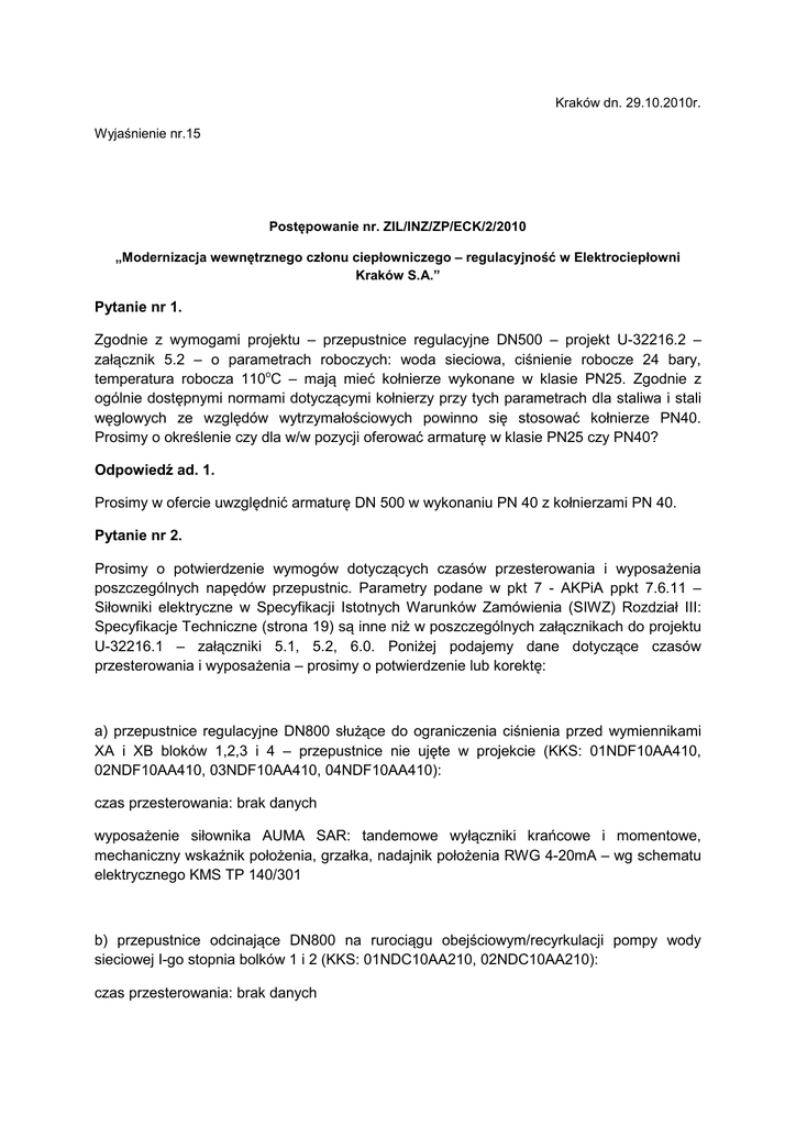 Kraków dn. 29.10.2010r. Wyjaśnienie nr.15 Postępowanie nr. ZIL/INZ/ZP/ECK/2/2010 „Modernizacja wewnętrznego członu ciepłowniczego – regulacyjność w Elektrociepłowni Kraków S.A.” Pytanie nr 1. Zgodnie z wymogami projektu – przepustnice regulacyjne DN500 – projekt U-32216.2 – załącznik 5.2 – o parametrach roboczych: woda sieciowa, ciśnienie robocze 24 bary, temperatura robocza 110oC – mają mieć kołnierze wykonane w klasie PN25. Zgodnie z ogólnie dostępnymi normami dotyczącymi kołnierzy przy tych parametrach dla staliwa i stali węglowych ze względów wytrzymałościowych powinno się stosować kołnierze PN40. Prosimy o określenie czy dla w/w pozycji oferować armaturę w klasie PN25 czy PN40? Odpowiedź ad. 1. Prosimy w ofercie uwzględnić armaturę DN 500 w wykonaniu PN 40 z kołnierzami PN 40. Pytanie nr 2. Prosimy o potwierdzenie wymogów dotyczących czasów przesterowania i wyposażenia poszczególnych napędów przepustnic. Parametry podane w pkt 7 - AKPiA ppkt 7.6.11 – Siłowniki elektryczne w Specyfikacji Istotnych Warunków Zamówienia (SIWZ) Rozdział III: Specyfikacje Techniczne (strona 19) są inne niż w poszczególnych załącznikach do projektu U-32216.1 – załączniki 5.1, 5.2, 6.0. Poniżej podajemy dane dotyczące czasów przesterowania i wyposażenia – prosimy o potwierdzenie lub korektę: a) przepustnice regulacyjne DN800 służące do ograniczenia ciśnienia przed wymiennikami XA i XB bloków 1,2,3 i 4 – przepustnice nie ujęte w projekcie (KKS: 01NDF10AA410, 02NDF10AA410, 03NDF10AA410, 04NDF10AA410): czas przesterowania: brak danych wyposażenie siłownika AUMA SAR: tandemowe wyłączniki krańcowe i momentowe, mechaniczny wskaźnik położenia, grzałka, nadajnik położenia RWG 4-20mA – wg schematu elektrycznego KMS TP 140/301 b) przepustnice odcinające DN800 na rurociągu obejściowym/recyrkulacji pompy wody sieciowej I-go stopnia bolków 1 i 2 (KKS: 01NDC10AA210, 02NDC10AA210): czas przesterowania: brak danych wyposażenie siłownika AUMA SA: mechaniczny wskaźnik położenia, grzałka, magnetyczny nadajnik położenia MWG 4-20mA, moduł AUMATIC AC01.1 – wersja standardowa – wg schematu elektrycznego KMS TP 180/001 ACP 11F1-2M0CA-004 c) przepustnice regulacyjne DN500 na rurociągu tłocznym pompy wody sieciowej I-go stopnia (KKS: 01NDC12AA202, 12NDC13AA202, 02NDC11AA202, 03NDC11AA202, 03NDC12AA202, 03NDC13AA202, 04NDC11AA202) czas przesterowania: brak danych wyposażenie siłownika AUMA SAR: mechaniczny wskaźnik położenia, grzałka, magnetyczny nadajnik położenia MWG 4-20mA, moduł AUMATIC AC01.1 – wyposażony w pozycjoner i tyrystorowe zabezpieczenie silnika – wg schematu elektrycznego KMS TP 180/001 ACP 11A1-2M0CA-005 d) przepustnice regulacyjne DN500 na rurociągu tłocznym pompy wody sieciowej II-go stopnia (KKS: 03NDC21AA202, 04NDC21AA202): czas przesterowania: brak danych wyposażenie siłownika AUMA SAR: mechaniczny wskaźnik położenia, grzałka, magnetyczny nadajnik położenia MWG 4-20mA, moduł AUMATIC AC01.1 – wyposażony w pozycjoner i tyrystorowe zabezpieczenie silnika – wg schematu elektrycznego KMS TP 180/001 ACP 11A1-2M0CA-005 e) przepustnice regulacyjne DN150 na rurociągu tłocznym pompy wody uzupełniającej (KKS: 12NDJ93AA401): czas przesterowania: brak danych wyposażenie siłownika AUMA SAR: mechaniczny wskaźnik położenia, grzałka, magnetyczny nadajnik położenia MWG 4-20mA, moduł AUMATIC AC01.1 – wyposażony w pozycjoner i tyrystorowe zabezpieczenie silnika – wg schematu elektrycznego KMS TP 180/001 ACP 11A1-2M0CA-005 Odpowiedź ad.2. Dla przepustnic regulacyjnych DN800 służące do ograniczenia ciśnienia przed wymiennikami XA i XB bloków 1,2,3 i 4 – przepustnice nie ujęte w projekcie (KKS: 01NDF10AA410, 02NDF10AA410, 03NDF10AA410, 04NDF10AA410): czas przesterowania: 60 sekund wyposażenie siłownika AUMA SAR: tandemowe wyłączniki krańcowe i momentowe, mechaniczny wskaźnik położenia, grzałka, nadajnik położenia RWG 4-20mA – wg schematu elektrycznego KMS TP 140/301 Dla przepustnic odcinających DN800 na rurociągu obejściowym/recyrkulacji pompy wody sieciowej I-go stopnia bloków 1 i 2 (KKS: 01NDC10AA210, 02NDC10AA210): czas przesterowania: zgodnie z projektem nr U -32216.1 załącznik 6.0 czas od 150 do 240 sekund wyposażenie siłownika AUMA SA: mechaniczny wskaźnik położenia, grzałka, magnetyczny nadajnik położenia MWG 4-20mA, moduł AUMATIC AC01.1 – wersja standardowa – wg schematu elektrycznego KMS TP 180/001 ACP 11F1-2M0CA-004 Dla przepustnic regulacyjnych DN500 na rurociągu tłocznym pompy wody sieciowej I-go stopnia (KKS: 01NDC12AA202, 12NDC13AA202, 02NDC11AA202, 03NDC11AA202, 03NDC12AA202, 03NDC13AA202, 04NDC11AA202) czas przesterowania: zgodnie z projektem nr U -32216.2 załącznik 5.1 czas 60 sekund wyposażenie siłownika AUMA SAR: mechaniczny wskaźnik położenia, grzałka, magnetyczny nadajnik położenia MWG 4-20mA, moduł AUMATIC AC01.1 – wyposażony w pozycjoner i tyrystorowe zabezpieczenie silnika – wg schematu elektrycznego KMS TP 180/001 ACP 11A1-2M0CA-005 Dla przepustnic regulacyjnych DN500 na rurociągu tłocznym pompy wody sieciowej II-go stopnia (KKS: 03NDC21AA202, 04NDC21AA202): czas przesterowania: zgodnie z projektem nr U -32216.2 załącznik 5.2 czas 60 sekund wyposażenie siłownika AUMA SAR: mechaniczny wskaźnik położenia, grzałka, magnetyczny nadajnik położenia MWG 4-20mA, moduł AUMATIC AC01.1 – wyposażony w pozycjoner i tyrystorowe zabezpieczenie silnika – wg schematu elektrycznego KMS TP 180/001 ACP 11A1-2M0CA-005 . Dla przepustnicy regulacyjnej DN150 na rurociągu tłocznym pompy wody uzupełniającej (KKS: 12NDJ93AA401): czas przesterowania: zgodnie z projektem nr U -32216.3 załącznik 6 czas 60 sekund wyposażenie siłownika AUMA SAR: mechaniczny wskaźnik położenia, grzałka, magnetyczny nadajnik położenia MWG 4-20mA, moduł AUMATIC AC01.1 – wyposażony w pozycjoner i tyrysto