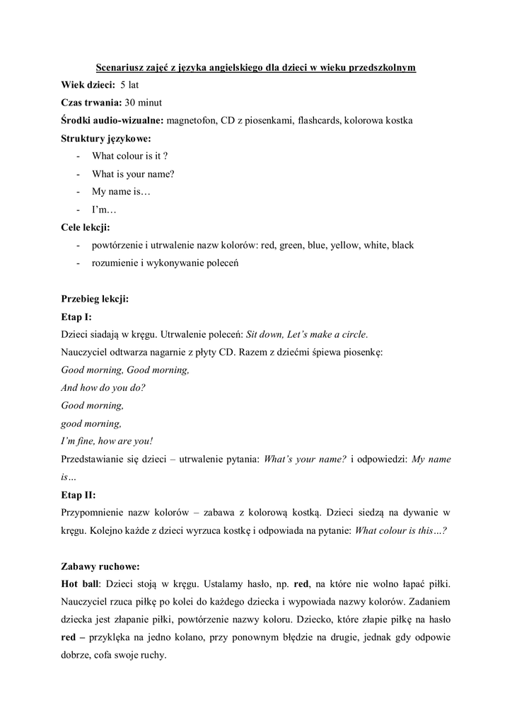 Scenariusz zajęć z języka angielskiego dla dzieci w wieku przedszkolnym Wiek dzieci: 5 lat Czas trwania: 30 minut Środki audio-wizualne: magnetofon, CD z piosenkami, flashcards, kolorowa kostka Struktury językowe: - What colour is it ? - What is your name? - My name is… - I’m… Cele lekcji: - powtórzenie i utrwalenie nazw kolorów: red, green, blue, yellow, white, black - rozumienie i wykonywanie poleceń Przebieg lekcji: Etap I: Dzieci siadają w kręgu. Utrwalenie poleceń: Sit down, Let’s make a circle. Nauczyciel odtwarza nagarnie z płyty CD. Razem z dziećmi śpiewa piosenkę: Good morning, Good morning, And how do you do? Good morning, good morning, I’m fine, how are you! Przedstawianie się dzieci – utrwalenie pytania: What’s your name? i odpowiedzi: My name is… Etap II: Przypomnienie nazw kolorów – zabawa z kolorową kostką. Dzieci siedzą na dywanie w kręgu. Kolejno każde z dzieci wyrzuca kostkę i odpowiada na pytanie: What colour is this…? Zabawy ruchowe: Hot ball: Dzieci stoją w kręgu. Ustalamy hasło, np. red, na które nie wolno łapać piłki. Nauczyciel rzuca piłkę po kolei do każdego dziecka i wypowiada nazwy kolorów. Zadaniem dziecka jest złapanie piłki, powtórzenie nazwy koloru. Dziecko, które złapie piłkę na hasło red – przyklęka na jedno kolano, przy ponownym błędzie na drugie, jednak gdy odpowie dobrze, cofa swoje ruchy. Zabawa po okręgu: Walking walking. Walking walking. Hop hop hop. Hop hop hop. Running running running. Running running running. Now let's stop. Now let's stop. Etap III: Dzieci wspólnie z nauczycielem mówią wierszyk na pożegnanie: Good-bye, good-bye, have a nice day, good-bye, good-bye, come again to play!