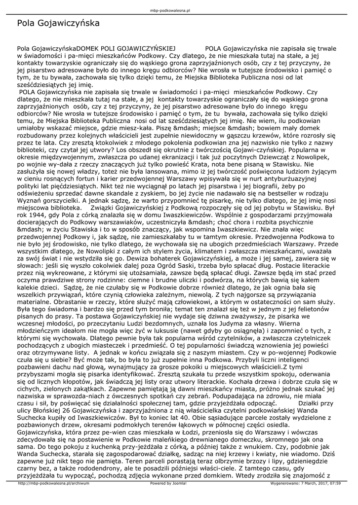 mbp-podkowalesna.pl Pola Gojawiczyńska Pola GojawiczyńskaDOMEK POLI GOJAWICZYŃSKIEJ POLA Gojawiczyńska nie zapisała się trwale w świadomości i pa-mięci mieszkańców Podkowy. Czy dlatego, że nie mieszkała tutaj na stałe, a jej kontakty towarzyskie ograniczały się do wąskiego grona zaprzyjaźnionych osób, czy z tej przyczyny, że jej pisarstwo adresowane było do innego kręgu odbiorców? Nie wrosła w tutejsze środowisko i pamięć o tym, że tu bywała, zachowała się tylko dzięki temu, że Miejska Biblioteka Publiczna nosi od lat sześćdziesiątych jej imię. POLA Gojawiczyńska nie zapisała się trwale w świadomości i pa-mięci mieszkańców Podkowy. Czy dlatego, że nie mieszkała tutaj na stałe, a jej kontakty towarzyskie ograniczały się do wąskiego grona zaprzyjaźnionych osób, czy z tej przyczyny, że jej pisarstwo adresowane było do innego kręgu odbiorców? Nie wrosła w tutejsze środowisko i pamięć o tym, że tu bywała, zachowała się tylko dzięki temu, że Miejska Biblioteka Publiczna nosi od lat sześćdziesiątych jej imię. Nie wiem, ilu podkowian umiałoby wskazać miejsce, gdzie miesz-kała. Piszę — miejsce — bowiem mały domek rozbudowany przez kolejnych właścicieli jest zupełnie niewidoczny w gąszczu krzewów, które rozrosły się przez te lata. Czy zresztą ktokolwiek z młodego pokolenia podkowian zna jej nazwisko nie tylko z nazwy biblioteki, czy czytał jej utwory? Los obszedł się okrutnie z twórczością Gojawi-czyńskiej. Popularna w okresie międzywojennym, zwłaszcza po udanej ekranizacji i tak już poczytnych Dziewcząt z Nowolipek, po wojnie wy-dała z rzeczy znaczących już tylko powieść Krata, nota bene pisaną w Stawisku. Nie zasłużyła się nowej władzy, toteż nie była lansowana, mimo iż jej twórczość poświęcona ludziom żyjącym w cieniu rosnących fortun i karier przedwojennej Warszawy wpisywała się w nurt antyburżuazyjnej polityki lat pięćdziesiątych. Nikt też nie wyciągnął po latach jej pisarstwa i jej biografii, żeby po odświeżeniu sprzedać dawne skandale z zyskiem, bo jej życie nie nadawało się na bestseller w rodzaju Wyznań gorszycielki. A jednak sądzę, że warto przypomnieć tę pisarkę, nie tylko dlatego, że jej imię nosi miejscowa biblioteka. Związki Gojawiczyńskiej z Podkową rozpoczęły się od jej pobytu w Stawisku. Był rok 1944, gdy Pola z córką znalazła się w domu Iwaszkiewiczów. Wspólnie z gospodarzami przyjmowała docierających do Podkowy warszawiaków, uczestniczyła — choć chora i rozbita psychicznie — w życiu Stawiska i to w sposób znaczący, jak wspomina Iwaszkiewicz. Nie znała więc przedwojennej Podkowy i, jak sądzę, nie zamieszkałaby tu w tamtym okresie. Przedwojenna Podkowa to nie było jej środowisko, nie tylko dlatego, że wychowała się na ubogich przedmieściach Warszawy. Przede wszystkim dlatego, że Nowolipki z całym ich stylem życia, klimatem i zwłaszcza mieszkańcami, uważała za swój świat i nie wstydziła się go. Dewiza bohaterek Gojawiczyńskiej, a może i jej samej, zawiera się w słowach: jeśli się wyszło cokolwiek dalej poza Ogród Saski, trzeba było spłacać dług. Postacie literackie przez nią wykreowane, z którymi się utożsamiała, zawsze będą spłacać długi. Zawsze będą im stać przed oczyma prawdziwe strony rodzinne: ciemne i brudne uliczki i podwórza, na których bawią się kałem kalekie dzieci. Sądzę, że nie czułaby się w Podkowie dobrze również dlatego, że jak ognia bała się wszelkich przywiązań, które czynią człowieka zależnym, niewolą. Z tych najgorsze są przywiązania materialne. Obrastanie w rzeczy, które służyć mają człowiekowi, a którym w ostateczności on sam służy. Była tego świadoma i bardzo się przed tym broniła; temat ten znalazł się też w jednym z jej felietonów pisanych do prasy. Ta postawa Gojawiczyńskiej nie wydaje się dziwna zważywszy, że pisarka we wczesnej młodości, po przeczytaniu Ludzi bezdomnych, uznała los Judyma za własny. Wierna młodzieńczym ideałom nie mogła więc żyć w luksusie (nawet gdyby go osiągnęła) i zapomnieć o tych, z którymi się wychowała. Dlatego pewnie była tak popularna wśród czytelników, a zwłaszcza czytelniczek pochodzących z ubogich miasteczek i przedmieść. O tej popularności świadczą wznowienia jej powieści oraz otrzymywane listy. A jednak w końcu związała się z naszym miastem. Czy w po-wojennej Podkowie czuła się u siebie? Być może tak, bo była to już zupełnie inna Podkowa. Przybyli liczni inteligenci pozbawieni dachu nad głową, wynajmujący za grosze pokoiki u miejscowych właścicieli.Z tymi przybyszami mogła się pisarka identyfikować. Zresztą szukała tu przede wszystkim spokoju, oderwania się od licznych kłopotów, jak świadczą jej listy oraz utwory literackie. Kochała drzewa i dobrze czuła się w cichych, zielonych zakątkach. Zapewne pamiętają ją dawni mieszkańcy miasta, próżno jednak szukać jej nazwiska w sprawozda-niach z ówczesnych spotkań czy zebrań. Podupadająca na zdrowiu, nie miała czasu i sił, by poświęcać się działalności społecznej tam, gdzie przyjeżdżała odpocząć. Działki przy ulicy Błońskiej 26 Gojawiczyńska i zaprzyjaźniona z nią właścicielka czytelni podkowiańskiej Wanda Suchecka kupiły od Iwaszkiewiczów. Był to koniec lat 40. Obie sąsiadujące parcele zostały wydzielone z pozbawionych drzew, okresami podmokłych terenów łąkowych w północnej części osiedla. Gojawiczyńska, która przez pe-wien czas mieszkała w Łodzi, przeniosła się do Warszawy i wówczas zdecydowała się na postawienie w Podkowie maleńkiego drewnianego domeczku, skromnego jak ona sama. Do tego pokoju z kuchenką przy-jeżdżała z córką, a później także z wnukiem. Czy, podobnie jak Wanda Suchecka, starała się zagospodarować działkę, sadząc na niej krzewy i kwiaty, nie wiadomo. Dziś zapewne już ni