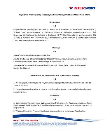 Regulamin Promocji dla posiadaczy kart kredytowych Citibank MasterCard World Organizator §1 Organizatorem promocji jest INTERSPORT POLSKA S.A. z siedzibą w Cholerzynie, Cholerzyn 382, 32-060 Liszki, zarejestrowaną w Krajowym Rejestrze Sądowym prowadzonym przez Sąd Rejonowy dla Krakowa Śródmieście w Krakowie XI Wydział Gospodarczy pod numerem KRS 216182, o numerze NIP 676-001-65-53, o numerze REGON 003900187, o kapitale zakładowym 1.393.333,40 PLN wpłaconym w całości. Definicje §2 „Bank" - Bank Handlowy w Warszawie S.A. „Karta Kredytowa Citibank MasterCard World” Karta w rozumieniu Regulaminu Kart Kredytowych Citibank Banku Handlowego w Warszawie S.A. „Regulamin" oznacza niniejszy regulamin Promocji dla posiadaczy Kart Kredytowych MasterCard World. Czas trwania, terytorium i sposób prowadzenia Promocji §3 1. Promocja prowadzona jest na terytorium Rzeczpospolitej Polskiej w terminie od 1.06 do 10.06.2012 roku. 2. Promocja prowadzona jest w oparciu o niniejszy Regulamin i powszechnie obowiązujące przepisy prawa. Uczestnicy §4 1. Uczestnikami Promocji mogą byd wyłącznie pełnoletnie osoby fizyczne posiadające Kartę Kredytową Citibank MasterCard World wydaną przez Bank. Wzór karty stanowi załącznik do Regulaminu. 2. Wszyscy Uczestnicy Promocji podlegają postanowieniom niniejszego Regulaminu. Siedziba: INTERSPORT Polska S.A. Cholerzyn 382, 32-060 LISZKI, tel: +48 12 44 48 100, 44 48 103, fax: +48 12 44 48 000, Magazyn: adres dostaw j.w. oraz tel: +48 12 44 48 853, fax: +48 12 44 48 850. Dane firmy: Sąd Rejonowy dla Krakowa Śródmieścia Wydział XI Gospodarczy KRS 0000216182, Wpłacony kapitał zakładowy 1.393.333,40 zł; Regon 003900187, NIP 676-001-65-53, PEKAO Bank Pekao SA 48124047221111000048552358, www.intersport.pl. Zarząd: Artur Mikołajko, Sławomir Gil 3.Przystąpienie Uczestnika do Promocji jest równoznaczne z akceptacją treści Regulaminu. Zasady Promocji §5 1. W Promocji może wziąd udział Klient, który dokona zapłaty za towar podlegający promocji kartą kredytową Citibank MasterCard World w dowolnym sklepie INTERSPORT zlokalizowanym na ternie Polski, w terminie od 1.06 do 10.06. 2012 (włącznie); 2. W ramach promocji klient może otrzymad rabat 15% na buty (sportowe, piłkarskie, trekkingowe, buty do wody), znajdujące się w czasie trwania promocji w ofercie handlowej INTERSPORT. Promocją nie są objęte sandały i klapki. 3. Rabat jest liczony od ceny pierwotnej towaru – bez uwzględnienia przecen i rabatów. 4. Promocja nie łączy się z innymi promocjami obowiązującymi w tym czasie w sklepie z wyjątkiem promocji z kartą CITI tzn. klienci, którzy w czasie trwania promocji dokonają zakupu za który zapłacą kartą Kredytową Citibank MasterCard World za każde wydane 200zł otrzymają przy kasie bon o wartości 10zł. 5. Promocja nie dotyczy zakupów realizowanych w sklepie internetowym INTERSPORT (http://esklep.intersport.pl/). 6. Płatnośd za produkty zakupione w ramach Promocji może byd realizowana poprzez bony sytemu lojalnościowego programu INTERSPORT dla Aktywnych w takim przypadku promocyjny rabat liczony jest przed zastosowaniem bonu lojalnościowego. Promocja z kartą CITI jest naliczana po zastosowaniu powyższego czyli po odjęciu od aktualnej ceny sprzedaży produktu rabatu i bonu lojalnościowego. Zwroty towarów §6 1. Uczestnik Promocji ma prawo zwrócid towar zakupiony podczas Promocji do 14 dni od daty zakupu, pod warunkiem, że nie nosi on śladów używania i jest zwracany w oryginalnym opakowaniu. 2. W przypadku zwrotu lub pozytywnie rozpatrzonej reklamacji towaru, który został zakupiony w ramach Promocji, Uczestnik Promocji otrzymuje równowartośd kwoty na paragonie. 3. W przypadku zwrotu towaru po zakooczeniu Promocji, Uczestnik Promocji może zakupid nowy towar w cenie obowiązującej w sklepie w dniu dokonania kolejnego zakupu. 4. Uczestnik Promocji jest uprawniony do wymiany towaru zakupionego podczas Promocji w Siedziba: INTERSPORT Polska S.A. Cholerzyn 382, 32-060 LISZKI, tel: +48 12 44 48 100, 44 48 103, fax: +48 12 44 48 000, Magazyn: adres dostaw j.w. oraz tel: +48 12 44 48 853, fax: +48 12 44 48 850. Dane firmy: Sąd Rejonowy dla Krakowa Śródmieścia Wydział XI Gospodarczy KRS 0000216182, Wpłacony kapitał zakładowy 1.393.333,40 zł; Regon 003900187, NIP 676-001-65-53, PEKAO Bank Pekao SA 48124047221111000048552358, www.intersport.pl. Zarząd: Artur Mikołajko, Sławomir Gil terminie 14 dni od daty zakupu, również po zakooczeniu Promocji. Wymiana jest możliwa wyłącznie jeżeli produkt nie jest zniszczony ani w żaden sposób użytkowany i dotyczy wyłącznie zmiany koloru lub rozmiaru. Postanowienia koocowe §7 1. Treśd niniejszego Regulaminu znajduje się na stronie internetowej Banku:www.online.citibank.pl oraz na www.intersport.pl oraz regulamin jest dostępny w sklepach INTERSPORT w trakcie trwania Promocji. 2. Osoby powiązane z Organizatorem nie mogą brad udziału w Promocji. 3. Wszelkie zapytania związane z Promocją powinny byd [email protected]. 4. Regulamin Promocji wchodzi w życie z dniem 1.06.2012 roku. kierowane Siedziba: INTERSPORT Polska S.A. Cholerzyn 382, 32-060 LISZKI, tel: +48 12 44 48 100, 44 48 103, fax: +48 12 44 48 000, Magazyn: adres dostaw j.w. oraz tel: +48 12 44 48 853, fax: +48 12 44 48 850. Dane firmy: Sąd Rejonowy dla Krakowa Śródmieścia Wydział XI Gospodarczy KRS 0000216182, Wpłacony kapitał zakładowy 1.393.333,40 zł; Regon 003900187, NIP 676-001-65-53, PEKAO Bank Pekao SA 48124047221111000048552358, www.intersport.pl. Zarząd: Artur Mikołajko, Sławomir Gil na adres