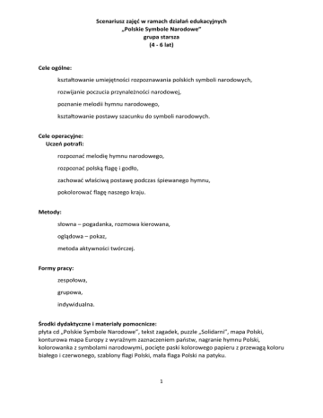 Scenariusz zajęć w ramach działań edukacyjnych „Polskie Symbole Narodowe” grupa starsza (4 -‐ 6 lat) Cele ogólne: kształtowanie umiejętności rozpoznawania polskich symboli narodowych, rozwijanie poczucia przynależności narodowej, poznanie melodii hymnu narodowego, kształtowanie postawy szacunku do symboli narodowych. Cele operacyjne: Uczeń potrafi: rozpoznać melodię hymnu narodowego, rozpoznać polską flagę i godło, zachować właściwą postawę podczas śpiewanego hymnu, pokolorować flagę naszego kraju. Metody: słowna – pogadanka, rozmowa kierowana, oglądowa – pokaz, metoda aktywności twórczej. Formy pracy: zespołowa, grupowa, indywidualna. Środki dydaktyczne i materiały pomocnicze: płyta cd „Polskie Symbole Narodowe”, tekst zagadek, puzzle „Solidarni”, mapa Polski, konturowa mapa Europy z wyraźnym zaznaczeniem państw, nagranie hymnu Polski, kolorowanka z symbolami narodowymi, pocięte paski kolorowego papieru z przewagą koloru białego i czerwonego, szablony flagi Polski, mała flaga Polski na patyku. 1 Przewidywany czas trwania zajęć: 45 minut Przebieg zajęć: 1. Powitanie dzieci (przewidywany czas: 2 minuty) Dzieci zostają przywitane przez nauczyciela i wprowadzone w tematykę spotkania. 2. Pokaz filmu: „Polskie Symbole Narodowe” (przewidywany czas: 7 minut) (http://www.pamiec.pl/historiawkolorach) 3. Rozmowa kierowana z dziećmi. (przewidywany czas: 4 minuty) Rozmowa na temat symboli narodowych inspirowana obejrzanym filmem połączona z krótkim quizem. Zadaniem dzieci jest zadecydować, czy dane zdanie jest prawdziwe, czy fałszywe. Zdania do quizu: a) polska flaga jest niebiesko-‐żółta. b) zwierzę, które występuje na godle Polski to biały orzeł. c) orła białego za znak swojego państwa wybrał Lech. d) polskim hymnem jest Mazurek Dąbrowskiego. e) polska flaga wisi na urzędach. f) wiersz „Polak Mały” zaczyna się od słów: Kto Ty jesteś. g) mieszkacie w niemieckiej ziemi. h) trzech braci Lech, Czech i Rus poszukiwało miejsca do zamieszkania. i) Lech odpoczywał pod parasolem. j) nazwą pierwszej stolicy Polski było Gniezno. k) biały symbolizuje czystość. l) czerwony symbolizuje krew przelaną przez Polaków w obronie Ojczyzny. m) teraz polski hymn, flaga i godło są pokazywane np. podczas zawodów sportowych. n) polskie godło można zobaczyć na mundurach policjantów. o) 2 maja świętujemy Święto Flagi. 4. Zabawa muzyczno-‐ruchowa. (przewidywany czas: 5 minut) Utrwalenie melodii hymnu Polski podczas zabawy. Dzieci maszerują po dywanie w rytm melodii. Gdy zabrzmią dźwięki hymnu, przyjmują odpowiednią postawę: stają na baczność. 5. „Głuchy telefon”. (przewidywany czas: 4 minuty) 2 Dzieci siedzą w kole na dywanie. Nauczyciel wręcza jednemu z dzieci biało-‐czerwoną flagę i podaje hasło tak , by nie było słyszane przez inne dzieci. Hasło, wraz z flagą, musi być przekazane kolejnemu uczestnikowi, ostatni siedzący w kole wypowiada je głośno: • Jesteśmy Polakami • Polska to nasza Ojczyzna 6. „Flaga Polski” (przewidywany czas: 4 minuty) Na stolikach leżą pocięte paski kolorowego papieru. Zadaniem dzieci jest odnalezienie pasków w barwach odpowiadających barwom narodowym i umieszczenie ich we właściwy sposób na szablonie flagi Polski . ( dwa poziome pasy) 7. Rozwiązywanie zagadek (przewidywany czas: 3 minuty) W górach mieszka wielki ptak. To jest Polski naszej znak. Zobaczysz go kiedyś może. To jest przecież biały ..... (orzeł) Biel na niej jest i czerwień. Powiewa pięknie, gdy wiatr się zerwie. (flaga) Pytanie nietrudne – to każdy przyzna: jak się nazywa twoja Ojczyzna? (Polska) 8. „Poznaj swój kraj” – zabawa dydaktyczna. (przewidywany czas: 4 minuty) Na tablicy nauczyciel umieszcza konturową mapę Europy. Zadaniem dzieci jest odnaleźć wśród innych państw kontur swojej Ojczyzny– Polski. Aby utrwalić znajomość kształtu granic Polski dzieci wodzą palcem po konturze mapy. 9. Układanie puzzli. (przewidywany czas: 5 minut) Dzieci w grupach układają puzzle, tym samym utrwalają barwy flagi. 10. Praca stolikowa Kolorowanka. (przewidywany czas: 5 minut) Dzieci siadają do stolików i kolorują ilustracje nawiązującą do tematyki zajęć – flaga. (do pobrania http://pamiec.pl/historiawkolorach/ ). Dzieci otrzymują kolorowanki do domu, gdzie będą mogły je skończyć. Mogą to również zrobić następnego dnia na zajęciach w celu powtórzenia zdobytych dzień wcześniej wiadomości. 3 11. Pożegnanie. (przewidywany czas: 2 minuty) Każde z dzieci uczestniczących w zajęciach otrzymuje książeczkę edukacyjną „Polskie Symbole Narodowe”, będącą odzwierciedleniem filmowej książeczki towarzyszącej bohaterowi filmu animowanego wyświetlanego w trakcie zajęć. Scenariusz zajęć edukacyjnych dla najmłodszych powstał przy współpracy nauczycieli i pedagogów z Przedszkola „Kącik Świata” w Krakowie. 4