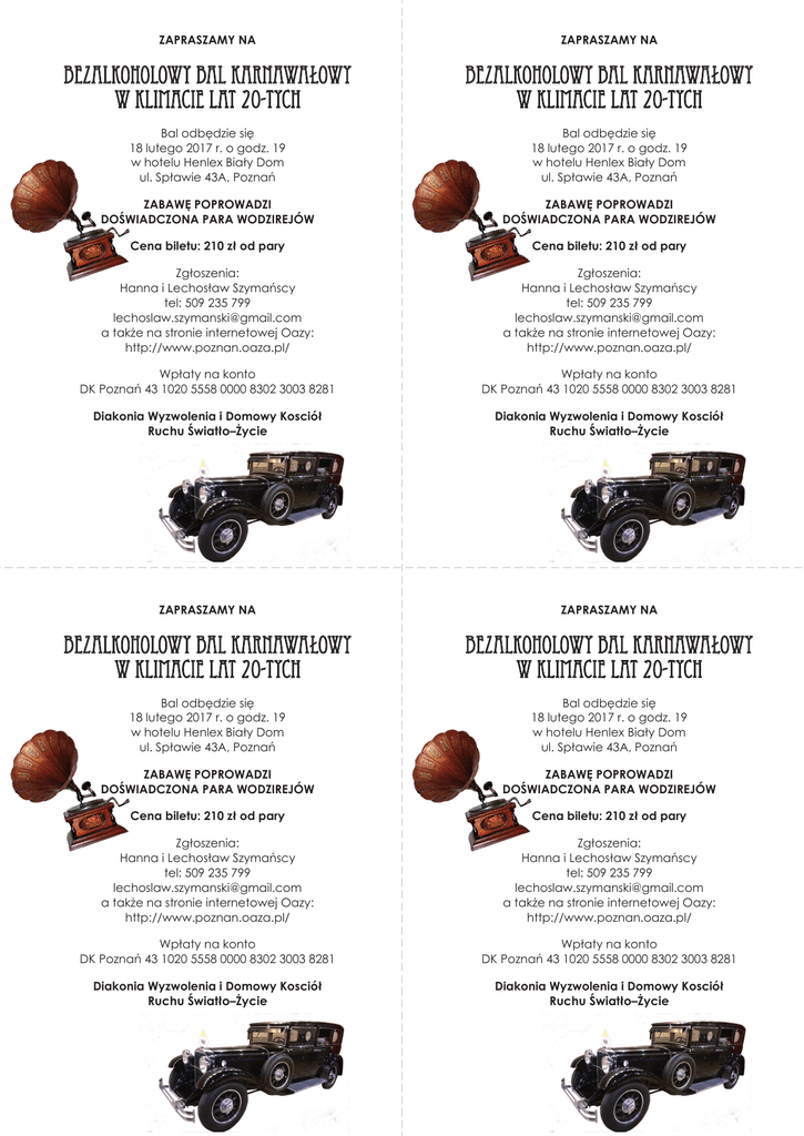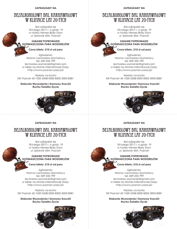 ZaprasZamy na ZaprasZamy na BEZALKOHOLOWY BAL KARNAWAŁOWY w klimacie lat 20-tych BEZALKOHOLOWY BAL KARNAWAŁOWY w klimacie lat 20-tych Bal odbędzie się 18 lutego 2017 r. o godz. 19 w hotelu Henlex Biały Dom ul. Spławie 43A, Poznań Bal odbędzie się 18 lutego 2017 r. o godz. 19 w hotelu Henlex Biały Dom ul. Spławie 43A, Poznań ZABAWĘ POPROWADZI DOŚWIADCZONA PARA WODZIREJÓW ZABAWĘ POPROWADZI DOŚWIADCZONA PARA WODZIREJÓW Cena biletu: 210 zł od pary Cena biletu: 210 zł od pary Zgłoszenia: Hanna i Lechosław Szymańscy tel: 509 235 799 [email protected] a także na stronie internetowej Oazy: http://www.poznan.oaza.pl/ Zgłoszenia: Hanna i Lechosław Szymańscy tel: 509 235 799 [email protected] a także na stronie internetowej Oazy: http://www.poznan.oaza.pl/ Wpłaty na konto DK Poznań 43 1020 5558 0000 8302 3003 8281 Wpłaty na konto DK Poznań 43 1020 5558 0000 8302 3003 8281 Diakonia Wyzwolenia i Domowy Kosciół Ruchu Światło–Życie Diakonia Wyzwolenia i Domowy Kosciół Ruchu Światło–Życie ZaprasZamy na ZaprasZamy na BEZALKOHOLOWY BAL KARNAWAŁOWY w klimacie lat 20-tych BEZALKOHOLOWY BAL KARNAWAŁOWY w klimacie lat 20-tych Bal odbędzie się 18 lutego 2017 r. o godz. 19 w hotelu Henlex Biały Dom ul. Spławie 43A, Poznań Bal odbędzie się 18 lutego 2017 r. o godz. 19 w hotelu Henlex Biały Dom ul. Spławie 43A, Poznań ZABAWĘ POPROWADZI DOŚWIADCZONA PARA WODZIREJÓW ZABAWĘ POPROWADZI DOŚWIADCZONA PARA WODZIREJÓW Cena biletu: 210 zł od pary Cena biletu: 210 zł od pary Zgłoszenia: Hanna i Lechosław Szymańscy tel: 509 235 799 [email protected] a także na stronie internetowej Oazy: http://www.poznan.oaza.pl/ Zgłoszenia: Hanna i Lechosław Szymańscy tel: 509 235 799 [email protected] a także na stronie internetowej Oazy: http://www.poznan.oaza.pl/ Wpłaty na konto DK Poznań 43 1020 5558 0000 8302 3003 8281 Wpłaty na konto DK Poznań 43 1020 5558 0000 8302 3003 8281 Diakonia Wyzwolenia i Domowy Kosciół Ruchu Światło–Życie Diakonia Wyzwolenia i Domowy Kosciół Ruchu Światło–Życie