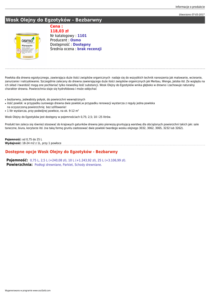 Informacje o produkcie Utworzono 07-03-2017 Wosk Olejny do Egzotyków - Bezbarwny Cena : 118,03 zł Nr katalogowy : 1101 Producent : Osmo Dostępność : Dostępny Średnia ocena : brak recenzji Powłoka dla drewna egzotycznego, zawierająca duże ilości związków organicznych nadaje się do wszystkich technik nanoszenia jak malowanie, wcieranie, zanurzanie i natryskiwanie. Szczególnie zalecany do drewna zawierającego duże ilości związków organicznych jak Merbau, Wenge, Jatoba itd. Ze względu na ich skład i twardość mogą one pochłaniać tylko niewielką ilość substancji. Wosk Olejny do Egzotyków wnika głęboko w drewno i zachowuje naturalny charakter drewna. Powierzchnia staje się hydrofobowa i może oddychać ● ● ● bezbarwny, jedwabisty połysk, do powierzchni wewnętrznych ilość powłok: w przypadku surowego drewna dwie powłoki,w przypadku renowacji wystarcza z reguły jedna powłoka na oczyszczoną powierzchnię bez szlifowania! 1 litr wystarcza, przy podwójnej powłoce, na ok. 9-12 m2 Wosk Olejny do Egzotyków jest dostępny w pojemnościach 0,75; 2,5; 10 i 25 litrów. Produkt ten zaleca się również stosować do krajowych gatunków drewna jako pierwszą gruntującą warstwę dla obciążonych powierzchni takich jak: sale taneczne, biura, korytarze itd. (na taką formę gruntu zastosować dwie powłoki twardego wosku olejnego 3032, 3062, 3065, 3232 lub 3262). Pojemność: od 0,75 do 25 L Wydajność: 18-24 m2 z 1L, przy 1 powłoce Dostępne opcje Wosk Olejny do Egzotyków - Bezbarwny Pojemność: 0,75 L, 2,5 L (+240,08 zł), 10 L (+1.243,92 zł), 25 L (+3.106,99 zł). Powierzchnia: Podłogi drewniane, Parkiet, Schody drewniane. Wygenerowano w programie www.oscGold.com