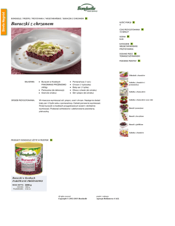 BONDUELLE / PRZEPIS / PRZYSTAWKA / WEGETARIAŃSKIE / BURACZKI Z CHRZANEM Buraczki z chrzanem ILOŚĆ PORCJI 4 CZAS PRZYGOTOWANIA 15 MINUT OCENA brak KATEGORIE WEGETARIAŃSKIE PRZYSTAWKA DODANE PRZEZ TOMASZ SZYMAŃSKI PODOBNE PRZEPISY Chłodnik z buraków SKŁADNIKI: SPOSÓB PRZYGOTOWANIA: Buraczki w Kostkach PAKOWANE PRÓŻNIOWO (400g) Pietruszka (do dekoracji) Ocet (do smaku) Pomarańcza (1 szt.) Chrzan (1 łyżeczka) Biały ser (1 łyżka) Oliwa z oliwek (do smaku) Sól i pieprz (do smaku) W miseczce wymieszać sól, pieprz, ocet i chrzan. Następnie dodać biały ser i 2 łyżki soku z pomarańczy. Całość ponownie wymieszać. Polać buraczki w kostkach przygotowanym sosem i delikatnie wymieszać. Podawać schłodzone i udekorowane posiekaną pietruszką. Sałatka z buraków i pomarańczy Sałatka z buraczków Sałatka z buraczków sous vide Buraki zasmażane Buraki z boczkiem Buraki z jabłkiem Sałatka z buraków PRODUKTY BONDUELLE UŻYTE W PRZEPISIE Buraczki w Kostkach PAKOWANE PRÓŻNIOWO MASA NETTO: 2295 g ODCIEK: 1950 g POJEMNOŚĆ: 3100 ml All rights reserved projekt i realizacja Copyright © 2012-2015 Bonduelle Agencja Reklamowa 4 ALL