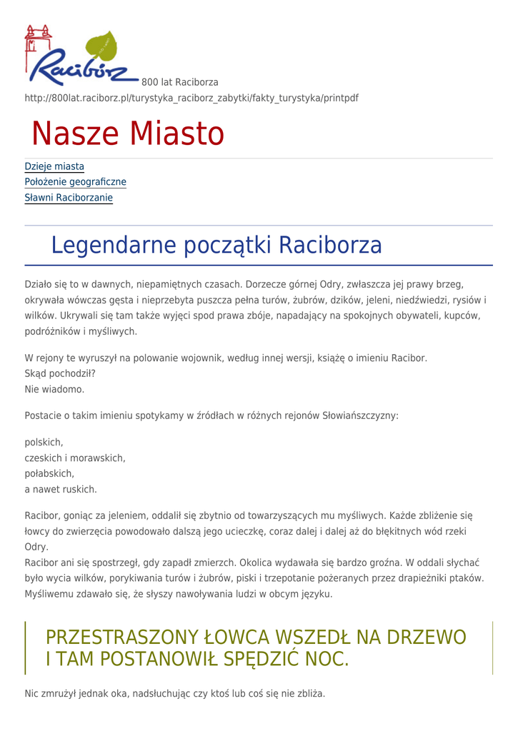800 lat Raciborza http://800lat.raciborz.pl/turystyka_raciborz_zabytki/fakty_turystyka/printpdf Nasze Miasto Dzieje miasta Położenie geograficzne Sławni Raciborzanie Legendarne początki Raciborza Działo się to w dawnych, niepamiętnych czasach. Dorzecze górnej Odry, zwłaszcza jej prawy brzeg, okrywała wówczas gęsta i nieprzebyta puszcza pełna turów, żubrów, dzików, jeleni, niedźwiedzi, rysiów i wilków. Ukrywali się tam także wyjęci spod prawa zbóje, napadający na spokojnych obywateli, kupców, podróżników i myśliwych. W rejony te wyruszył na polowanie wojownik, według innej wersji, książę o imieniu Racibor. Skąd pochodził? Nie wiadomo. Postacie o takim imieniu spotykamy w źródłach w różnych rejonów Słowiańszczyzny: polskich, czeskich i morawskich, połabskich, a nawet ruskich. Racibor, goniąc za jeleniem, oddalił się zbytnio od towarzyszących mu myśliwych. Każde zbliżenie się łowcy do zwierzęcia powodowało dalszą jego ucieczkę, coraz dalej i dalej aż do błękitnych wód rzeki Odry. Racibor ani się spostrzegł, gdy zapadł zmierzch. Okolica wydawała się bardzo groźna. W oddali słychać było wycia wilków, porykiwania turów i żubrów, piski i trzepotanie pożeranych przez drapieżniki ptaków. Myśliwemu zdawało się, że słyszy nawoływania ludzi w obcym języku. PRZESTRASZONY ŁOWCA WSZEDŁ NA DRZEWO I TAM POSTANOWIŁ SPĘDZIĆ NOC. Nic zmrużył jednak oka, nadsłuchując czy ktoś lub coś się nie zbliża. Bojąc się, że w tej nieznanej okolicy może mu się coś złego przytrafić, z dala od swoich towarzyszy, przyrzekł Bogu: "Jeśli wyjdę cało z opresji, zbuduję w tym miejscu warowny gród, w którym w przyszłości mogliby się schronić zbłąkani myśliwi lub podróżujący w tych stronach kupcy". Rankiem Racibor przetarł oczy i patrząc z wysokiego drzewa stwierdził, że nieprzyjazna nocą okolica, w ciągu dnia wyglądała całkiem przyjaźnie. Piękny pachnący las, płynąca w pobliżu błękitna Odra, ćwierkające ptaki, ukazywały inny świat. Zszedłszy z drzewa Racibor, zaczął szukać swoich towarzyszy. Po kilku godzinach odnalazł ich i opowiedział w szczegółach co go spotkało. Nie omieszkał wspomnieć o danym Bogu w trwodze przyrzeczeniu, iż zbuduje w miejscu swego ocalenia obronny gród. Na to jego towarzysze zgodnie stwierdzili: "Przyrzeczenie dane Bogu to rzecz święta. Powinieneś obietnicy dotrzymać". Racibor zgodził się z tym co powiedzieli jego kompani. Następnie wszyscy ruszyli w kierunku rzeki Odry. Tam na jej prawym brzegu przystąpiono do pracy. Zaczęto wznosić drewnianą palisadę, która miała chronić przyszłych mieszkańców grodu, następnie zbudowano domy mieszkalne, siedzibą dowódcy oraz kaplicę, jako miejsce kultu. Surowców dostarczyła okoliczna puszcza. W krótkim czasie, wspólnym wysiłkiem gród został postawiony. PO ZAKOŃCZENIU PRACY ZACZĘTO ZASTANAWIAĆ SIĘ JAKĄ ÓW GRÓD POWINIEN NOSIĆ NAZWĘ. W toku dyskusji, gdy wysuwano różne propozycje, jeden z myśliwych powiedział: "Przyrzeczenie, iż w tym miejscu zostanie wzniesiony gród, dał Racibor. Niech więc osada nosi jego imię!" Tak też się stało. Wyprawiono ucztę, w czasie której uroczyście proklamowano nadanie nadodrzańskiemu grodowi nazwy - Racibor. W czasie uczty pieczono dziczyznę, pito wino i miód. Rozbawieni i rozochoceni trunkami myśliwi co jakiś czas wykrzykiwali na całe gardło imię założyciela osady i nazwę nowego grodu. Szum lasu powodował, że słowo "Racibor" dolatywało do uszu podchodzących pod gród zaciekawionych tubylców w zniekształconej formie jako "Racibórz". Taka też nazwa przyjęła się powszechnie. Wkrótce Racibórz stał się znaczącym ośrodkiem władzy w tej części Śląska. Za jego obwarowaniami znajdowali schronienie nie tylko zbłąkani myśliwi lub kupcy, ale także rycerze, książęta, a nawet królowie. Niestety dalsze losy założyciela nadodrzańskiego grodu legendarnego Racibora nie są znane. A szkoda! "Wspólne raciborsko - opawskie dziedzictwo. Podręcznik do edukacji regionalnej" Norbert Mika, Sarka Belastova