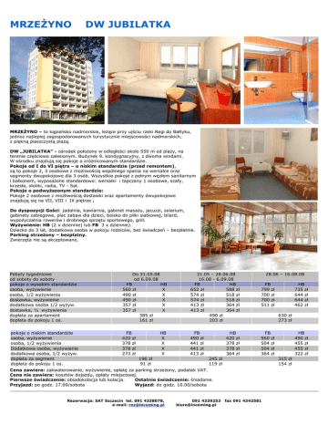 MRZEśYNO DW JUBILATKA MRZEśYNO – to kąpielisko nadmorskie, leŜące przy ujściu rzeki Regi do Bałtyku, jednoz najlepiej zagospodarowanych turystycznie miejscowości nadmorskich, z piękną piaszczystą plaŜą. DW „JUBILATKA” - ośrodek połoŜony w odległości około 550 m od plaŜy, na terenie częściowo zalesionym. Budynek 9. kondygnacyjny, z dwoma windami. W ośrodku znajdują się pokoje o zróŜnicowanym standardzie. Pokoje od I do VI piętra – o niskim standardzie (przed remontem), są to pokoje 2, 3 osobowe z moŜliwością wspólnego spania na wersalce oraz segmenty dwupokojowe dla 3 osób. Wszystkie pokoje z pełnym węzłem sanitarnym i balkonem, wyposaŜone standardowo: wersalki i tapczany 1 osobowe, szafy, krzesła, stoliki, radia, TV - Sat. Pokoje o podwyŜszonym standardzie: Pokoje 2 osobowe z moŜliwością dostawki oraz apartamenty dwupokojowe znajdują się na VII, VIII i IX piętrze . Do dyspozycji Gości: jadalnia, kawiarnia, gabinet masaŜu, jacuzzi, solarium, gabinety zabiegowe, plac zabaw dla dzieci, boisko do piłki siatkowej, bilard, wypoŜyczalnia rowerów i drobnego sprzętu sportowego, grill. WyŜywienie: HB (2 x dziennie) lub FB 3 x dziennie). Dziecko do 3 lat, dodatkowa osoba w pokoju rodziców, bez świadczeń – bezpłatnie. Parking strzeŜony – bezpłatny. Zwierzęta nie są akceptowane. Pobyty tygodniowe od soboty do soboty pokoje o wysokim standardzie osoba, wyŜywienie osoba, 1/2 wyŜywienia dostawka, wyŜywienie dodatkowa osoba 1/2 wyŜyw. dostawka, ½ wyŜywienia dopłata za apartament dopłata do pokoju 1 os. pokoje o niskim standardzie osoba, wyŜywienie osoba, 1/2 wyŜywienia Dodatkowa osoba, wyŜywienie dodatkowa osoba, 1/2 wyŜyw. dopłata za segment dopłata do pokoju 1 os. Do 31.05.08 od 6.09.08 FB 560 zł 490 zł 490 zł 357 zł 357 zł HB X X X X X 385 zł 161 zł FB 420 zł 378 zł 378 zł 273 zł HB X X X X 196 zł 91 zł 31.05 – 28.06.08 16.08 - 6.09.08 FB HB 652 zł 588 zł 574 zł 518 zł 574 zł 518 zł 413 zł 364 zł 413 zł 364 zł 490 zł 203 zł FB 490 zł 441 zł 441 zł 413 zł HB 420 zł 378 zł 378 zł 364 zł 28.06 – 16.08.08 FB 799 zł 700 zł 700 zł 511 zł 630 zł 273 zł FB 560 zł 504 zł 504 zł 364 zł 245 zł 119 zł 091 4339253 [email protected] HB 490 zł 455 zł 455 zł 322 zł 315 zł 154 zł Cena zawiera: zakwaterowanie, wyŜywienie, opłatę za parking strzeŜony, podatek VAT. Cena nie zawiera: kosztów dojazdu, opłaty miejscowej. Pierwsze świadczenie: obiadokolacja lub kolacja. Ostatnie świadczenie: śniadanie. Przyjazd: po godz. 17.00/sobota Wyjazd: do godz. 10.00/sobota Rezerwacja: SAT Szczecin tel. 091 4338078, e-mail: [email protected] HB 735 zł 644 zł 644 zł 462 zł fax 091 4342581