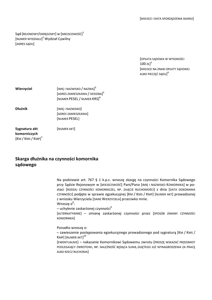 [MIEJSCE I DATA SPORZĄDZENIA SKARGI] Sąd [REJONOWY/OKRĘGOWY] w [MIEJSCOWOŚĆ]1 [NUMER WYDZIAŁU]2 Wydział Cywilny [ADRES SĄDU] Wierzyciel Dłużnik Sygnatura akt komorniczych [KM / KMS / KMP]7 [IMIĘ I NAZWISKO / NAZWA]5 [ADRES ZAMIESZKANIA / SIEDZIBA]5 [NUMER PESEL / NUMER KRS]6 [IMIĘ I NAZWISKO] [ADRES ZAMIESZKANIA] [NUMER PESEL] [NUMER AKT] [OPŁATA SĄDOWA W WYSOKOŚCI 100 ZŁ]3 [MIEJSCE NA ZNAKI OPŁATY SĄDOWEJ 4 ALBO PIECZĘĆ SĄDU] Skarga dłużnika na czynności komornika sądowego Na podstawie art. 767 § 1 k.p.c. wnoszę skargę na czynności Komornika Sądowego przy Sądzie Rejonowym w [MIEJSCOWOŚĆ] Pani/Pana [IMIĘ I NAZWISKO KOMORNIKA] w po-‐ staci [RODZAJ CZYNNOŚCI KOMORNICZEJ, NP. ZAJĘCIE RUCHOMOŚCI] z dnia [DATA DOKONANIA CZYNNOŚCI] podjęte w sprawie egzekucyjnej [KM / KMS / KMP] [NUMER AKT] prowadzonej z wniosku Wierzyciela [DANE WIERZYCIELA] przeciwko mnie. Wnoszę o8: – uchylenie zaskarżonej czynności9 [ALTERNATYWNIE] – zmianę zaskarżonej czynności przez [SPOSÓB ZMIANY CZYNNOŚCI KOMORNIKA] Ponadto wnoszę o: – zawieszenie postępowania egzekucyjnego prowadzonego pod sygnaturą [KM / KMS / KMP] [NUMER AKT]10 [EWENTUALNIE] – nakazanie Komornikowi Sądowemu zwrotu [PROSZĘ WSKAZAĆ PRZEDMIOT PODLEGAJĄCY ZWROTOWI, NP. NALEŻNOŚĆ BĘDĄCA SUMĄ ZAJĘTEGO JUŻ WYNAGRODZENIA ZA PRACĘ ALBO RZECZ RUCHOMA] Uzasadnienie [PROSZĘ OPISAĆ PRZEDMIOT SKARGI, CZYLI PODJĘTĄ PRZEZ KOMORNIKA SĄDOWEGO CZYNNOŚĆ, Z KTÓRĄ SIĘ PAN/PANI NIE ZGADZA SIĘ, WSKAZAĆ ZARZUTY WOBEC CZYNNOŚCI KOMORNIKA ORAZ WNIOSKI DOTYCZĄCE TEJ CZYNNOŚCI] [IMIĘ I NAZWISKO ORAZ PODPIS WNOSZĄCEJ SKARGĘ] Załączniki – dowód uiszczenia opłaty sądowej od skargi w wysokości 100 zł [TYLKO WTEDY, GDY UISZCZONO OPŁATĘ PRZELEWEM – W PRZECIWNYM RAZIE WYSTARCZĄ NAKLEJONE NA 1 STRONIE SPRZECIWU ZNAKI OPŁATY SĄDOWEJ LUB PIECZĘĆ SĄDOWA] – odpis skargi w ilości [PROSZĘ PODAĆ LICZBĘ ODPOWIADAJĄCĄ LICZBIE UCZESTNIKÓW POSTĘPOWANIA I DLA KOMORNIKA SĄDOWEGO], – [EWENTUALNIE] inne dokumenty [PROSZĘ WYMIENIĆ JAKIE] Instrukcja wypełnienia wzoru 1 Zgodnie z art. 767 § 1 zd. 3 i 4 k.p.c. do rozpoznania skargi na czynności komornika właściwy jest sąd, przy którym działa komornik. Jeżeli do prowadzenia egzekucji został wybrany komornik poza właściwością ogól-‐ ną, skargę rozpoznaje sąd, który byłby właściwy według ogólnych zasad (czyli sąd, przy którym działa ko-‐ mornik właściwy miejscowo dla danej sprawy – np. zgodnie z art. 844 § 1 k.p.c. w sprawie egzekucji z ru-‐ chomości będzie to sąd, w którego okręgu znajdują się ruchomości). 2 3 Skargę powinno się wnieść bezpośrednio do wydziału sądu rejonowego, w którym nadano klauzulę wyko-‐ nalności danemu tytułowi egzekucyjnemu. Zgodnie z art. 25 ust. 1 pkt ustawy o kosztach sądowych w sprawach cywilnych od skargi na czynności komornika pobiera się opłatę stałą w kwocie 100 zł. 4 Uiszczenie opłaty sądowej w sprawie cywilnej może nastąpić na trzy sposoby: a. przelewem na rachunek bankowy właściwego sądu, b. gotówką w kasie sądu, c. znakami opłaty sądowej. Znaki opłaty sądowe, które mają wartość l zł, 2 zł, 5 zł, 10 zł, 20 zł, 50 zł oraz 200 zł należy naklejać na pierw-‐ szej lub ostatniej stronie pisma w miejscu niezawierającym tekstu jeden obok drugiego lub jeden pod dru-‐ gim, w miarę możności bez odstępu. Osobami upoważnionymi do kasowania znaków opłaty sądowej są sędzia lub pracownik upoważniony do przyjmowania pism lub do wydawania dokumentów. Znaki opłaty sądowej skasowane przez uiszczającego opłatę nie będą przyjmowane. 5 6 7 8 Nazwę i siedzibę podaje się zamiast imienia, nazwiska i adresu w przypadku, w którym Wierzyciel nie jest osobą fizyczną (np. jest spółką z ograniczoną odpowiedzialnością). Numer KRS to numer niebędącego osobą fizyczną Wierzyciela w Krajowym Rejestrze Sądowym. Można go ustalić na stronie internetowej: https://ems.ms.gov.pl/krs/wyszukiwaniepodmiotu Oznaczenie „Kmp” występuje w sprawach dotyczących świadczeń powtarzających się (zwykle sprawy o świadczenia alimentacyjne). Oznaczenie „Kms” dotyczy spraw o egzekucję należności sądowych (najczę-‐ ściej grzywny). Oznaczenie „Km” dotyczy pozostałych spraw. Proszę wybrać właściwy wniosek. 9 Zgodnie z art. 821 § 2 k.p.c. jeżeli dłużnik zabezpieczy spełnienie swego obowiązku, sąd może uchylić do-‐ konane czynności egzekucyjne, z wyjątkiem zajęcia. Jeżeli składa się wniosek o uchylenie dokonanej czynno-‐ ści, to nie można już w tej samej skardze formułować wniosku o zmianę dokonanej czynności. 10 Zgodnie z art. 821 § 1 k.p.c. Sąd może na wniosek zawiesić w całości lub części postępowanie egzekucyjne, jeżeli złożono skargę na czynności komornika lub zażalenie na postanowienie sądu. Zawieszenie postępowa-‐ nia sąd może uzależnić od złożenia przez dłużnika zabezpieczenia. Zgodnie z art. 821 § 3 k.p.c. Sąd może odmówić zawieszenia postępowania albo już zawieszone postępowanie podjąć na nowo, jeżeli wierzyciel zabezpieczy naprawienie szkody, jaka wskutek dalszego postępowania może wyniknąć dla dłużnika.