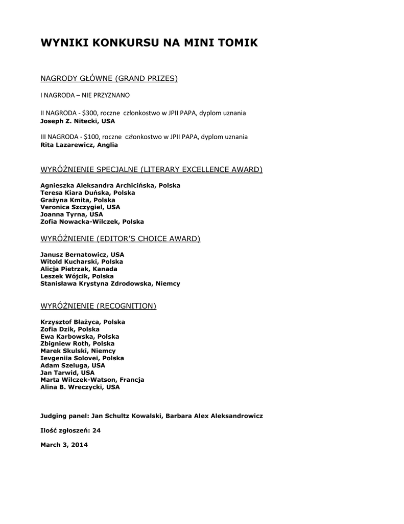 WYNIKI KONKURSU NA MINI TOMIK NAGRODY GŁÓWNE (GRAND PRIZES) I NAGRODA – NIE PRZYZNANO II NAGRODA - $300, roczne członkostwo w JPII PAPA, dyplom uznania Joseph Z. Nitecki, USA III NAGRODA - $100, roczne członkostwo w JPII PAPA, dyplom uznania Rita Lazarewicz, Anglia WYRÓŻNIENIE SPECJALNE (LITERARY EXCELLENCE AWARD) Agnieszka Aleksandra Archicińska, Polska Teresa Kiara Duńska, Polska Grażyna Kmita, Polska Veronica Szczygiel, USA Joanna Tyrna, USA Zofia Nowacka-Wilczek, Polska WYRÓŻNIENIE (EDITOR’S CHOICE AWARD) Janusz Bernatowicz, USA Witold Kucharski, Polska Alicja Pietrzak, Kanada Leszek Wójcik, Polska Stanisława Krystyna Zdrodowska, Niemcy WYRÓŻNIENIE (RECOGNITION) Krzysztof Błażyca, Polska Zofia Dzik, Polska Ewa Karbowska, Polska Zbigniew Roth, Polska Marek Skulski, Niemcy Ievgeniia Solovei, Polska Adam Szeluga, USA Jan Tarwid, USA Marta Wilczek-Watson, Francja Alina B. Wreczycki, USA Judging panel: Jan Schultz Kowalski, Barbara Alex Aleksandrowicz Ilość zgłoszeń: 24 March 3, 2014
