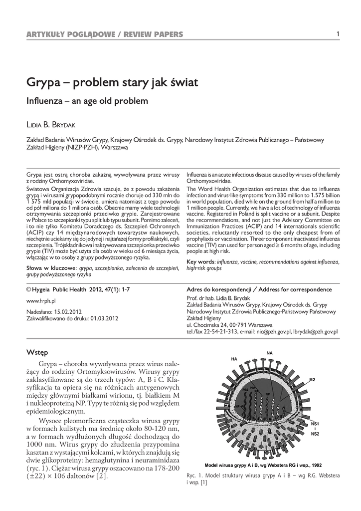 Brydak LB. Grypa – problem stary jak świat Artykuły poglądowe / review papers Grypa – problem stary jak świat Influenza – an age old problem Lidia B. Brydak Zakład Badania Wirusów Grypy, Krajowy Ośrodek ds. Grypy, Narodowy Instytut Zdrowia Publicznego – Państwowy Zakład Higieny (NIZP-PZH), Warszawa Grypa jest ostrą choroba zakaźną wywoływana przez wirusy z rodziny Orthomyxoviridae. Światowa Organizacja Zdrowia szacuje, że z powodu zakażenia grypą i wirusami grypopodobnymi rocznie choruje od 330 mln do 1 575 mld populacji w świecie, umiera natomiast z tego powodu od pół miliona do 1 miliona osób. Obecnie mamy wiele technologii otrzymywania szczepionki przeciwko grypie. Zarejestrowane w Polsce to szczepionki typu split lub typu subunit. Pomimo zaleceń, i to nie tylko Komitetu Doradczego ds. Szczepień Ochronnych (ACIP) czy 14 międzynarodowych towarzystw naukowych, niechętnie uciekamy się do jedynej i najtańszej formy profilaktyki, czyli szczepienia. Trójskładnikowa inaktywowana szczepionka przeciwko grypie (TIV) może być użyta dla osób w wieku od 6 miesiąca życia, włączając w to osoby z grupy podwyższonego ryzyka. Słowa w kluczowe: grypa, szczepionka, zalecenia do szczepień, grupy podwyższonego ryzyka Influenza is an acute infectious disease caused by viruses of the family Orthomyxoviridae. The Word Health Organization estimates that due to influenza infection and virus-like symptoms from 330 million to 1.575 billion in world population, died while on the ground from half a million to 1 million people. Currently, we have a lot of technology of influenza vaccine. Registered in Poland is split vaccine or a subunit. Despite the recommendations, and not just the Advisory Committee on Immunization Practices (ACIP) and 14 internationals scientific societies, reluctantly resorted to the only cheapest from of prophylaxis or vaccination. Three-component inactivated influenza vaccine (TIV) can used for person aged ≥ 6 months of age, including people at high risk. Key words: influenza, vaccine, recommendations against influenza, high-risk groups © Hygeia Public Health 2012, 47(1): 1-7 Adres do korespondencji / Address for correspondence www.h-ph.pl Prof. dr hab. Lidia B. Brydak Zakład Badania Wirusów Grypy, Krajowy Ośrodek ds. Grypy Narodowy Instytut Zdrowia Publicznego-Państwowy Państwowy Zakład Higieny ul. Chocimska 24, 00-791 Warszawa tel./fax 22-54-21-313, e-mail: [email protected], [email protected] Nadesłano: 15.02.2012 Zakwalifikowano do druku: 01.03.2012 Wstęp Grypa – choroba wywoływana przez wirus należący do rodziny Ortomyksowirusów. Wirusy grypy zaklasyfikowane są do trzech typów: A, B i C. Klasyfikacja ta opiera się na różnicach antygenowych między głównymi białkami wirionu, tj. białkiem M i nukleoproteiną NP. Typy te różnią się pod względem epidemiologicznym. Wysoce pleomorficzna cząsteczka wirusa grypy w formach kulistych ma średnicę około 80-120 nm, a w formach wydłużonych długość dochodzącą do 1000 nm. Wirus grypy do złudzenia przypomina kasztan z wystającymi kolcami, w których znajdują się dwie glikoproteiny: hemaglutynina i neuraminidaza (ryc. 1). Ciężar wirusa grypy oszacowano na 178-200 (±22) × 106 daltonów [2]. Ryc. 1. Model struktury wirusa grypy A i B – wg R.G. Webstera i wsp. [1] Wirus grypy zakaża komórki nabłonka nosa, krtani, tchawicy i oskrzeli, uszkadzając nabłonek układu oddechowego [3]. Typ A wirusów dzielony jest na podtypy w zależności od właściwości antygenowych ich antygenów powierzchniowych – neuraminidazy (NA) i hemaglutyniny (HA). I tak wirusy grypy A występują w 16 podtypach antygenowych HA (H1–H16) i 9 podtypach NA (N1–N9). Podział ten jest uznany w systemie nomenklaturowym wirusa grypy A i zalecany przez Światową Organizację Zdrowia (World Health Organization – WHO) [4]. Wirus grypy A, będący główną przyczyną infekcji, zakaża ludzi na całym świecie. Zgodnie z danymi WHO w świecie, z powodu zakażenia grypą i wirusami grypopodobnymi, choruje od 5 do 25% populacji, a umiera od pół miliona do 1 miliona ludzi [5]. Z grypą możemy walczyć poprzez szczepienia, ale trzeba po prostu chcieć i mieć świadomość skutków w postaci: wielonarządowych powikłań pogrypowych, tragedii ludzkich z powodu zgonów bliskich osób. Szczepionki i szczepienia Odkrycie wirusa grypy w 1933 r. przez Christophera Andrewesa, Patrica Laidlowa i Wilsona Smitha zapoczątkowało dynamiczny, wielokierunkowy rozwój badań naukowych nad grypą [3]. Miało to miejsce w National Instituite for Medical Resaerch w Londynie, gdzie obecnie mieści się jedno z International Collaborating Center for Reference and Research on Influenza dla Europy [3]. Pandemia grypy hiszpanka, która miała miejsce w latach 1918-1919, wywołana przez podtyp A/H1N1/ spowodowała, wg obecnych danych, od 50 do 100 mln zgonów. Następna pandemia, zwana azjatycką, wywołana przez podtyp A/H2N2/ spowodowała 1-4 mln zgonów. Jest to nieporównanie mniej przypadków śmiertelnych a odpowiedź jest bardzo prosta [6]. Pierwsze zezwolenie na zastosowanie szczepionek u ludzi zostało wydane w 1941 r. Nie były to szczepionki takiej jakości jak są obecnie. Powodowały bardzo duże niepożądane odczyny poszczepienne (NOP), a mimo wszystko społeczństwo nie podważało znaczenia szczepień. Bowiem ci, którzy przeżyli, pamiętali widmo śmierci jakie powodowała pandemia. Dziś jest inaczej. Następne lata po 1941 roku to okres intensywnych badań, w wyniku których mamy wiele rodzajów szczepionek inaktywowanych: z całym wirionem, z rozszczepionym wirionem zwane split, podjednostkowe zwane subunit, z adiuwantem lub bez, wirosomalne oraz żywe otrzymane z tzw. cold adapted mutantów [6]. Polskie badania i technologie opracowywania szczepionek przeciwko grypie W tym miejscu należy wspomniec o Polskich badaniach nad wyprodukowaniem inaktywowanej Hygeia Public Health 2012, 47(1