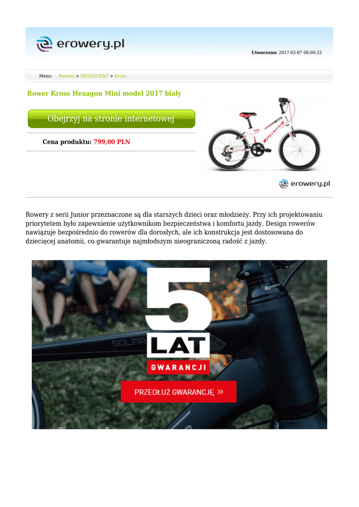 Utworzono: 2017-03-07 08:00:33 Menu: Rowery > PRODUCENT > Kross Rower Kross Hexagon Mini model 2017 biały Obejrzyj na stronie internetowej Cena produktu: 799,00 PLN Rowery z serii Junior przeznaczone są dla starszych dzieci oraz młodzieży. Przy ich projektowaniu priorytetem było zapewnienie użytkownikom bezpieczeństwa i komfortu jazdy. Design rowerów nawiązuje bezpośrednio do rowerów dla dorosłych, ale ich konstrukcja jest dostosowana do dziecięcej anatomii, co gwarantuje najmłodszym nieograniczoną radość z jazdy. Klamki hamulców Alhonga Hamulce V-brake Mechanizm korbowy Kierownica Cyclone 38T Kross Universal Components (Stal, wznios, 560mm, 25,4mm) Kross Universal Mostek/ Wspornik kierownicy Components (Stal, 25,4mm) Pedały Plastik Sztyca Kross Universal Components (Stal, 27,2mm) Siodło Kross Przeznaczenie Dziecięcy Piasta przód Aluminium Piasta tył Aluminium Łańcuch YBN S20 Kaseta/ wolnobieg 14-28T Obręcze Mach 1 Opony 20"x1,9" Waga 11.0 Rozmiar kół 20" Sezon 2017 Rama Aluminium Performance Widelec/amortyzator Stery Przerzutka tył Manetki Stal 20" Neco H842 Shimano Tourney RD-FT55 Shimano Revoshift SL-RS36, 6 biegów Rozmiary ram - Oś korbowodu - Prowadzenie łańcucha - Szprychy - Wyposażenie dodatkowe - Typ roweru Dziecięcy Tylny amortyzator /Damper Rodzina - Przerzutka przód - Kolor Producent Biały_#FFFFFF Kross Mimo dołożenia wszelkich starań nie gwarantujemy, że publikowane opisy i specyfikacje techniczne niezawierają uchybień lub błędów, które nie mogą jednak być podstawą do roszczeń. W przypadku jakichkolwiek wątpliwości, przed podjęciem decyzji prosimy o kontakt. Adres: www.erowery.pl Telefon: 605 515 185, 34 361 16 71 Email: [email protected]