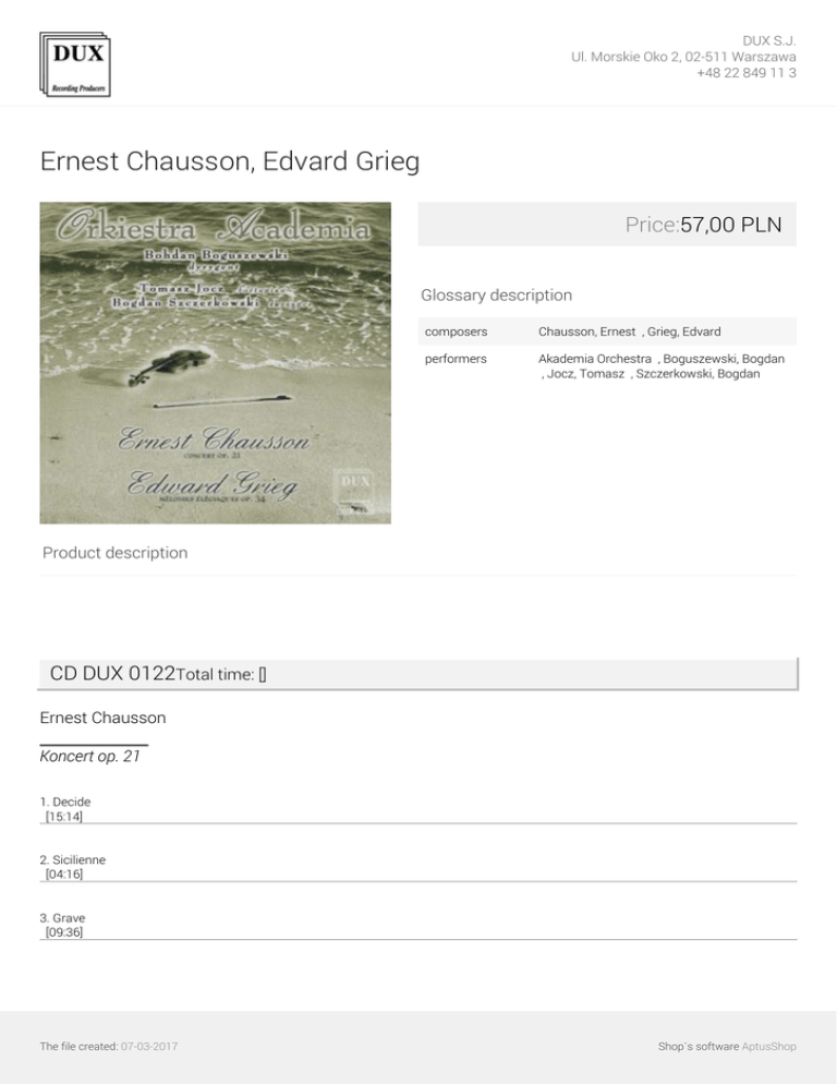 DUX S.J. Ul. Morskie Oko 2, 02-511 Warszawa +48 22 849 11 3 Ernest Chausson, Edvard Grieg Price:57,00 PLN Glossary description composers Chausson, Ernest ∎, Grieg, Edvard ∎ performers Akademia Orchestra ∎, Boguszewski, Bogdan ∎, Jocz, Tomasz ∎, Szczerkowski, Bogdan ∎ Product description CD DUX 0122Total time: [] Ernest Chausson Koncert op. 21 1. Decide [15:14] 2. Sicilienne [04:16] 3. Grave [09:36] The file created: 07-03-2017 Shop`s software AptusShop DUX S.J. Ul. Morskie Oko 2, 02-511 Warszawa +48 22 849 11 3 4. Finale - Tres Anime [11:26] Edvard Grieg Mélodies élégiaques op. 34 5. Hjertesar [03:14] 6. Varen [04:16] Performers: Akademia Orchestra Bogdan Boguszewski /conductor/ Tomasz Jocz /piano/ Bogdan Szczerkowski /violin/ The file created: 07-03-2017 Powered by TCPDF (www.tcpdf.org) Shop`s software AptusShop