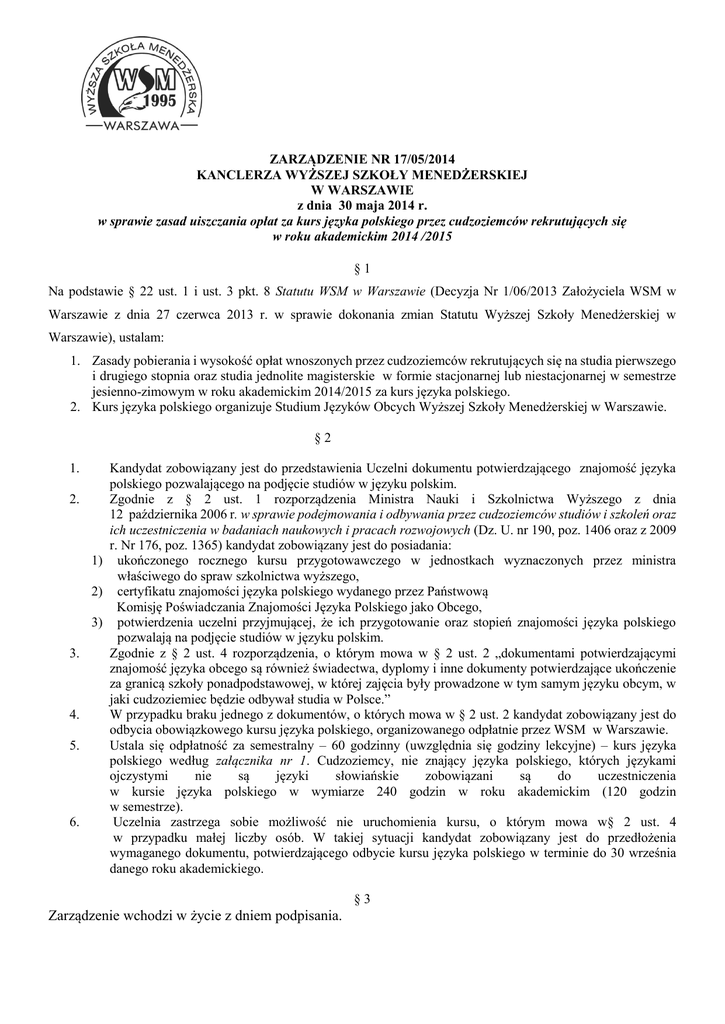 ZARZĄDZENIE NR 17/05/2014 KANCLERZA WYŻSZEJ SZKOŁY MENEDŻERSKIEJ W WARSZAWIE z dnia 30 maja 2014 r. w sprawie zasad uiszczania opłat za kurs języka polskiego przez cudzoziemców rekrutujących się w roku akademickim 2014 /2015 §1 Na podstawie § 22 ust. 1 i ust. 3 pkt. 8 Statutu WSM w Warszawie (Decyzja Nr 1/06/2013 Założyciela WSM w Warszawie z dnia 27 czerwca 2013 r. w sprawie dokonania zmian Statutu Wyższej Szkoły Menedżerskiej w Warszawie), ustalam: 1. Zasady pobierania i wysokość opłat wnoszonych przez cudzoziemców rekrutujących się na studia pierwszego i drugiego stopnia oraz studia jednolite magisterskie w formie stacjonarnej lub niestacjonarnej w semestrze jesienno-zimowym w roku akademickim 2014/2015 za kurs języka polskiego. 2. Kurs języka polskiego organizuje Studium Języków Obcych Wyższej Szkoły Menedżerskiej w Warszawie. §2 Kandydat zobowiązany jest do przedstawienia Uczelni dokumentu potwierdzającego znajomość języka polskiego pozwalającego na podjęcie studiów w języku polskim. 2. Zgodnie z § 2 ust. 1 rozporządzenia Ministra Nauki i Szkolnictwa Wyższego z dnia 12 października 2006 r. w sprawie podejmowania i odbywania przez cudzoziemców studiów i szkoleń oraz ich uczestniczenia w badaniach naukowych i pracach rozwojowych (Dz. U. nr 190, poz. 1406 oraz z 2009 r. Nr 176, poz. 1365) kandydat zobowiązany jest do posiadania: 1) ukończonego rocznego kursu przygotowawczego w jednostkach wyznaczonych przez ministra właściwego do spraw szkolnictwa wyższego, 2) certyfikatu znajomości języka polskiego wydanego przez Państwową Komisję Poświadczania Znajomości Języka Polskiego jako Obcego, 3) potwierdzenia uczelni przyjmującej, że ich przygotowanie oraz stopień znajomości języka polskiego pozwalają na podjęcie studiów w języku polskim. 3. Zgodnie z § 2 ust. 4 rozporządzenia, o którym mowa w § 2 ust. 2 „dokumentami potwierdzającymi znajomość języka obcego są również świadectwa, dyplomy i inne dokumenty potwierdzające ukończenie za granicą szkoły ponadpodstawowej, w której zajęcia były prowadzone w tym samym języku obcym, w jaki cudzoziemiec będzie odbywał studia w Polsce.” 4. W przypadku braku jednego z dokumentów, o których mowa w § 2 ust. 2 kandydat zobowiązany jest do odbycia obowiązkowego kursu języka polskiego, organizowanego odpłatnie przez WSM w Warszawie. 5. Ustala się odpłatność za semestralny – 60 godzinny (uwzględnia się godziny lekcyjne) – kurs języka polskiego według załącznika nr 1. Cudzoziemcy, nie znający języka polskiego, których językami ojczystymi nie są języki słowiańskie zobowiązani są do uczestniczenia w kursie języka polskiego w wymiarze 240 godzin w roku akademickim (120 godzin w semestrze). 6. Uczelnia zastrzega sobie możliwość nie uruchomienia kursu, o którym mowa w§ 2 ust. 4 w przypadku małej liczby osób. W takiej sytuacji kandydat zobowiązany jest do przedłożenia wymaganego dokumentu, potwierdzającego odbycie kursu języka polskiego w terminie do 30 września danego roku akademickiego. 1. §3 Zarządzenie wchodzi w życie z dniem podpisania. Załącznik nr 1 Tabela opłat Ilość uczestników kursu Odpłatność każdego uczestnika w PLN 15 i więcej 400 14 429 13 462 12 500 11 546 10 600 9 667 8 750 7 857 6 1000 5 1200 4 1500 3 2000 2 3000 1 6000