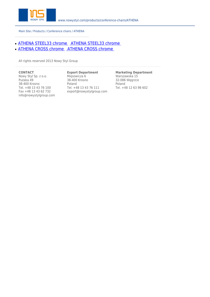 www.nowystyl.com/products/conference-chairs/ATHENA Main Site / Products / Conference chairs / ATHENA ● ● ATHENA STEEL33 chrome ATHENA STEEL33 chrome ATHENA CROSS chrome ATHENA CROSS chrome All rights reserved 2013 Nowy Styl Group CONTACT Nowy Styl Sp. z o.o. Pużaka 49 38-400 Krosno Tel. +48 13 43 76 100 Fax +48 13 43 62 732 [email protected] Export Department Mięsowicza 6 38-400 Krosno Poland Tel. +48 13 43 76 111 [email protected] Marketing Department Warszawska 15 32-086 Węgrzce Poland Tel. +48 12 63 98 602