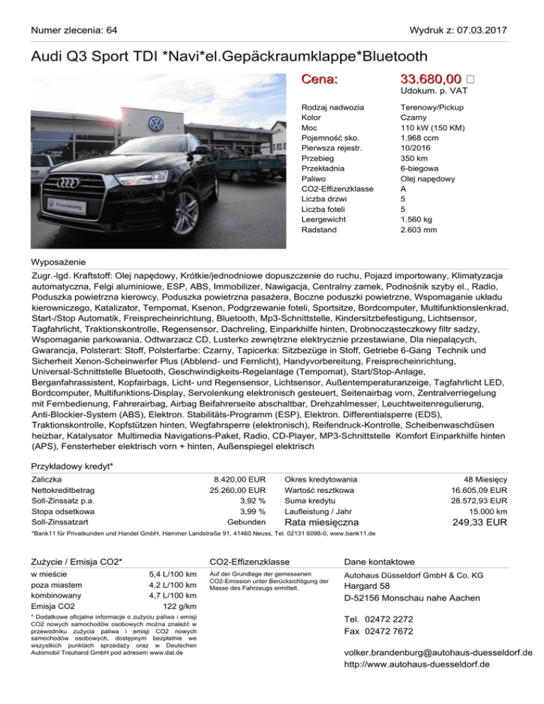 Numer zlecenia: 64 Wydruk z: 07.03.2017 Audi Q3 Sport TDI *Navi*el.Gepäckraumklappe*Bluetooth Cena: 33.680,00 Rodzaj nadwozia Kolor Moc Pojemność sko. Pierwsza rejestr. Przebieg Przekładnia Paliwo CO2-Effizenzklasse Liczba drzwi Liczba foteli Leergewicht Radstand Terenowy/Pickup Czarny 110 kW (150 KM) 1.968 ccm 10/2016 350 km 6-biegowa Olej napędowy A 5 5 1.560 kg 2.603 mm Udokum. p. VAT Wyposażenie Zugr.-lgd. Kraftstoff: Olej napędowy, Krótkie/jednodniowe dopuszczenie do ruchu, Pojazd importowany, Klimatyzacja automatyczna, Felgi aluminiowe, ESP, ABS, Immobilizer, Nawigacja, Centralny zamek, Podnośnik szyby el., Radio, Poduszka powietrzna kierowcy, Poduszka powietrzna pasażera, Boczne poduszki powietrzne, Wspomaganie układu kierowniczego, Katalizator, Tempomat, Ksenon, Podgrzewanie foteli, Sportsitze, Bordcomputer, Multifunktionslenkrad, Start-/Stop Automatik, Freisprecheinrichtung, Bluetooth, Mp3-Schnittstelle, Kindersitzbefestigung, Lichtsensor, Tagfahrlicht, Traktionskontrolle, Regensensor, Dachreling, Einparkhilfe hinten, Drobnocząsteczkowy filtr sadzy, Wspomaganie parkowania, Odtwarzacz CD, Lusterko zewnętrzne elektrycznie przestawiane, Dla niepalących, Gwarancja, Polsterart: Stoff, Polsterfarbe: Czarny, Tapicerka: Sitzbezüge in Stoff, Getriebe 6-Gang Technik und Sicherheit Xenon-Scheinwerfer Plus (Abblend- und Fernlicht), Handyvorbereitung, Freisprecheinrichtung, Universal-Schnittstelle Bluetooth, Geschwindigkeits-Regelanlage (Tempomat), Start/Stop-Anlage, Berganfahrassistent, Kopfairbags, Licht- und Regensensor, Lichtsensor, Außentemperaturanzeige, Tagfahrlicht LED, Bordcomputer, Multifunktions-Display, Servolenkung elektronisch gesteuert, Seitenairbag vorn, Zentralverriegelung mit Fernbedienung, Fahrerairbag, Airbag Beifahrerseite abschaltbar, Drehzahlmesser, Leuchtweitenregulierung, Anti-Blockier-System (ABS), Elektron. Stabilitäts-Programm (ESP), Elektron. Differentialsperre (EDS), Traktionskontrolle, Kopfstützen hinten, Wegfahrsperre (elektronisch), Reifendruck-Kontrolle, Scheibenwaschdüsen heizbar, Katalysator Multimedia Navigations-Paket, Radio, CD-Player, MP3-Schnittstelle Komfort Einparkhilfe hinten (APS), Fensterheber elektrisch vorn + hinten, Außenspiegel elektrisch Przykładowy kredyt* Zaliczka Nettokreditbetrag Soll-Zinssatz p.a. Stopa odsetkowa Soll-Zinssatzart 8.420,00 EUR 25.260,00 EUR 3,92 % 3,99 % Gebunden Okres kredytowania Wartość resztkowa Suma kredytu Laufleistung / Jahr 48 Miesięcy 16.605,09 EUR 28.572,93 EUR 15.000 km Rata miesięczna 249,33 EUR *Bank11 für Privatkunden und Handel GmbH, Hammer Landstraße 91, 41460 Neuss, Tel. 02131 6098-0, www.bank11.de Zużycie / Emisja CO2* w mieście poza miastem kombinowany Emisja CO2 5,4 L/100 km 4,2 L/100 km 4,7 L/100 km 122 g/km * Dodatkowe oficjalne informacje o zużyciu paliwa i emisji CO2 nowych samochodów osobowych można znaleźć w przewodniku zużycia paliwa i emisji CO2 nowych samochodów osobowych, dostępnym bezpłatnie we wszystkich punktach sprzedaży oraz w Deutschen Automobil Treuhand GmbH pod adresem www.dat.de CO2-Effizenzklasse Dane kontaktowe Auf der Grundlage der gemessenen CO2-Emission unter Berücksichtigung der Masse des Fahrzeugs ermittelt. Autohaus Düsseldorf GmbH & Co. KG Hargard 58 D-52156 Monschau nahe Aachen Tel. 02472 2272 Fax 02472 7672 [email protected] http://www.autohaus-duesseldorf.de Numer zlecenia: 64 Wydruk z: 07.03.2017 Audi Q3 Sport TDI *Navi*el.Gepäckraumklappe*Bluetooth Numer zlecenia: 64 Wydruk z: 07.03.2017 Audi Q3 Sport TDI *Navi*el.Gepäckraumklappe*Bluetooth Numer zlecenia: 64 Wydruk z: 07.03.2017 Audi Q3 Sport TDI *Navi*el.Gepäckraumklappe*Bluetooth