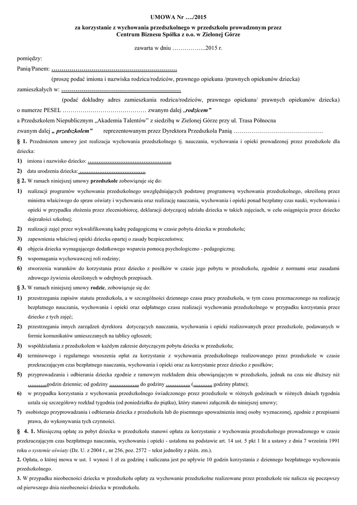 UMOWA Nr …./2015 za korzystanie z wychowania przedszkolnego w przedszkolu prowadzonym przez Centrum Biznesu Spółka z o.o. w Zielonej Górze zawarta w dniu ……………..2015 r. pomiędzy: Panią/Panem: ……………………………………………………… (proszę podać imiona i nazwiska rodzica/rodziców, prawnego opiekuna /prawnych opiekunów dziecka) zamieszkałych w: …………………………………………………… (podać dokładny adres zamieszkania rodzica/rodziców, prawnego opiekuna/ prawnych opiekunów dziecka) o numerze PESEL …………………………………… zwanym dalej „rodzicem” a Przedszkolem Niepublicznym „Akademia Talentów” z siedzibą w Zielonej Górze przy ul. Trasa Północna zwanym dalej „ przedszkolem” reprezentowanym przez Dyrektora Przedszkola Panią ……………………………………… § 1. Przedmiotem umowy jest realizacja wychowania przedszkolnego tj. nauczania, wychowania i opieki prowadzonej przez przedszkole dla dziecka: 1) imiona i nazwisko dziecko: ……………………………………….. 2) data urodzenia dziecka: ………………………………. § 2. W ramach niniejszej umowy przedszkole zobowiązuje się do: 1) realizacji programów wychowania przedszkolnego uwzględniających podstawę programową wychowania przedszkolnego, określoną przez ministra właściwego do spraw oświaty i wychowania oraz realizację nauczania, wychowania i opieki ponad bezpłatny czas nauki, wychowania i opieki w przypadku złożenia przez zleceniobiorcę, deklaracji dotyczącej udziału dziecka w takich zajęciach, w celu osiągnięcia przez dziecko dojrzałości szkolnej; 2) realizacji zajęć przez wykwalifikowaną kadrę pedagogiczną w czasie pobytu dziecka w przedszkolu; 3) zapewnienia właściwej opieki dziecku opartej o zasady bezpieczeństwa; 4) objęcia dziecka wymagającego dodatkowego wsparcia pomocą psychologiczno - pedagogiczną; 5) wspomagania wychowawczej roli rodziny; 6) stworzenia warunków do korzystania przez dziecko z posiłków w czasie jego pobytu w przedszkolu, zgodnie z normami oraz zasadami zdrowego żywienia określonych w odrębnych przepisach. § 3. W ramach niniejszej umowy rodzic, zobowiązuje się do: 1) przestrzegania zapisów statutu przedszkola, a w szczególności dziennego czasu pracy przedszkola, w tym czasu przeznaczonego na realizację bezpłatnego nauczania, wychowania i opieki oraz odpłatnego czasu realizacji wychowania przedszkolnego w przypadku korzystania przez dziecko z tych zajęć; 2) przestrzegania innych zarządzeń dyrektora dotyczących nauczania, wychowania i opieki realizowanych przez przedszkole, podawanych w formie komunikatów umieszczanych na tablicy ogłoszeń; 3) współdziałania z przedszkolem w każdym zakresie dotyczącym pobytu dziecka w przedszkolu; 4) terminowego i regularnego wnoszenia opłat za korzystanie z wychowania przedszkolnego realizowanego przez przedszkole w czasie przekraczającym czas bezpłatnego nauczania, wychowania i opieki oraz za korzystanie przez dziecko z posiłków; 5) przyprowadzania i odbierania dziecka zgodnie z ramowym rozkładem dnia obowiązującym w przedszkolu, jednak na czas nie dłuższy niż ………..godzin dziennie; od godziny …………….. do godziny ………….. (……….. godziny płatne); 6) w przypadku korzystania z wychowania przedszkolnego świadczonego przez przedszkole w różnych godzinach w różnych dniach tygodnia ustala się szczegółowy rozkład tygodnia (od poniedziałku do piątku), który stanowi załącznik do niniejszej umowy; 7) osobistego przyprowadzania i odbierania dziecka z przedszkola lub do pisemnego upoważnienia innej osoby wyznaczonej, zgodnie z przepisami prawa, do wykonywania tych czynności. § 4. 1. Miesięczną opłatę za pobyt dziecka w przedszkolu stanowi opłata za korzystanie z wychowania przedszkolnego prowadzonego w czasie przekraczającym czas bezpłatnego nauczania, wychowania i opieki - ustalona na podstawie art. 14 ust. 5 pkt 1 lit a ustawy z dnia 7 września 1991 roku o systemie oświaty (Dz. U. z 2004 r., nr 256, poz. 2572 – tekst jednolity z późn. zm.). 2. Opłata, o której mowa w ust. 1 wynosi 1 zł za godzinę i naliczana jest po upływie 10 godzin korzystania z dziennego bezpłatnego wychowania przedszkolnego. 3. W przypadku nieobecności dziecka w przedszkolu opłaty za wychowanie przedszkolne realizowane przez przedszkole nie nalicza się począwszy od pierwszego dnia nieobecności dziecka w przedszkolu. § 5.1. Opłaty za korzystanie z posiłków wydawanych w czasie godzin pobytu dziecka w przedszkolu pokrywają koszty produktów żywnościowych i wynoszą ……. zł dziennie. 2. W przypadku nieobecności dziecka w przedszkolu opłaty za korzystanie z posiłków nie nalicza się począwszy od pierwszego dnia nieobecności dziecka w przedszkolu. § 6. Opłaty miesięcznej rodzic dokonuje z dołu w terminie do 15 dnia kolejnego miesiąca, następującego po miesiącu realizacji nauczania, wychowania i opieki przez przedszkole. § 7. Opłatę miesięczną ponosi się w czasie trwania całego roku szkolnego z wyłączeniem przerw w pracy przedszkola, określanych zgodnie z odrębnymi przepisami. § 8. Rodzic zobowiązuje się do terminowego i regularnego ponoszenia opłat za korzystanie z nauczania, wychowania i opieki oraz wyżywienia realizowanych w przedszkolu. § 9. Opłatę miesięczną za pobyt dziecka w przedszkolu należy regulować poprzez dokonanie wpłaty wymaganej kwoty na nr konta bankowego …………………………………….. z podaniem w tytule płatności: imienia i nazwiska dziecka, nr grupy przedszkolnej, oraz miesiąca, którego dotyczy opłata; § 10. Dniem zapłaty jest dzień uznania rachunku bankowego przedszkola. § 11. Za zwłokę w dokonywaniu opłat, o których mowa w umowie, dyrektor przedszkola nalicza ustawowe odsetki. § 12. Niniejsza umowa może być rozwiązana przez: 1) rodzica, za 30 - dnio