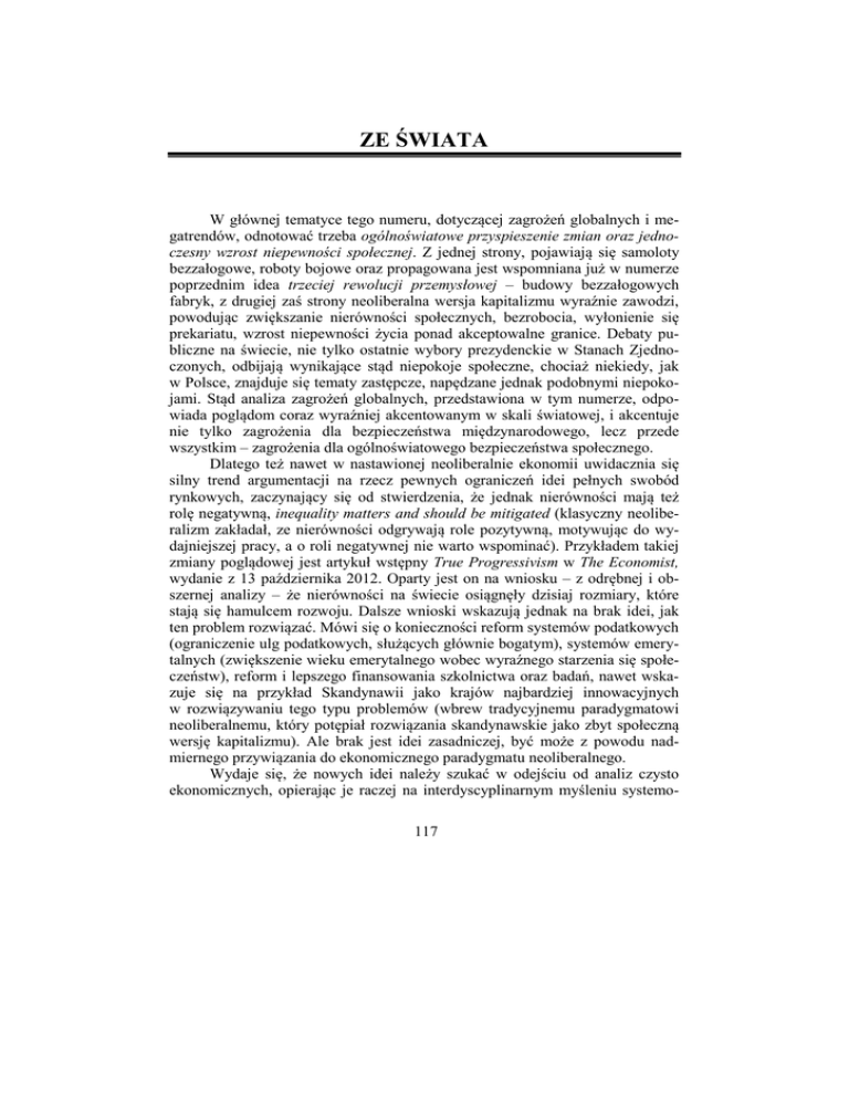 ZE ŚWIATA W głównej tematyce tego numeru, dotyczącej zagrożeń globalnych i megatrendów, odnotować trzeba ogólnoświatowe przyspieszenie zmian oraz jednoczesny wzrost niepewności społecznej. Z jednej strony, pojawiają się samoloty bezzałogowe, roboty bojowe oraz propagowana jest wspomniana już w numerze poprzednim idea trzeciej rewolucji przemysłowej – budowy bezzałogowych fabryk, z drugiej zaś strony neoliberalna wersja kapitalizmu wyraźnie zawodzi, powodując zwiększanie nierówności społecznych, bezrobocia, wyłonienie się prekariatu, wzrost niepewności życia ponad akceptowalne granice. Debaty publiczne na świecie, nie tylko ostatnie wybory prezydenckie w Stanach Zjednoczonych, odbijają wynikające stąd niepokoje społeczne, chociaż niekiedy, jak w Polsce, znajduje się tematy zastępcze, napędzane jednak podobnymi niepokojami. Stąd analiza zagrożeń globalnych, przedstawiona w tym numerze, odpowiada poglądom coraz wyraźniej akcentowanym w skali światowej, i akcentuje nie tylko zagrożenia dla bezpieczeństwa międzynarodowego, lecz przede wszystkim – zagrożenia dla ogólnoświatowego bezpieczeństwa społecznego. Dlatego też nawet w nastawionej neoliberalnie ekonomii uwidacznia się silny trend argumentacji na rzecz pewnych ograniczeń idei pełnych swobód rynkowych, zaczynający się od stwierdzenia, że jednak nierówności mają też rolę negatywną, inequality matters and should be mitigated (klasyczny neoliberalizm zakładał, ze nierówności odgrywają role pozytywną, motywując do wydajniejszej pracy, a o roli negatywnej nie warto wspominać). Przykładem takiej zmiany poglądowej jest artykuł wstępny True Progressivism w The Economist, wydanie z 13 października 2012. Oparty jest on na wniosku – z odrębnej i obszernej analizy – że nierówności na świecie osiągnęły dzisiaj rozmiary, które stają się hamulcem rozwoju. Dalsze wnioski wskazują jednak na brak idei, jak ten problem rozwiązać. Mówi się o konieczności reform systemów podatkowych (ograniczenie ulg podatkowych, służących głównie bogatym), systemów emerytalnych (zwiększenie wieku emerytalnego wobec wyraźnego starzenia się społeczeństw), reform i lepszego finansowania szkolnictwa oraz badań, nawet wskazuje się na przykład Skandynawii jako krajów najbardziej innowacyjnych w rozwiązywaniu tego typu problemów (wbrew tradycyjnemu paradygmatowi neoliberalnemu, który potępiał rozwiązania skandynawskie jako zbyt społeczną wersję kapitalizmu). Ale brak jest idei zasadniczej, być może z powodu nadmiernego przywiązania do ekonomicznego paradygmatu neoliberalnego. Wydaje się, że nowych idei należy szukać w odejściu od analiz czysto ekonomicznych, opierając je raczej na interdyscyplinarnym myśleniu systemo117 ZE ŚWIATA wym, silniejszym uwzględnieniu zagadnień kulturowych i społecznych, opartym jednocześnie na dobrym zrozumieniu zmian współczesnej techniki. Można np. kwestionować, czy wzrost ekonomiczny ma i powinien być celem nadrzędnym, czy nie można zamiast niego nastawiać się na wzrost jakości życia? Skoro nieunikniona jest automatyzacja i robotyzacja wszelkiej produkcji, to czy praca w usługach da społeczeństwu dostateczną ilość trwałych stanowisk pracy? Czy ludzie wykorzystają wynikający stąd wolny czas zadowalając się rozrywką, czy też doświadczenia epoki cywilizacji przemysłowej spowodowały nowe zjawisko – wymaganie względnie trwałego zatrudnienia jako warunek samorealizacji oraz podtrzymania godności człowieka (wyłącznie homo ludens, czy także homo faber)? Czy ogólne ułatwienia życia wynikające z rewolucji informacyjnej powinny służyć tylko bogaceniu się (praktyka wskazuje, że głównie nielicznych), czy tez uzasadniają one sformułowanie nowych i obszerniejszych podstawowych praw człowieka, nadrzędnych w stosunku zarówno do państwa jak i rynku? Czy do tych nowych praw nie powinno należeć np. prawo do względnie trwałego zatrudnienia? Czy nie należy tak zmodyfikować współczesnego systemu kapitalistycznego, aby mógł on zapewnić realizację takich nowych praw podstawowych? Odrębna sprawa, czy to potem nazwać nowym kapitalizmem społecznym, czy nowym progresywizmem. Tego typu pytania zaczynają się pojawiać na świecie, np. w Japonii czy Szwecji. W Polsce, kilka z artykułów bieżącego numeru podnosi także – z wolna i ostrożnie – podobne pytania. 118