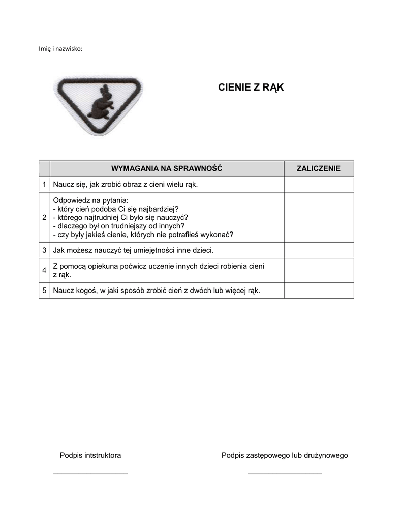 Imię i nazwisko: CIENIE Z RĄK WYMAGANIA NA SPRAWNOŚĆ ZALICZENIE 1 Naucz się, jak zrobić obraz z cieni wielu rąk. Odpowiedz na pytania: - który cień podoba Ci się najbardziej? 2 - którego najtrudniej Ci było się nauczyć? - dlaczego był on trudniejszy od innych? - czy były jakieś cienie, których nie potrafiłeś wykonać? 3 Jak możesz nauczyć tej umiejętności inne dzieci. 4 Z pomocą opiekuna poćwicz uczenie innych dzieci robienia cieni z rąk. 5 Naucz kogoś, w jaki sposób zrobić cień z dwóch lub więcej rąk. Podpis intstruktora Podpis zastępowego lub drużynowego __________________ __________________