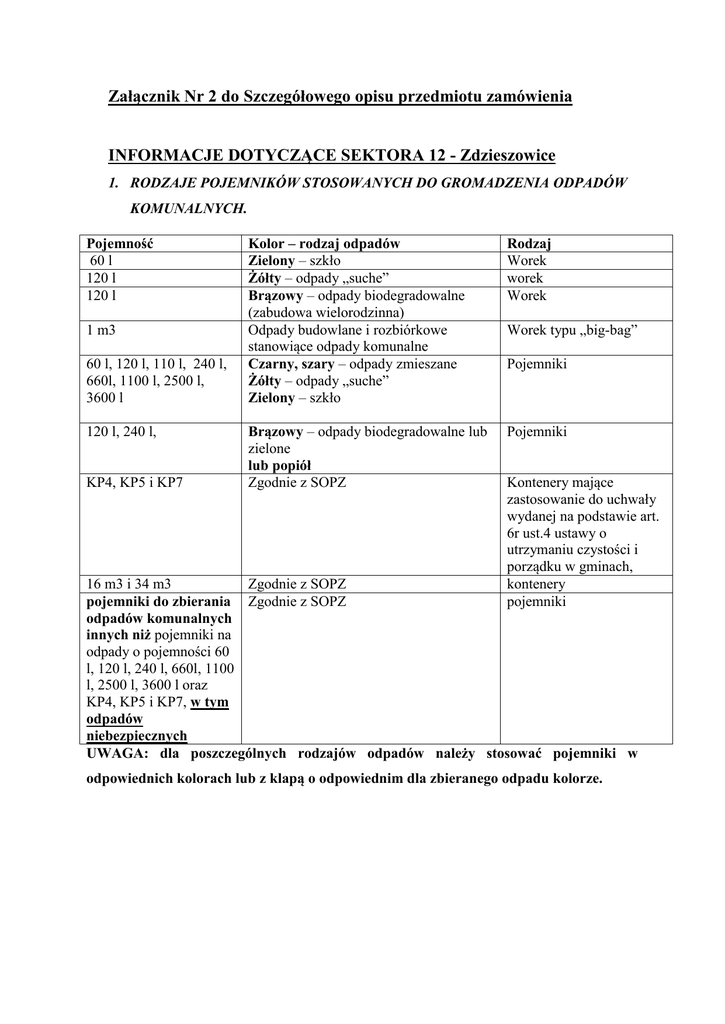 Załącznik Nr 2 do Szczegółowego opisu przedmiotu zamówienia INFORMACJE DOTYCZĄCE SEKTORA 12 - Zdzieszowice 1. RODZAJE POJEMNIKÓW STOSOWANYCH DO GROMADZENIA ODPADÓW KOMUNALNYCH. Pojemność 60 l 120 l 120 l 1 m3 60 l, 120 l, 110 l, 240 l, 660l, 1100 l, 2500 l, 3600 l 120 l, 240 l, KP4, KP5 i KP7 Kolor – rodzaj odpadów Zielony – szkło Żółty – odpady „suche” Brązowy – odpady biodegradowalne (zabudowa wielorodzinna) Odpady budowlane i rozbiórkowe stanowiące odpady komunalne Czarny, szary – odpady zmieszane Żółty – odpady „suche” Zielony – szkło Rodzaj Worek worek Worek Brązowy – odpady biodegradowalne lub zielone lub popiół Zgodnie z SOPZ Pojemniki Worek typu „big-bag” Pojemniki Kontenery mające zastosowanie do uchwały wydanej na podstawie art. 6r ust.4 ustawy o utrzymaniu czystości i porządku w gminach, kontenery pojemniki 16 m3 i 34 m3 Zgodnie z SOPZ pojemniki do zbierania Zgodnie z SOPZ odpadów komunalnych innych niż pojemniki na odpady o pojemności 60 l, 120 l, 240 l, 660l, 1100 l, 2500 l, 3600 l oraz KP4, KP5 i KP7, w tym odpadów niebezpiecznych UWAGA: dla poszczególnych rodzajów odpadów należy stosować pojemniki w odpowiednich kolorach lub z klapą o odpowiednim dla zbieranego odpadu kolorze. 2. STRUKTURA NIERUCHOMOŚCI NA TERENIE GMINY Dane według stanu na dzień wszczęcia postepowania Liczba ludności według złożonych deklaracji w tym: zamieszkałych w zabudowie jednorodzinnej zamieszkałych w zabudowie wielorodzinnej Ilość budynków w zabudowie jednorodzinnej Ilość budynków w zabudowie wielorodzinnej Ilość podmiotów gospodarczych 12239 6296 5943 2303 275 321 Zamawiający określa, że maksymalne zwiększenie ilości nieruchomości ponad określone w tabeli powyżej: - wiersz 4- ilość budynków w zabudowie jednorodzinnej- wyniesie nie więcej niż 10% przez cały okres obowiązywania umowy, - wiersz 5 -ilość budynków w zabudowie wielorodzinnej- wyniesie nie więcej niż 5% przez cały okres obowiązywania umowy, - wiersz 6- ilość podmiotów gospodarczych - wyniesie nie więcej niż 10% przez cały okres obowiązywania umowy. 2.1. WYKAZ NIERUCHOMOŚCI zawierający dane na temat ilości osób zamieszkałych wraz z zadeklarowaną ilością pojemników i worków na danej nieruchomości stanowi załącznik 1A do SOPZ; wykaz zawiera dane na dzień wszczęcia postępowania. 3. MAKSYMALNE ZAPOTRZEBOWANIE NA POJEMNIKI o różnej pojemności wynosi: 5.530 szt. MAKSYMALNE ZAPOTRZEBOWANIE na worki o pojemności 60 l i 120 l na jeden wywóz odpadów wynosi: 10.630 szt. MAKSYMALNE : RODZAJE, POJEMNOŚCI I ILOŚCI POJEMNIKÓW I WORKÓW: POJEMNIKI Pojemnik Czarny (60.00l): Pojemnik Czarny (120.00l): Pojemnik Czarny (240.00l): Pojemnik Czarny (660.00l): Pojemnik Czarny (1100.00l): Pojemnik Czarny (3600.00l): Pojemnik Czarny (2500.00l): Pojemnik Czarny (16000.00l): Pojemnik Czarny (34000.00l): Pojemnik żółty (60.00l): Pojemnik żółty (120.00l): Pojemnik żółty (240.00l): Pojemnik żółty (660.00l): 95 2200 550 90 125 6 15 1 0 100 120 100 90 Pojemnik żółty (1100.00l): Pojemnik żółty (3600.00l): Pojemnik żółty (2500.00l): Pojemnik żółty (16000.00l): Pojemnik żółty (34000.00l): Pojemnik zielony (60.00l): Pojemnik zielony (120.00l): Pojemnik zielony (240.00l): Pojemnik zielony (660.00l): Pojemnik zielony (1100.00l): Pojemnik zielony (3600.00l): Pojemnik zielony (2500.00l): Pojemnik zielony (16000.00l): Pojemnik zielony (34000.00l): Pojemnik brązowy (120.00l): Pojemnik brązowy(240.00l): Razem pojemniki (max. ilość w okresie trwania umowy) 100 8 10 0 0 130 105 95 40 40 0 10 0 0 650 850 5.530,00 WORKI Worek zielony (60.00l): Worek brązowy (120.00l): Worek żółty (120.00l): Razem worki (max. ilość na jeden wywóz) 5100 30 5500 10.630,00 4. ILOŚĆ ODPADÓW ODEBRANYCH Z TERENU GMINY w roku 2013 oraz 2014 roku określa poniższa tabela Kod odebranych odpadów komunalnych Rodzaj odebranych odpadów komunalnych 20 03 01 ZMIESZANE ODPADY KOMUNALNE Niesegregowane(zmieszane)odpady komunalne 15 01 01 15 01 02 15 01 04 15 01 06 15 01 07 15 01 10 16 01 03 17 01 01 SEGREGOWANE ODPADY KOMUNALNE Opakowania z papieru i tektury Opakowania z tworzyw sztucznych Opakowania z metali Zmieszane odpady opakowaniowe Opakowania ze szkła Opakowania zawierające pozostałości substancji niebezpiecznych lub nimi zanieczyszczone Zużyte opony Odpady betonu oraz gruz betonowy z rozbiórek i remontów Masa odebranych odpadów komunalnych [Mg]w 2013r. RAZEM Masa odebranych odpadów komunalnych [Mg]w 2014r. RAZEM 4 321,9 3 184,8 49,2 73,1 13,7 76,8 168,0 447,3 218,5 7,7 0,2 4,9 6,6 17 01 02 Gruz ceglany 7,7 94,2 17 01 07 Zmieszane odpady z betonu, gruzu ceglanego, odpadowych materiałów ceramicznych i elementów wyposażenia inne niż wymienione w 17 01 06 8,1 9,1 1,6 15,5 17 05 04 17 09 04 20 01 01 20 01 02 20 01 08 20 01 10 20 01 21 20 01 23 20 01 27 20 01 28 20 01 32 20 01 33 Gleba i ziemia, w tym kamienie inne niż wymienione w 17 05 03 Zmieszane odpady z budowy, remontów i demontażu inne niż wymienione w 17 09 01, 17 09 02 i 17 09 03 Papier i tektura Szkło Odpady kuchenne ulegające biodegradacji Odzież 30,0 3,2 Lampy fluoroscencyjne i inne odpady zawierające rtęć Urządzenia zawierające freony 0,7 0,9 Farby, tusze, farby drukarskie, kleje, lepiszcze i żywice zawierające substancje niebezpieczne Farby, tusze, farby drukarskie, kleje, lepiszcze i żywice itd… Leki inne niż wymienione w 20 01 31 0,8 0,03 0,2 Baterie i akumulatory łącznie z bateriami i akumulatorami wymienionymi w 16 06 01, 16 06 02 20 01 34 Baterie i akumulatory inne niż wymienione w 20 01 33 20 01 35 20 01 36 20 01 39 20 01 40 20 02 01 20 02 03 20 03 07 20 03 99 Zużyte urządzenia elektryczne i elektroniczne inne niż wymienione w 20 0 1 21 i 20 01 23 zawierające niebezpieczne składniki Zużyte urządzenia elektryczne i elektroniczne inne niż wymienione w 20 01 21, 20 01 23 i 20 01 35 Tworzywa sztuczne Metal Odpady ulegające biodeg