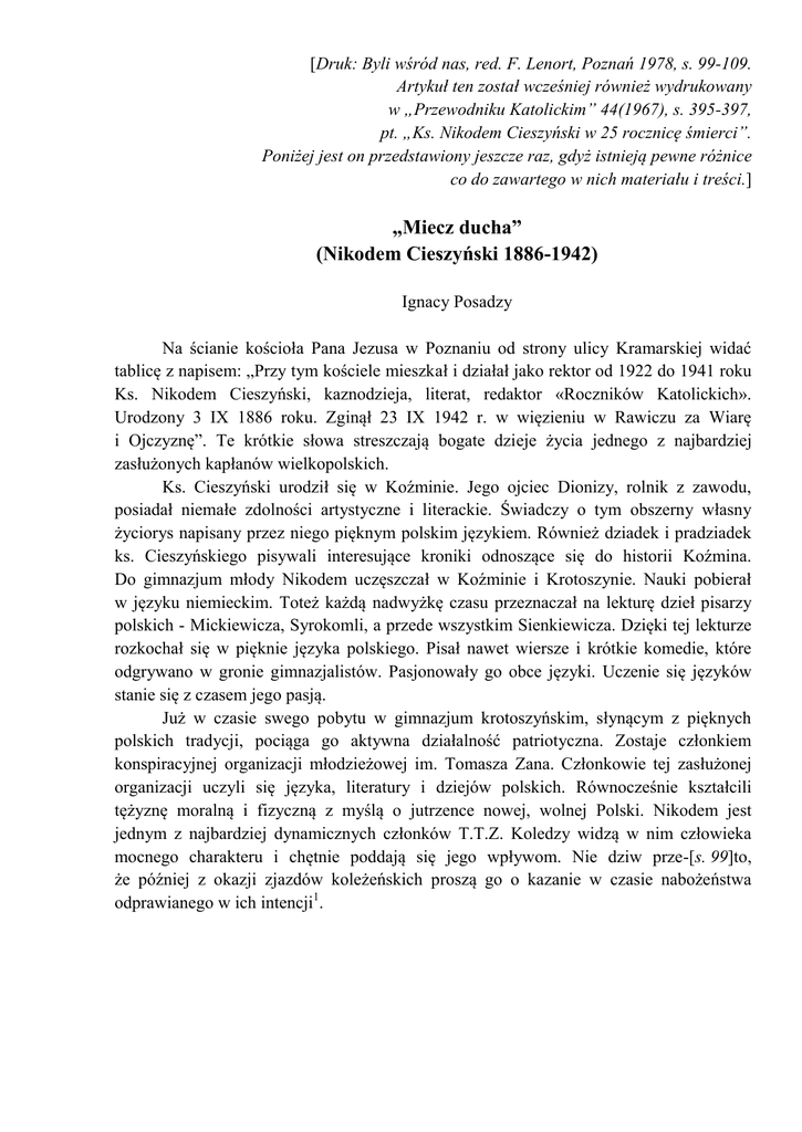 [Druk: Byli wśród nas, red. F. Lenort, Poznań 1978, s. 99-109. Artykuł ten został wcześniej również wydrukowany w „Przewodniku Katolickim” 44(1967), s. 395-397, pt. „Ks. Nikodem Cieszyński w 25 rocznicę śmierci”. Poniżej jest on przedstawiony jeszcze raz, gdyż istnieją pewne różnice co do zawartego w nich materiału i treści.] „Miecz ducha” (Nikodem Cieszyński 1886-1942) Ignacy Posadzy Na ścianie kościoła Pana Jezusa w Poznaniu od strony ulicy Kramarskiej widać tablicę z napisem: „Przy tym kościele mieszkał i działał jako rektor od 1922 do 1941 roku Ks. Nikodem Cieszyński, kaznodzieja, literat, redaktor «Roczników Katolickich». Urodzony 3 IX 1886 roku. Zginął 23 IX 1942 r. w więzieniu w Rawiczu za Wiarę i Ojczyznę”. Te krótkie słowa streszczają bogate dzieje życia jednego z najbardziej zasłużonych kapłanów wielkopolskich. Ks. Cieszyński urodził się w Koźminie. Jego ojciec Dionizy, rolnik z zawodu, posiadał niemałe zdolności artystyczne i literackie. Świadczy o tym obszerny własny życiorys napisany przez niego pięknym polskim językiem. Również dziadek i pradziadek ks. Cieszyńskiego pisywali interesujące kroniki odnoszące się do historii Koźmina. Do gimnazjum młody Nikodem uczęszczał w Koźminie i Krotoszynie. Nauki pobierał w języku niemieckim. Toteż każdą nadwyżkę czasu przeznaczał na lekturę dzieł pisarzy polskich - Mickiewicza, Syrokomli, a przede wszystkim Sienkiewicza. Dzięki tej lekturze rozkochał się w pięknie języka polskiego. Pisał nawet wiersze i krótkie komedie, które odgrywano w gronie gimnazjalistów. Pasjonowały go obce języki. Uczenie się języków stanie się z czasem jego pasją. Już w czasie swego pobytu w gimnazjum krotoszyńskim, słynącym z pięknych polskich tradycji, pociąga go aktywna działalność patriotyczna. Zostaje członkiem konspiracyjnej organizacji młodzieżowej im. Tomasza Zana. Członkowie tej zasłużonej organizacji uczyli się języka, literatury i dziejów polskich. Równocześnie kształcili tężyznę moralną i fizyczną z myślą o jutrzence nowej, wolnej Polski. Nikodem jest jednym z najbardziej dynamicznych członków T.T.Z. Koledzy widzą w nim człowieka mocnego charakteru i chętnie poddają się jego wpływom. Nie dziw prze-[s. 99]to, że później z okazji zjazdów koleżeńskich proszą go o kazanie w czasie nabożeństwa odprawianego w ich intencji1. W roku 1906 po złożeniu egzaminu dojrzałości zgłosił się do seminarium duchownego w Poznaniu. Obok studium filozofii i teologii poświęcał dużo czasu nauce języków oraz pracy literackiej. Zajmował się też ruchem abstynenckim, szerząc jego ideał wśród kleryków. Dla pogłębienia znajomości tego ruchu był w stałym kontakcie z ks. Kazimierzem Niesiołowskim z Pleszewa, prezesem Związku Księży Abstynentów na diecezję gnieźnieńską i poznańską. W roku 1907 w „Miesięczniku dla Popierania Wstrzemięźliwości” ukazuje się jego artykuł zwalczający używanie napojów alkoholowych. Nieco później tłumaczy pracę Augustyna Eggera „Duchowieństwo a walka z alkoholizmem”. 31 I 1910 roku otrzymuje w Gnieźnie święcenia kapłańskie z rąk biskupa Edwarda Likowskiego. Władza duchowna przeznacza go do pracy duszpasterskiej w Poznaniu. Pełni kolejno obowiązki wikariusza przy kościele Matki Boskiej Bolesnej, przy kościele Bożego Ciała, a od roku 1913 w parafii katedralnej. W roku 1915 obejmuje prebendę przy kościele Dominikanów (dziś kościół Jezuitów). W roku 1922 przejmuje rektorat kościoła Pana Jezusa. Obowiązki te pełni do roku 1941 - do chwili aresztowania przez gestapo. Poznałem ks. Cieszyńskiego z początkiem 1921 roku, kiedy zostałem wikariuszemmansjonarzem przy kościele farnym w Poznaniu. Zaofiarował mi od razu swoją przyjaźń. Ta przyjaźń wycisnęła na moim życiu kapłańskim dość wyraźne piętno. Uważam sobie za wielką łaskę, że na drodze mego życia spotkałem takiego przyjaciela. Byłbym zawsze pełny podziwu dla jego wartości ludzkich, jego charakteru, dla jego głębokich zasad moralnych. Była to w pełni ukształtowana osobowość. Posiadał wybitną kulturę religijną oraz społeczno-towarzyską. Był prosty i bezkompromisowy. Kochał prawdę, nie znosił fałszu, obłudy. Stąd nieraz jego słowa prawdy, otwarcie wypowiedziane, spotykały się z przykrą reakcją. Wszyscy jednak byli pełni uznania dla jego prostolinijności. Miał wielkie poczucie piękna, zwłaszcza w muzyce i w malarstwie. Kochał przyrodę, bo widział w niej odblask piękna Bożego. Był zawsze radosny. Mawiał, że nazwisko jego zobowiązuje go, by był siewcą radości. Chętnie też przytaczał słowa Bernanosa: „Chrześcijanie, gdzie, do licha, kryjecie swoją radość? Trudno uwierzyć, że to wam, i to wam jedynym, przyrzeczona została radość Pana”. Nigdy nie zrażał się trudnościami. Uważał, że Bóg zsyła trudności, by nam dać okazję do zasługi. Był karnym wobec siebie. Uważał, że karność sprzyja porządkowi, wzmacnia wolę, nagina ją do obowiązku i cnoty. [s. 100] Ustanowił sobie regulamin dnia, którego przestrzegał skrupulatnie. Był maksymalistą, nastawiony na to, by od siebie wymagać jak najwięcej. Przyswoił sobie hasło dra Tarnawskiego, założyciela Kosowa: „Władaj sobą”. W tym celu uprawiał codziennie gimnastykę, po południu rąbał drzewo, idąc tu za wzorem biskupa Antoniego Laubitza. Często uprawiał głodówkę. Promieniował serdecznością. W obejściu był bezpośredni i wyrozumiały. Potrafił zdobywać sobie ludzi i zawsze miał wkoło siebie oddanych przyjaciół. Szczycił się osobistą przyjaźnią nawet z wielu wybitnymi uczonymi za granicą. Żywił prawdziwy pietyzm dla każdego człowieka. Ze szczególną czcią odnosił się do wszelkiej biedy ludzkiej, do wszystkich ludzi upośledzonych. Mawiał, że „każdy jako klejnot ma być strzeżony, bo każdy