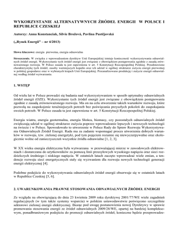 WYKORZYSTANIE ALTERNATYWNYCH ŹRÓDEŁ ENERGII W POLSCE I REPUBLICE CZESKIEJ Autorzy: Anna Konstanciak, Silvie Brožová, Pavlina Pustějovská („Rynek Energii” – nr 4/2013) Słowa kluczowe: energia pierwotna, energia odnawialna Streszczenie. W związku z wprowadzaniem dyrektyw Unii Europejskiej istnieje konieczność wykorzystywania odnawialnych źródeł energii. Wykorzystanie tych źródeł energii jest związane z obowiązkiem postępowania zgodnie z zasadą zrównoważonego rozwoju. W Polsce zasada ta jest zapewniona w art. 5 Konstytucji Rzeczpospolitej Polskiej. Przedstawiono charakterystykę tych źródeł, zasoby ważniejszych kopalin oraz ich udział w ogólnej strukturze zużycia energii pierwotnej w polskiej gospodarce oraz w wybranych krajach Unii Europejskiej. Przeanalizowano produkcję i zużycie energii odnawialnej według źródeł wytwarzania. 1. WSTĘP Od wielu lat w Polsce prowadzi się badania nad wykorzystywaniem w sposób optymalny odnawialnych źródeł energii (OZE). Wykorzystanie tych źródeł energii jest związane z obowiązkiem postępowania zgodnie z zasadą zrównoważonego rozwoju. Ma on na celu stworzenie takich warunków rozwoju, które pozwolą na zaspokojenie teraźniejszych potrzeb bez poświęcania przyszłych pokoleń do zaspokajania swoich potrzeb. W Polsce zasada ta jest zapewniona w art. 5 Konstytucji Rzeczpospolitej Polskiej. Energia wiatru, energia geotermalna, energia Słońca, biomasy, czy pozostałych odnawialnych źródeł zwiększają udział w ogólnej strukturze zużycia poprzez wprowadzanie lepszych i nowszych technologii na świecie i w Polsce. Spowodowało to utworzenie w Polsce Rady do Spraw Rozwoju Wykorzystywania Odnawialnych Źródeł Energii. Rada ma za zadanie wspomagać proces utworzenia dobrych warunków w rozwoju, tzw. zielonej energetyki, pod tym pojęciem rozumie się niewyczerpywalne oraz ekologicznie wolne od zanieczyszczeń wszystkie źródła odnawialne [1, 2, 3]. W XX wieku energia elektryczna była wytwarzana w przeważającej mierze w zawodowych elektrowniach i dostarczana do użytkowników za pomocą linii przesyłowych wysokiego napięcia oraz sieci rozdzielczych średniego i niskiego napięcia. W ostatnich latach zaczęto wprowadzać wiele zmian, a tendencje rozwoju sieci energetycznych stały się wyzwaniem dla rozwoju nowych technologii generacji energii elektrycznej [4]. Podobne podejście do wykorzystywania odnawialnych źródeł energii obserwuje się w ostatnich latach w Republice Czeskiej [5, 6]. 2. UWARUNKOWANIA PRAWNE STOSOWANIA ODNAWIALNYCH ŹRÓDEŁ ENERGII Ze względu na obowiązującą do dnia 23 kwietnia 2009 roku dyrektywę 2001/77/WE wiele zagadnień regulacyjnych (w tym także systemy wsparcia) w polskim ustawodawstwie poświęcono szczególnie sektorowi zielonej energii elektrycznej. Biorąc pod uwagę postanowienia nowej Dyrektywy w sprawie promowania stosowania energii ze źródeł odnawialnych 2009/28/WE, opartej na bardziej kompleksowym, ponadbranżowym podejściu do promocji odnawialnych źródeł, konieczne będzie przeprowadze- nie kolejnych zmian legislacyjnych. Rząd w przyjętym dnia 7 grudnia 2010 r. dokumencie strategicznym "Krajowy Plan Działania w zakresie energii ze źródeł odnawialnych", zapowiedział implementację przepisów unijnych z zakresu OZE poprzez uchwalenie nowej odrębnej ustawy o odnawialnych źródłach energii. Regulacje dotyczące energetyki odnawialnej w Polsce zawarte są przede wszystkim w dwóch aktach rangi ustawowej: 1) Ustawie Prawo energetyczne z dnia 10 kwietnia 1997 r. z późniejszymi zmianami. Określa ona zasady kształtowania polityki energetycznej państwa, zasady i warunki zaopatrzenia i użytkowania paliw i energii, w tym ciepła, oraz działalności przedsiębiorstw energetycznych, a także określa organy właściwe w sprawach gospodarki paliwami i energią. 2) Ustawie o biokomponentach i biopaliwach ciekłych z dnia 25 sierpnia 2006 r. z późniejszymi zmianami. Ustawa określa m.in. zasady wykonywania działalności gospodarczej w zakresie wytwarzania biokomponentów, w tym biopaliw ciekłych na własny użytek przez rolników oraz w zakresie wprowadzania do obrotu biokomponentów i biopaliw ciekłych. Zgodnie z Ustawą - Prawo energetyczne, przez odnawialne źródło energii (OZE) rozumie się - źródło wykorzystujące w procesie przetwarzania energię: wiatru, promieniowania słonecznego, geotermalną, fal, prądów i pływów morskich, spadku rzek oraz energię pozyskiwaną z biomasy, biogazu wysypiskowego, a także biogazu powstałego w procesach odprowadzania lub oczyszczania ścieków albo rozkładu składowanych szczątek roślinnych i zwierzęcych. Rozporządzenie wykonawcze do tej Ustawy przedstawia jaką energię uznaje się za energię ze źródła odnawialnego, za którą przysługuje wsparcie w postaci świadectwa pochodzenia, czyli tzw. zielonych certyfikatów. W myśl rozporządzenia, niezależnie od mocy źródła do energii wytworzonej ze źródła odnawialnego zalicza się energię elektryczną lub ciepło pochodzące w szczególności: − − − − − z elektrowni wodnych oraz z elektrowni wiatrowych, ze źródeł wytwarzających energię z biomasy oraz biogazu, ze słonecznych ogniw fotowoltaicznych oraz kolektorów do produkcji ciepła, ze źródeł geotermalnych, część energii odzyskanej z termicznego przekształcania odpadów komunalnych. W przypadku energii wytwarzanej w jednostce wytwórczej, w której są spalane biomasa lub biogaz wspólnie z innymi paliwami, do energii wytwarzanej w odnawialnych źródłach energii zalicza się część energii elektrycznej lub ciepła odpowiadającą udziałowi energii chemicznej biomasy lub biogazu w energii chemicznej paliwa zużywanego do wytwarzania energii, obliczaną na podstawie rzeczywistych wartości opałowych tych paliw. 3. ENERGIA ODNAWIALNA W POLSCE I W REPUBLICE CZESKIEJ Wykorzystanie nośników energii pierwotnej w Polsce w ostatnich latach (dane wg 