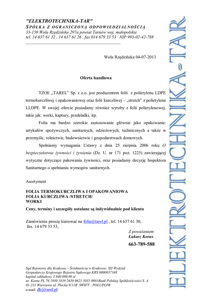 "ELEKTROTECHNIKA-TAR" SPÓŁKA Z OGRANICZONĄ ODPOWIEDZIALNOŚCIĄ 33-150 Wola Rzędzińska 297a powiat Tarnów woj. małopolskie tel. 14 637 61 32 , 14 637 61 26 , fax 014 679 33 53 NIP 993-02-42-788 Wola Rzędzińska 04-07-2013 Oferta handlowa TZOE „TAREL” Sp. z o.o. jest producentem folii z polietylenu LDPE termokurczliwej i opakowaniowej oraz folii kurczliwej – „stretch” z polietylenu LLDPE. W swojej ofercie posiadamy również wyroby z folii polietylenowej, takie jak: worki, kaptury, przekładki, itp. Folia ma bardzo szerokie zastosowanie głównie jako opakowanie: artykułów spożywczych, sanitarnych, odzieżowych, technicznych a także w przemyśle, rolnictwie, budownictwie i gospodarstwach domowych. Spełniamy wymagania Ustawy z dnia 25 sierpnia 2006 roku O bezpieczeństwie żywności i żywienia (Dz. U. nr 171 poz. 1225) zawierającej wytyczne dotyczące pakowania żywności, oraz posiadamy decyzję Inspektora Sanitarnego o spełnianiu wymogów sanitarnych. Asortyment FOLIA TERMOKURCZLIWA I OPAKOWANIOWA FOLIA KURCZLIWA /STRETCH/ WORKI Ceny, terminy i szczegóły ustalane są indywidualnie pod klienta Zamówienia proszę kierować na [email protected] , tel. 14 637 61 30, fax. 14 679 33 53, Z poważaniem Łukasz Korus 663-789-588 Sąd Rejonowy dla Krakowa – Śródmieścia w Krakowie, XII Wydział Gospodarczy Krajowego Rejestru Sądowego KRS 0000037348 kapitał zakładowy 3.940.000,00 zł nr. Konta PL 76 1930 1839 2650 0621 5035 0001Bank Polskiej Spółdzielczości S. A. 01-231 Warszawa ul. Płocka 9/11B SWIFT : POLUPLPR e-mail: [email protected]
