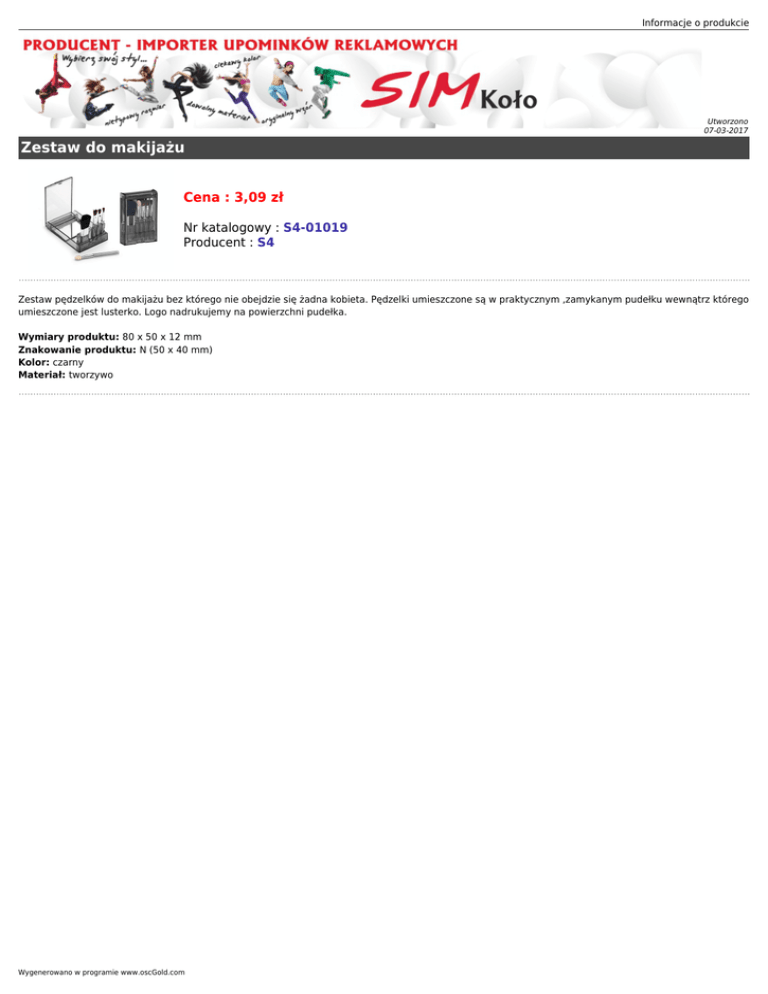 Informacje o produkcie Utworzono 07-03-2017 Zestaw do makijażu Cena : 3,09 zł Nr katalogowy : S4-01019 Producent : S4 Zestaw pędzelków do makijażu bez którego nie obejdzie się żadna kobieta. Pędzelki umieszczone są w praktycznym ,zamykanym pudełku wewnątrz którego umieszczone jest lusterko. Logo nadrukujemy na powierzchni pudełka. Wymiary produktu: 80 x 50 x 12 mm Znakowanie produktu: N (50 x 40 mm) Kolor: czarny Materiał: tworzywo Wygenerowano w programie www.oscGold.com