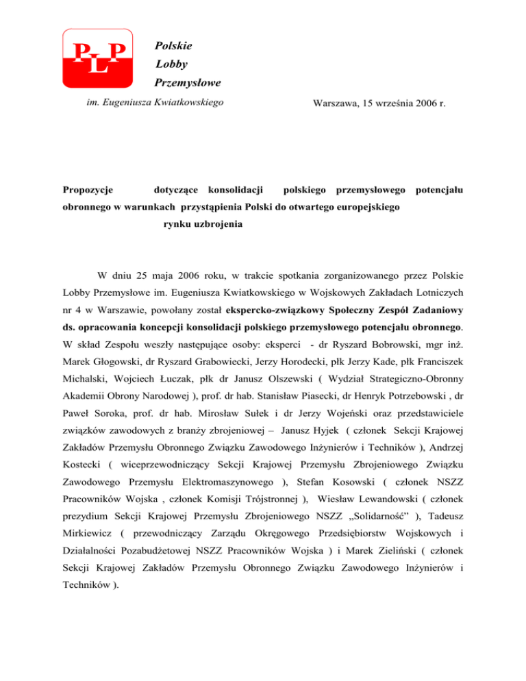 Polskie Lobby Przemysłowe im. Eugeniusza Kwiatkowskiego Propozycje dotyczące konsolidacji Warszawa, 15 września 2006 r. polskiego przemysłowego potencjału obronnego w warunkach przystąpienia Polski do otwartego europejskiego rynku uzbrojenia W dniu 25 maja 2006 roku, w trakcie spotkania zorganizowanego przez Polskie Lobby Przemysłowe im. Eugeniusza Kwiatkowskiego w Wojskowych Zakładach Lotniczych nr 4 w Warszawie, powołany został ekspercko-związkowy Społeczny Zespół Zadaniowy ds. opracowania koncepcji konsolidacji polskiego przemysłowego potencjału obronnego. W skład Zespołu weszły następujące osoby: eksperci - dr Ryszard Bobrowski, mgr inŜ. Marek Głogowski, dr Ryszard Grabowiecki, Jerzy Horodecki, płk Jerzy Kade, płk Franciszek Michalski, Wojciech Łuczak, płk dr Janusz Olszewski ( Wydział Strategiczno-Obronny Akademii Obrony Narodowej ), prof. dr hab. Stanisław Piasecki, dr Henryk Potrzebowski , dr Paweł Soroka, prof. dr hab. Mirosław Sułek i dr Jerzy Wojeński oraz przedstawiciele związków zawodowych z branŜy zbrojeniowej – Janusz Hyjek ( członek Sekcji Krajowej Zakładów Przemysłu Obronnego Związku Zawodowego InŜynierów i Techników ), Andrzej Kostecki ( wiceprzewodniczący Sekcji Krajowej Przemysłu Zbrojeniowego Związku Zawodowego Przemysłu Elektromaszynowego ), Stefan Kosowski ( członek NSZZ Pracowników Wojska , członek Komisji Trójstronnej ), Wiesław Lewandowski ( członek prezydium Sekcji Krajowej Przemysłu Zbrojeniowego NSZZ „Solidarność” ), Tadeusz Mirkiewicz ( przewodniczący Zarządu Okręgowego Przedsiębiorstw Wojskowych i Działalności PozabudŜetowej NSZZ Pracowników Wojska ) i Marek Zieliński ( członek Sekcji Krajowej Zakładów Przemysłu Obronnego Związku Zawodowego InŜynierów i Techników ). 2 Członkowie Społecznego Zespołu Zadaniowego uwaŜają, Ŝe stwierdzenie Podsekretarza Stanu w Ministerstwie Gospodarki Tomasza Wilczaka, iŜ struktura polskiego przemysłowego potencjału obronnego powinna się opierać na jednym duŜym koncernie zbrojeniowym o narodowym charakterze jest słuszna , wymaga jednak pewnych modyfikacji, odpowiednio do pojęcia „Spółka holdingowa” (Holding company). Koncentracja w przemyśle obronnym odpowiada bowiem zarówno tendencjom globalizacyjnym w przemyśle, jak i polskiej racji stanu. Poza tym jest niezbędna w sytuacji przyjęcia przez Polskę Kodeksu Postępowania i przystąpienia naszego kraju do otwartego europejskiego rynku uzbrojenia. Zatem omawiane propozycje Podsekretarza Stanu w Ministerstwie Gospodarki winny stać się punktem wyjścia dla pilnych rządowych działań formalno-organizacyjnych, wdraŜających omawianą koncepcję w Ŝycie. Powinny one jednak być poprzedzone analizą i oceną „Strategii przekształceń strukturalnych przemysłowego potencjału obronnego w latach 2002 – 2005”, która doprowadziła do konsolidacji polskiego przemysłu obronnego wokół dwóch grup: „Bumaru” i Agencji Rozwoju Przemysłu, nad którymi Skarb Państwa zachował efektywną kontrolę. Trzeba ocenić skutki wdraŜania tej „Strategii”, zarówno pozytywne, jak i jej słabości. Innymi słowy, chodzi w tym przypadku o swoisty „bilans zamknięcia”. Nie wszystkie bowiem przedsiębiorstwa, które znalazły się w obecnych dwóch wiodących grupach kapitałowych, odniosły wymierne korzyści z przynaleŜności do nich. Problem polega równieŜ na tym, aby samo tworzenie Spółki holdingowej nie przysłoniło aktualnych problemów i kłopotów polskich przedsiębiorstw obronnych i jednostek badawczo - rozwojowych, które naleŜy rozwiązywać na bieŜąco. NaleŜy takŜe uwzględnić rekomendacje wynikające ze Strategicznego Przeglądu Obronnego, dotyczące gospodarki obronnej i polskiego systemu obronnego. NaleŜy podkreślić, Ŝe polski przemysł wyrobów złoŜonych technologicznie, wysoce nasyconych wiedzą, poza częścią przemysłu obronnego, stanowiącego jeszcze własność Skarbu Państwa, praktycznie został juŜ wykupiony przez kapitał zagraniczny działający w Polsce. Stało się tak w procesie denacjonalizacji prywatyzacyjnej przemysłu polskiego po roku 1999. ( pod koniec 2004 r. kapitał podstawowy całości krajowego przemysłu przetwórczego w 47,5% stanowił własność kapitału zagranicznego.) Z tej przyczyny potencjał przemysłu obronnego, stanowiący obecnie własność Skarbu Państwa, powinien być szczególnie chroniony oraz pełnić równieŜ funkcje promujące rozwój 3 całego polskiego przemysłu przetwórczego (co naleŜy uwzględnić, wprowadzając zmiany w strukturze polskiego przemysłowego potencjału obronnego). Stąd zmiany strukturalne w polskim przemyśle obronnym powinny: - umoŜliwić rządowi RP samodzielność decyzji w dziedzinie rozwoju krajowego przemysłu obronnego, - unowocześnić i umocnić kondycję ekonomiczną przemysłu obronnego oraz jego konkurencyjność, - doprowadzić do stworzenia partnerskich warunków we współpracy z przemysłami obronnymi państw naleŜących do NATO – dzięki koncentracji potencjału naukowobadawczego, potencjału produkcyjnego oraz kapitału przedsiębiorstw, a takŜe poprzez łatwiejszą dostępność do taniego kredytowania obrotowo-inwestycyjnego przedsiębiorstw, - zmiany strukturalne w przemyśle obronnym powinny teŜ stać się źródłem dyfuzji postępu naukowo-technicznego w całym polskim przemyśle, poniewaŜ stanowi on obecnie jedyne zgrupowanie polskiego przemysłu zdolne do pełnienia tej funkcji. W ocenie Społecznego Zespołu Zadaniowego najbardziej racjonalną transformacją w strukturze potencjału przemysłu obronnego byłoby powołanie Spółki holdingowej „Polski Przemysł Obronny”( nazwa robocza ), która ściśle by współdziałała z Urzędem ds. Uzbrojenia. Powinna ona być odpowiedzialna za: - jednolitą strategię rozwoju przemysłu obronnego, - rozwój badań oraz inwestycji w przemyśle obronnym i jednostkach badawczorozwojowych, - koordy