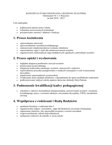 KONCEPCJA FUNKCJONOWANIA I ROZWOJU PLACÓWKI Gimnazjum Nr 1 w Raszynie na lata 2010 - 2015 Cele nadrzędne: • • • podnoszenie jakości pracy szkoły wdrażanie nowoczesnych technologii poszanowanie wartości i dbałość o tradycje 1. Proces kształcenia • • • • • wprowadzanie innowacji upowszechnienie oceniania kształtującego zainicjowanie międzynarodowej wymiany młodzieży wprowadzenie zajęć z etyki dla zainteresowanych uczniów organizowanie różnorodnych zajęć dodatkowych zgodnych z potrzebami uczniów 2. Proces opieki i wychowania • • • • • • • dogłębna diagnoza problemów nowych uczniów promowania ucznia dobrego integracja środowiska szkolnego: uczniów, nauczycieli i rodziców wprowadzenie procedur postępowania w trudnych sytuacjach w celu wzmocnienia dyscypliny poprawienie samorządności uczniowskiej zwiększenie ilości spotkań młodzieży z specjalistami do spraw profilaktyki uzależnień podtrzymywanie tradycji szkoły poprzez doroczne obchody Dnia Patrona 3. Podnoszenie kwalifikacji kadry pedagogicznej • szkolenia z zakresu: komunikacji interpersonalnej, motywowania uczniów, oceniania kształtującego, pracy z uczniem zdolnym, utrzymania dyscypliny, EWD, zarządzania oświatą 4. Współpraca z rodzicami i Radą Rodziców • • • • • spotkania Dyrekcji z rodzicami klas I organizowanie imprez, warsztatów, zajęć dla Rodziców na terenie Gimnazjum zapraszanie rodziców, aby opowiadali uczniom o swoich zawodach rozpowszechnienie zebrań indywidualnych zachęcanie rodziców do udziału w życiu szkoły 5. Promocja Współpraca ze środowiskiem lokalnym oraz instytucjami i organizacjami wspierającymi szkołę: • • • • • • nawiązanie lub pogłębienie współpracy z innymi placówkami oświatowymi w gminie i poza nią kontakty z innymi gimnazjami im. Prymasa Tysiąclecia (28 maja 2012) przedstawienie logo i hasła naszego Gimnazjum odnowienie tradycji Zjazdu Absolwentów organizowanie imprez otwartych dla mieszkańców gminy powołanie do życia stowarzyszenia skupiającego przyjaciół Gimnazjum 6. Rozwój bazy szkoły • • • • • zakup tablic interaktywnych, laptopów i rzutników stworzenie laboratorium językowego i pracowni komputerowej do nauczania różnych przedmiotów wzbogacenie sal gimnastycznych stworzenie auli widowiskowej rozbudowanie monitoringu szkoły