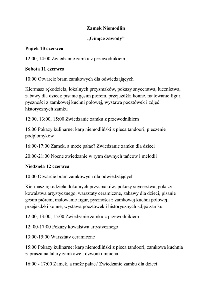 Zamek Niemodlin „Ginące zawody” Piątek 10 czerwca 12:00, 14:00 Zwiedzanie zamku z przewodnikiem Sobota 11 czerwca 10:00 Otwarcie bram zamkowych dla odwiedzających Kiermasz rękodzieła, lokalnych przysmaków, pokazy snycerstwa, łucznictwa, zabawy dla dzieci: pisanie gęsim piórem, przejażdżki konne, malowanie figur, pyszności z zamkowej kuchni polowej, wystawa pocztówek i zdjęć historycznych zamku 12:00, 13:00, 15:00 Zwiedzanie zamku z przewodnikiem 15:00 Pokazy kulinarne: karp niemodliński z pieca tandoori, pieczenie podpłomyków 16:00-17:00 Zamek, a może pałac? Zwiedzanie zamku dla dzieci 20:00-21:00 Nocne zwiedzanie w rytm dawnych tańców i melodii Niedziela 12 czerwca 10:00 Otwarcie bram zamkowych dla odwiedzających Kiermasz rękodzieła, lokalnych przysmaków, pokazy snycerstwa, pokazy kowalstwa artystycznego, warsztaty ceramiczne, zabawy dla dzieci, pisanie gęsim piórem, malowanie figur, pyszności z zamkowej kuchni polowej, przejażdżki konne, wystawa pocztówek i historycznych zdjęć zamku 12:00, 13:00, 15:00 Zwiedzanie zamku z przewodnikiem 12: 00-17:00 Pokazy kowalstwa artystycznego 13:00-15:00 Warsztaty ceramiczne 15:00 Pokazy kulinarne: karp niemodliński z pieca tandoori, zamkowa kuchnia zaprasza na talary zamkowe i dzwonki mnicha 16:00 - 17:00 Zamek, a może pałac? Zwiedzanie zamku dla dzieci Informacje i rezerwacje pod nr. tel. +48608090840, www.niemodlinzamek.pl